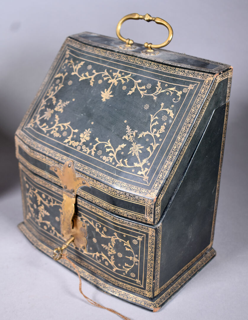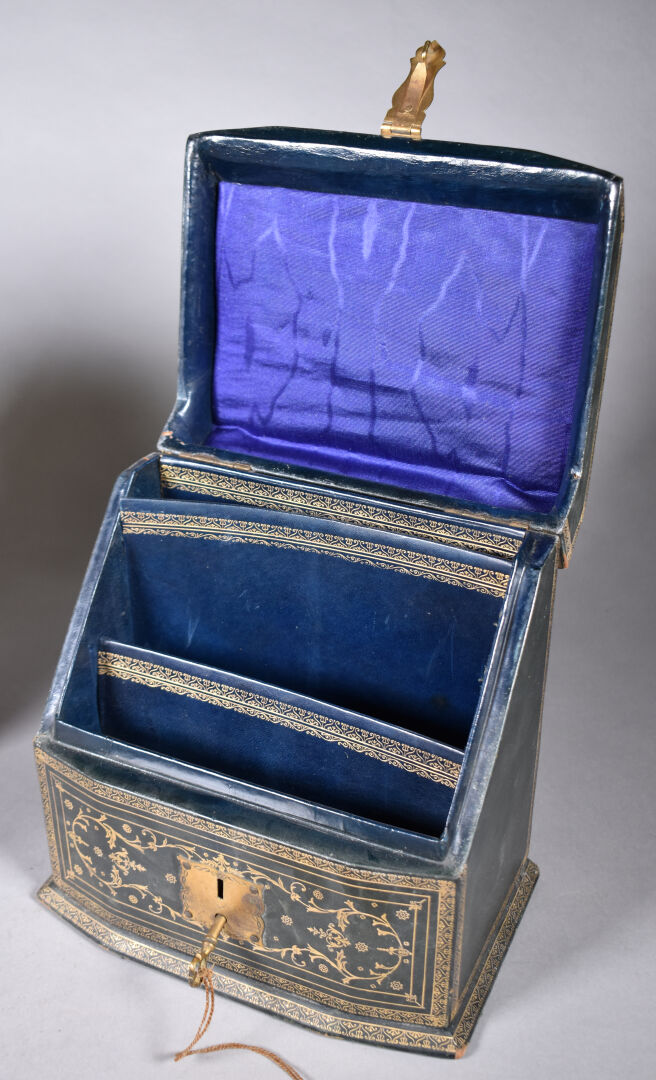 Ensemble soit une composition en verre signé Loire, une paire de bougeoirs en laiton, un coffret en bois exotique et une boîte à courrier gainé de cuir bleu doré aux petits fer.