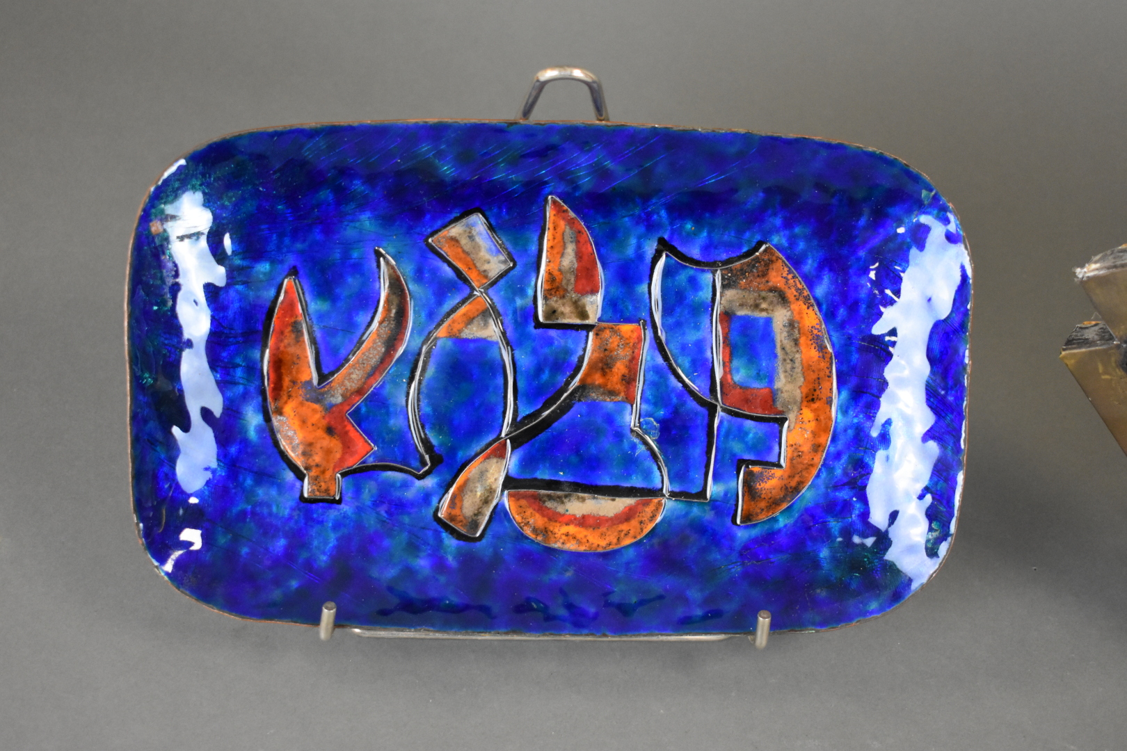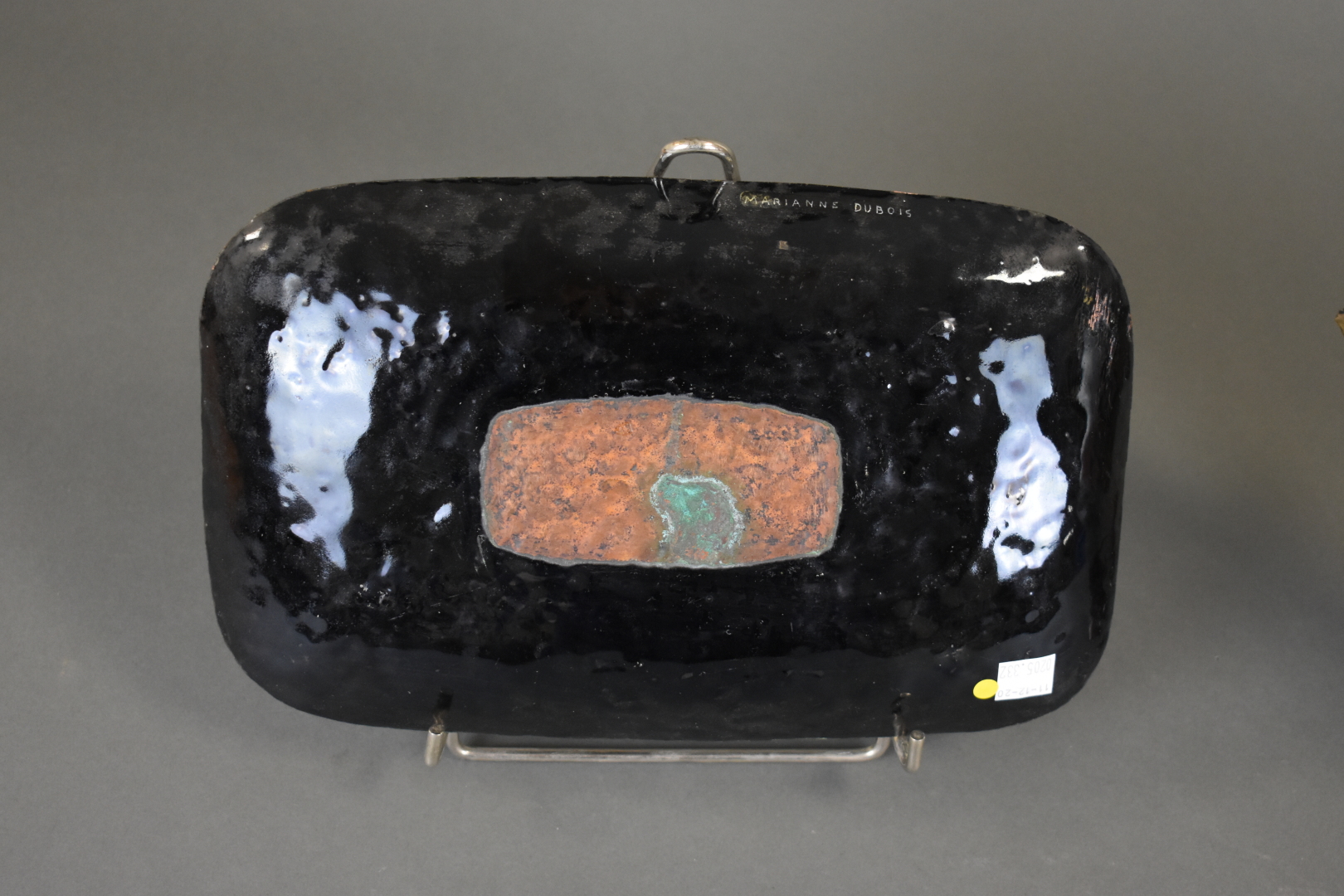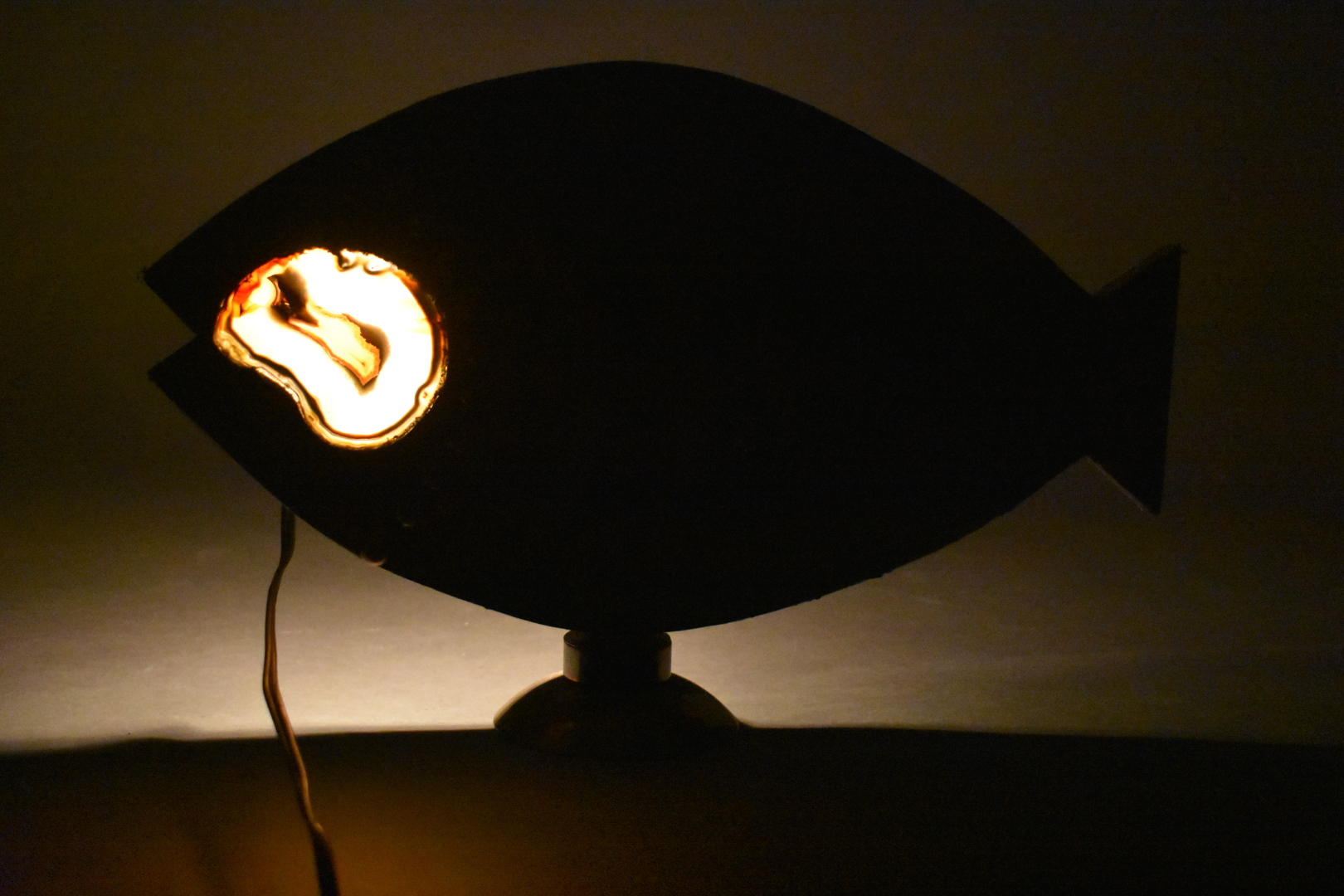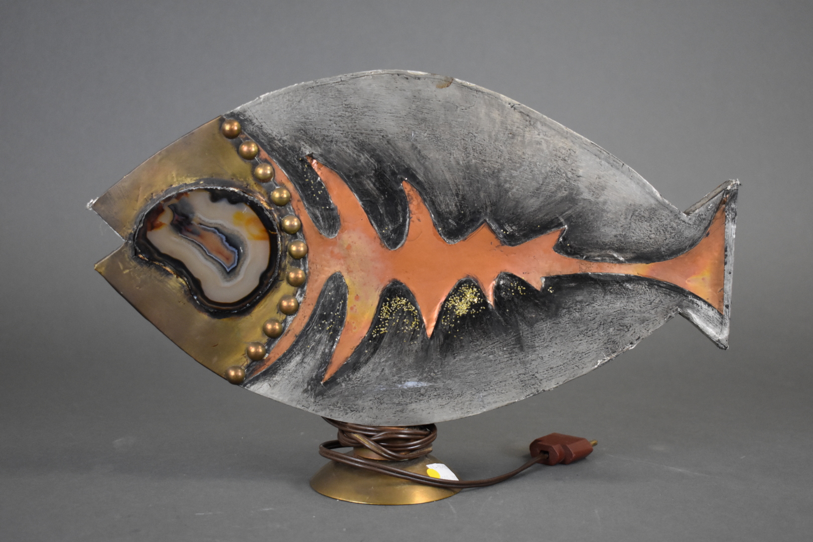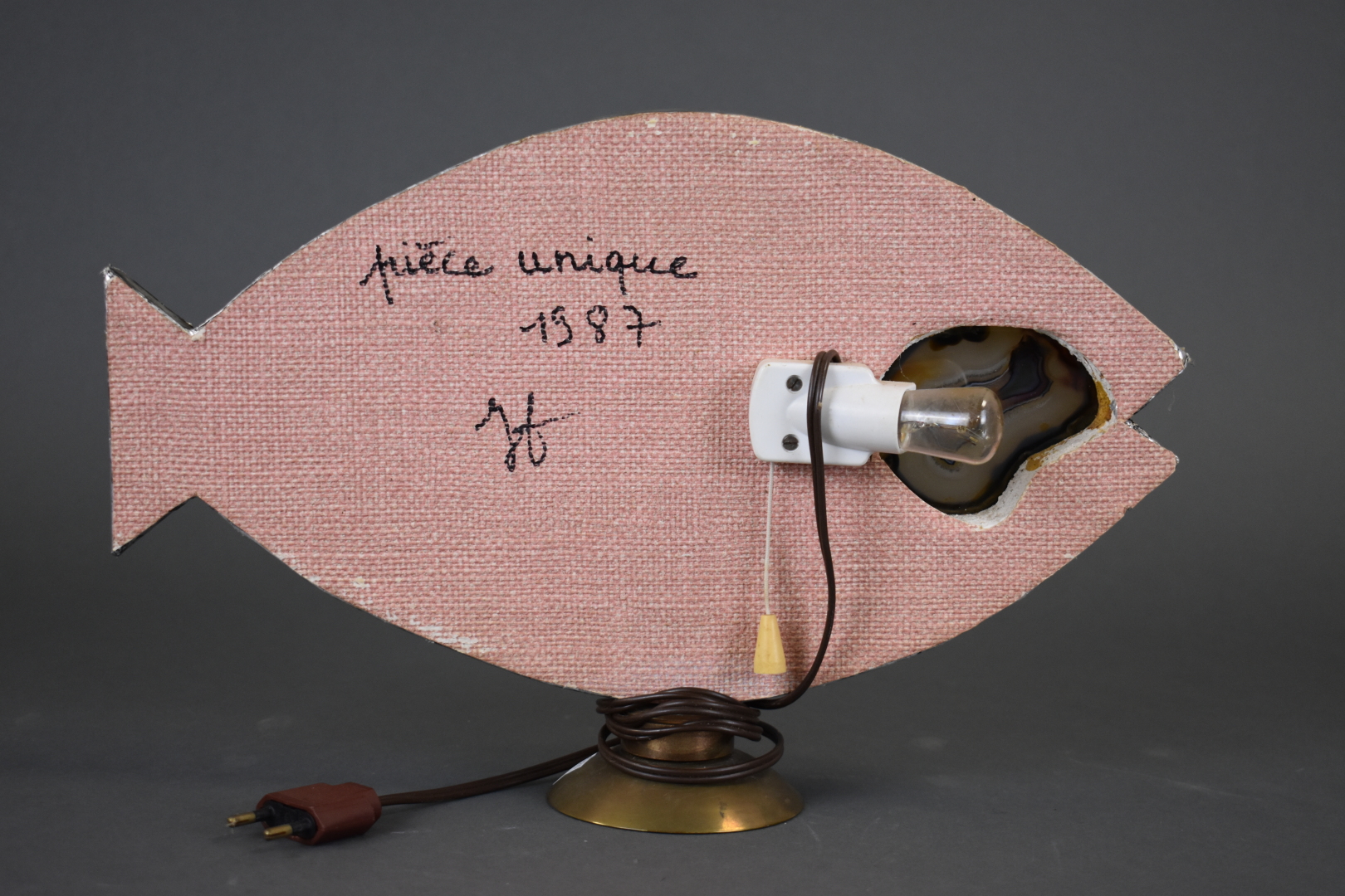 Ensemble soit une lampe poisson en bois et résine, et une coupe en métal émaillée signée Marianne DUBOIS. Seconde moitié du XXe siècle. Haut. lampe : 24,5 cm.