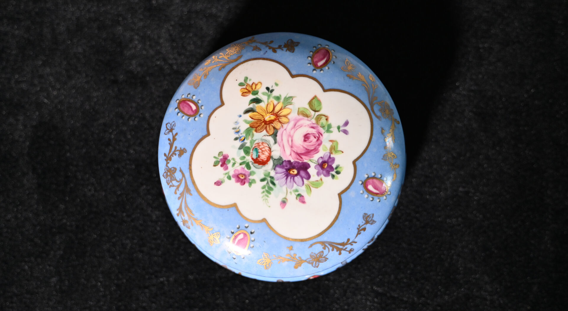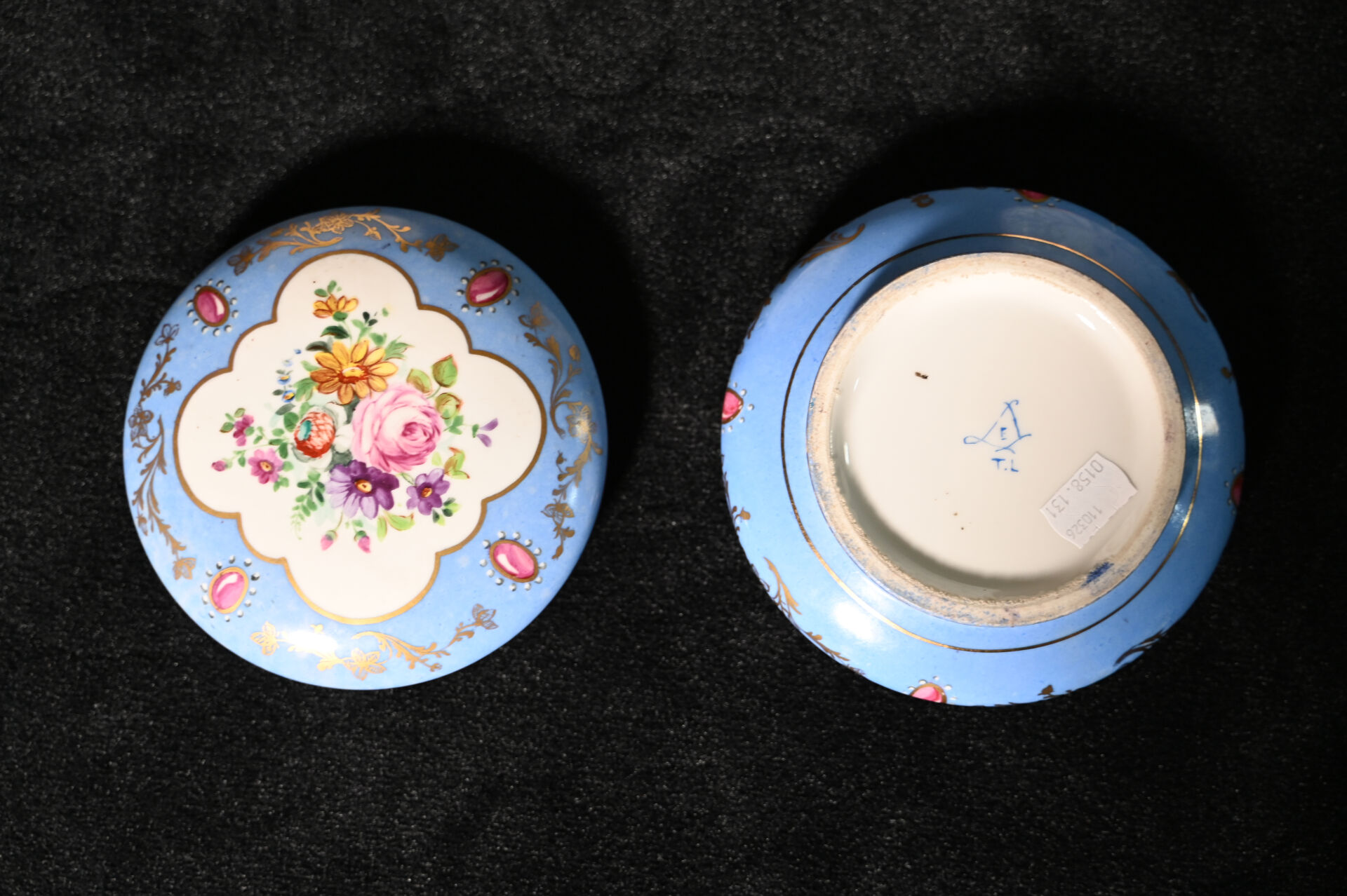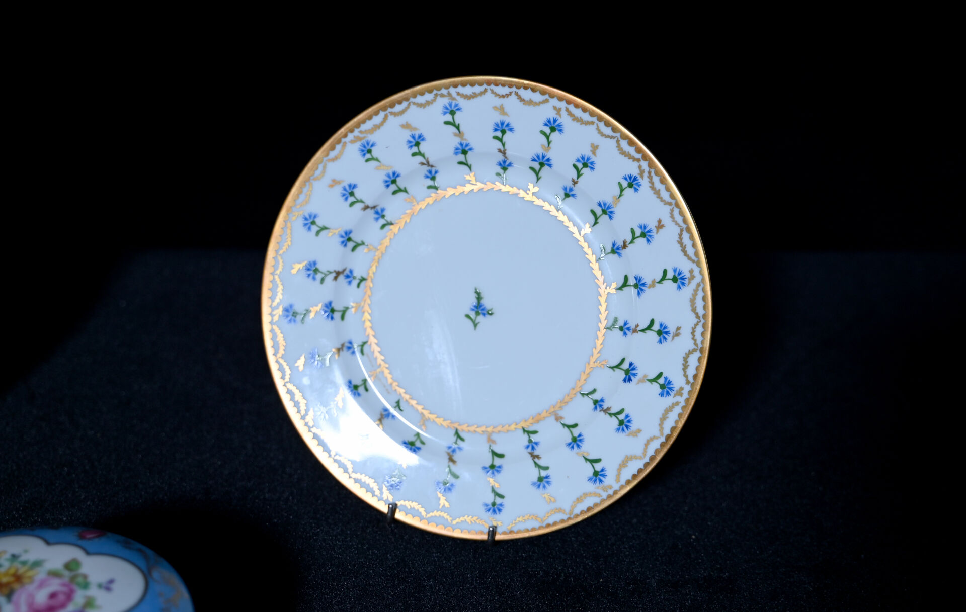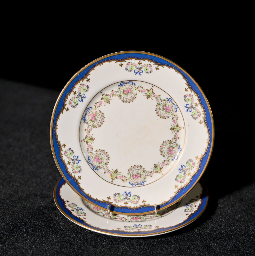 Ensemble soit une paire d’assiettes THE ROTHSCHILD COLLECTION, une assiette à décor de bleuets en porcelaine de Limoges et une bonbonnière en porcelaine de Sèvres (usures et petits éclats).