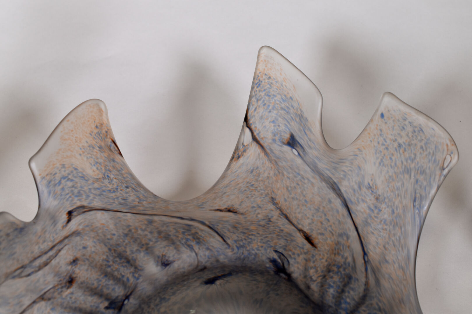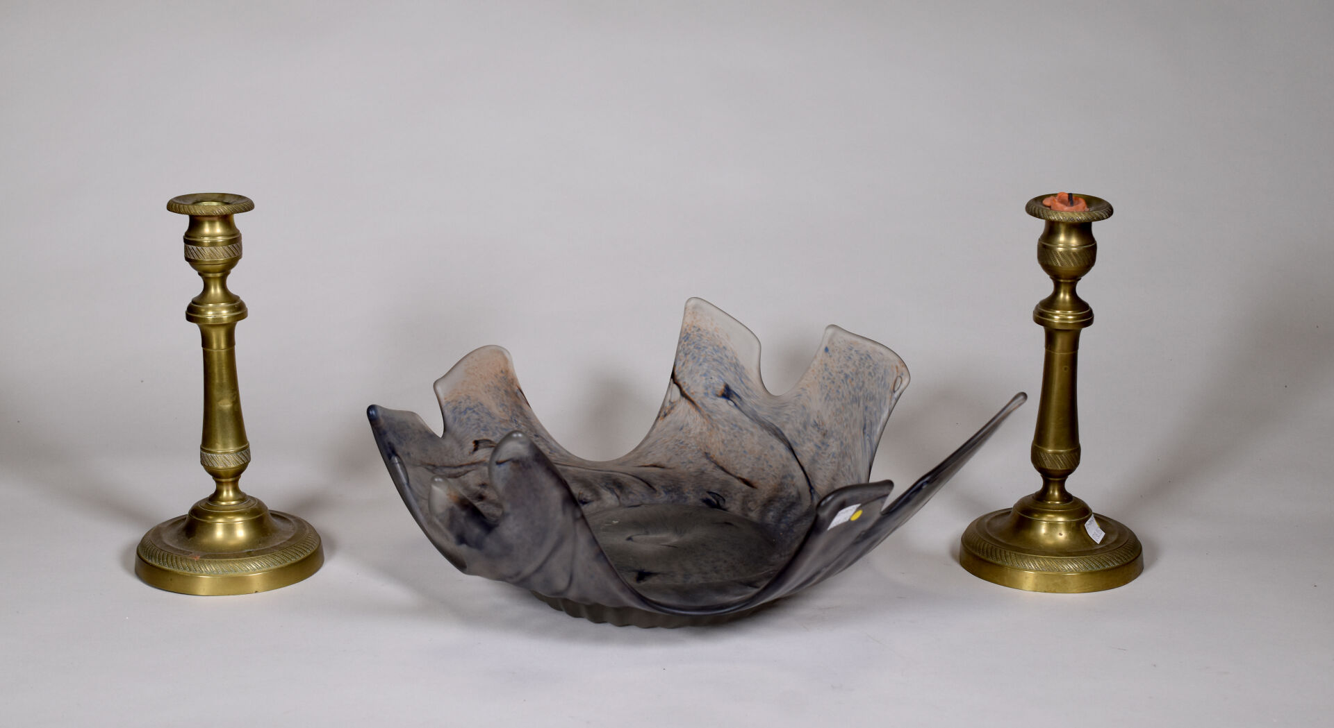 Ensemble soit une paire de bougeoirs en cuivre (un tordu), (haut. : 26 cm) et une coupe en verre à pointes à décor en mauve et bleu (Haut. : 15 cm – Diam. : 45cm).