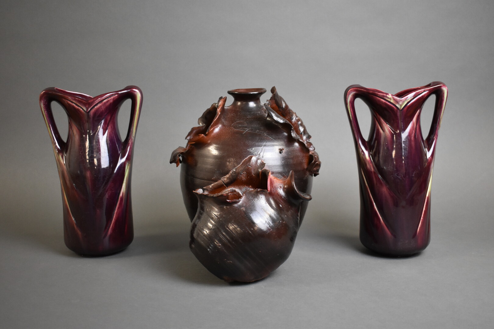 Ensemble soit une paire de vases bouteille en barbotine émaillée bordeaux, marqué au papillon au dessous, vers 1900 et un pot en terre cuite représentant deux jarres éclatées (éclats). Haut. de la paire de vases : 27,5 cm.