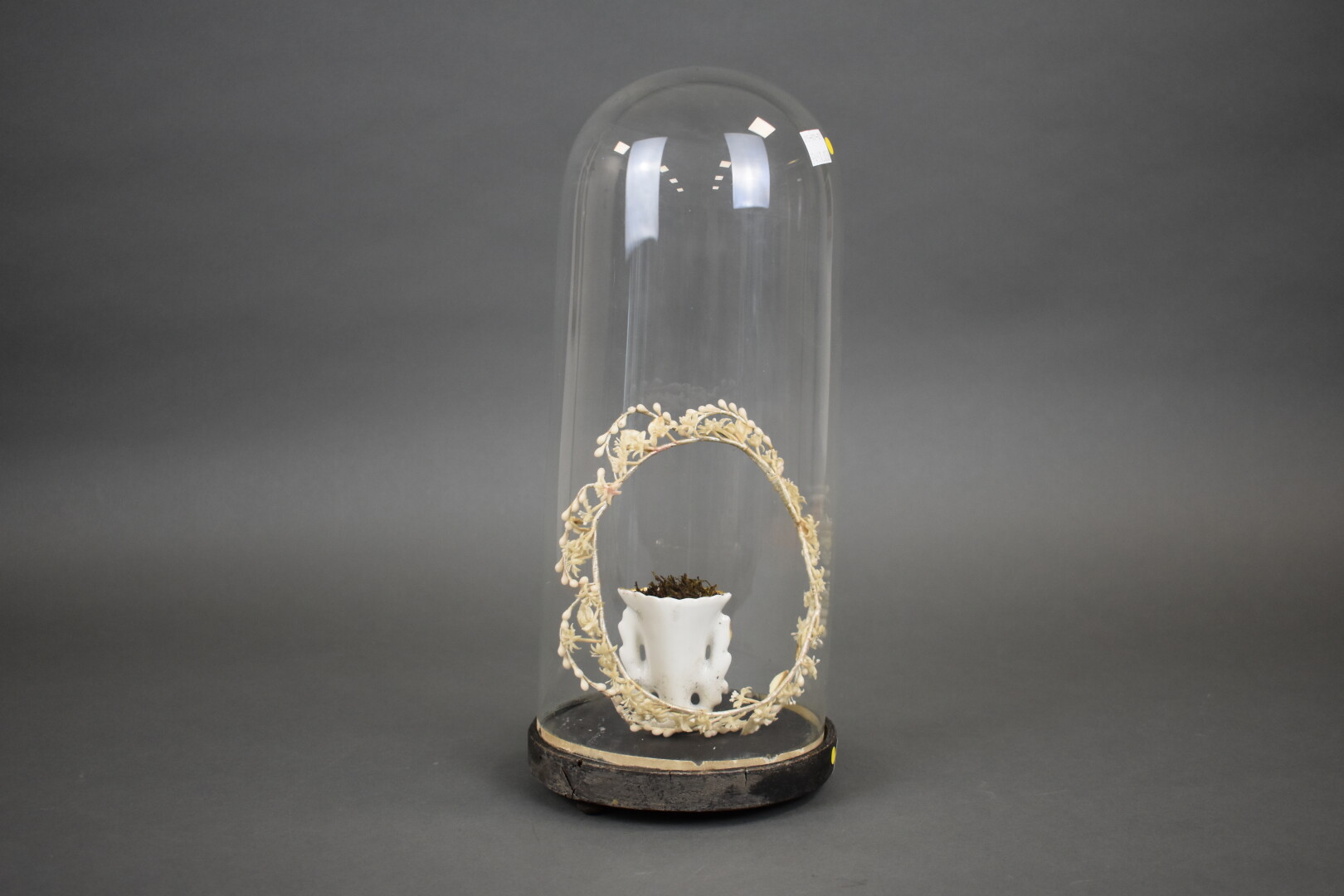 Ensemble vase de mariée et globe avec socle de bois noirci. Fin du XIXe siècle. Haut. : 36 cm.
