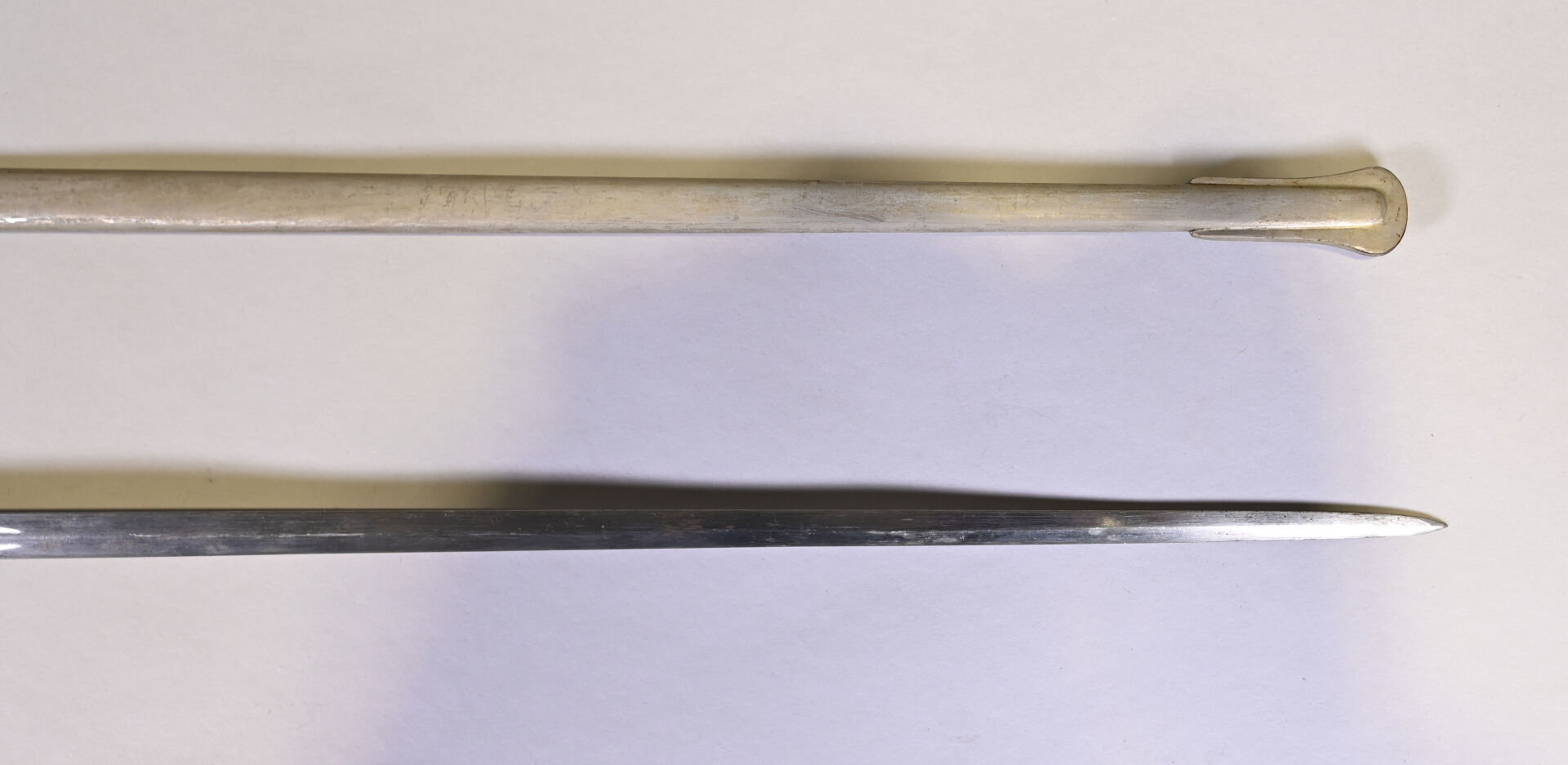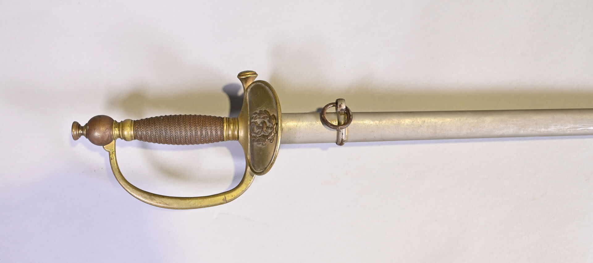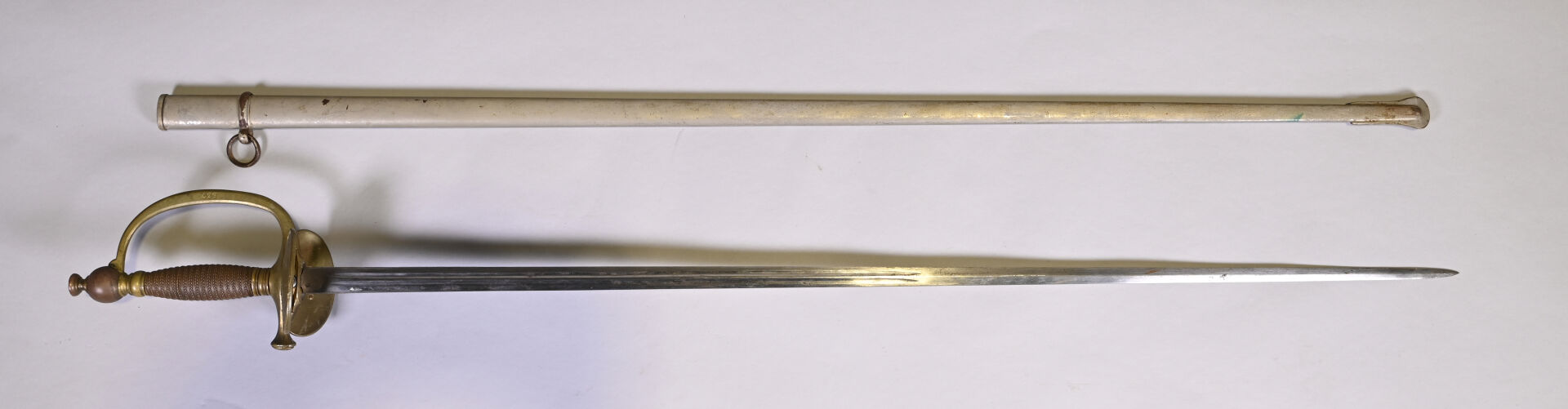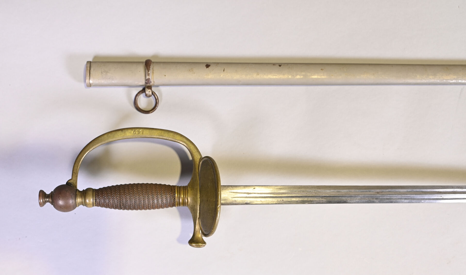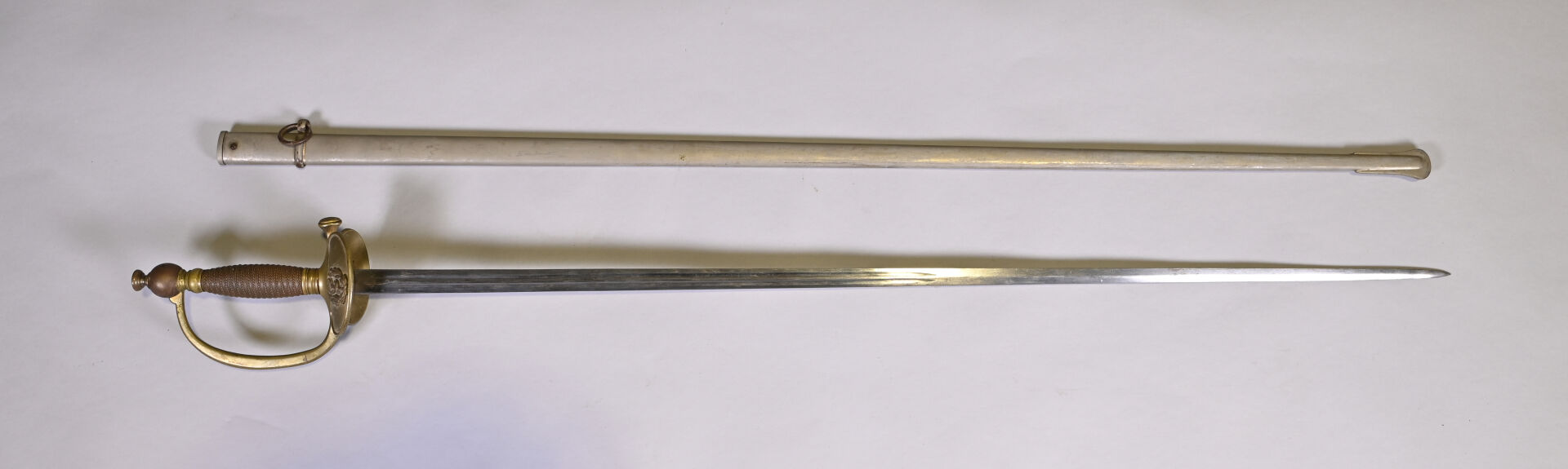 Épée à clavier du corps de Santé. Lame droite à quatre pans et deux fines gorges, vierges de marquage. Monture en bronze. Plateau principal au caducée et au serpent. Plateau secondaire repliable. Arme montée bronze. Pommeau rond à écrou de rivure proéminente. Garde de branche unique. Fusée filigranée. Dans son fourreau en tôle d’acier à un bracelet peint en gris. État 1.