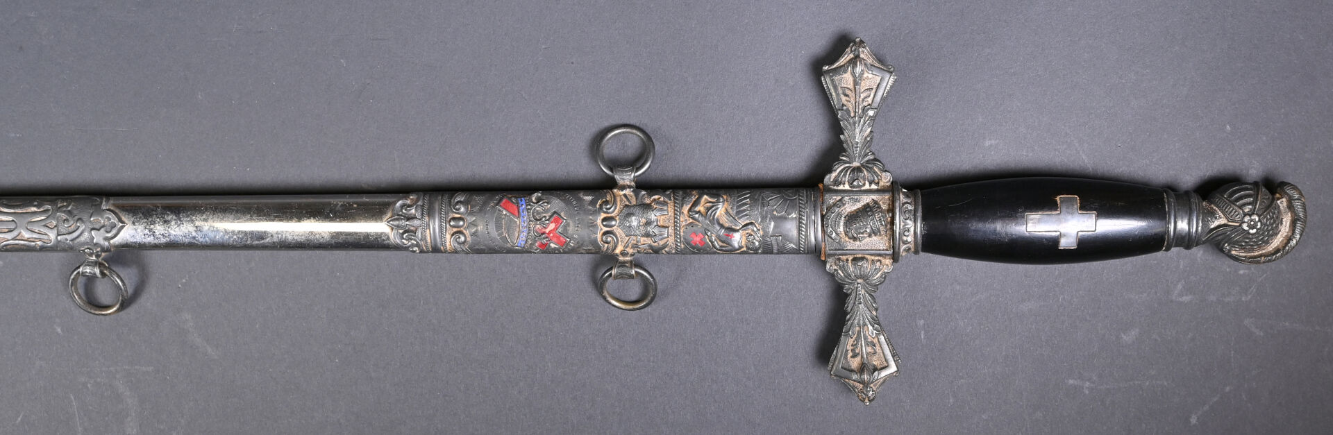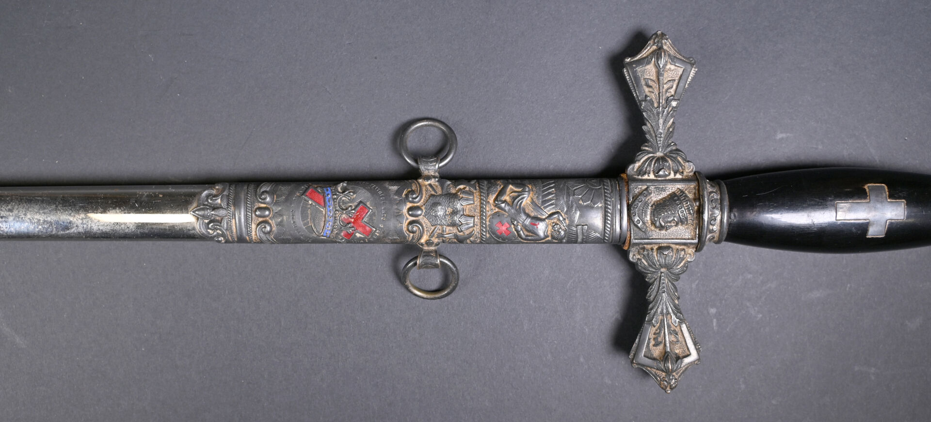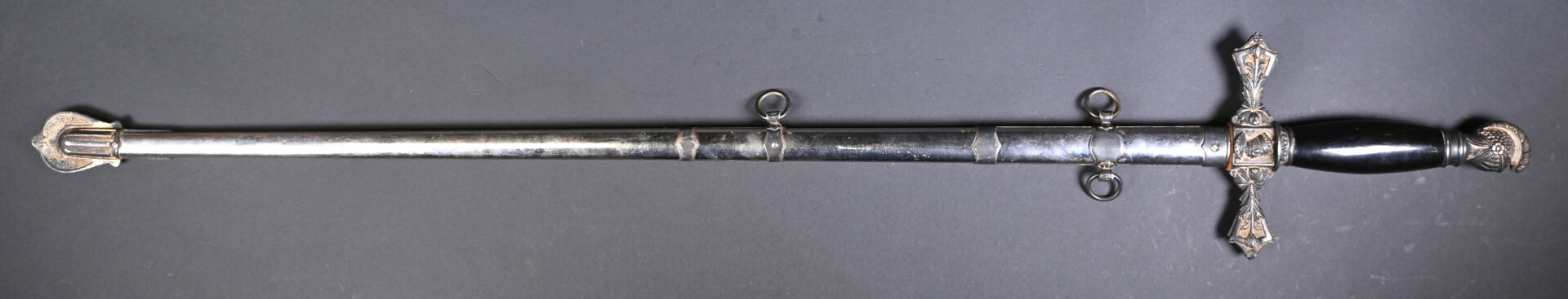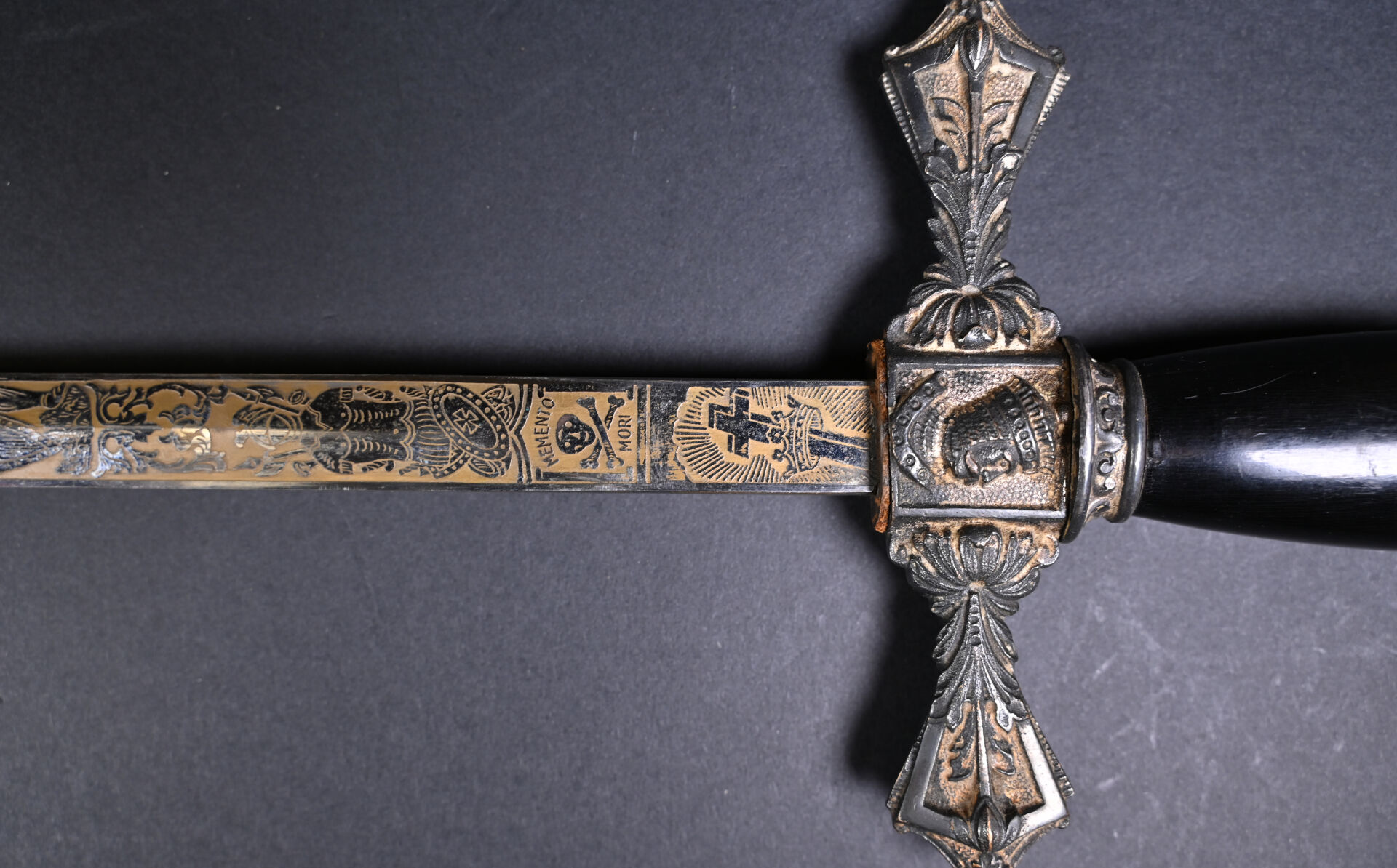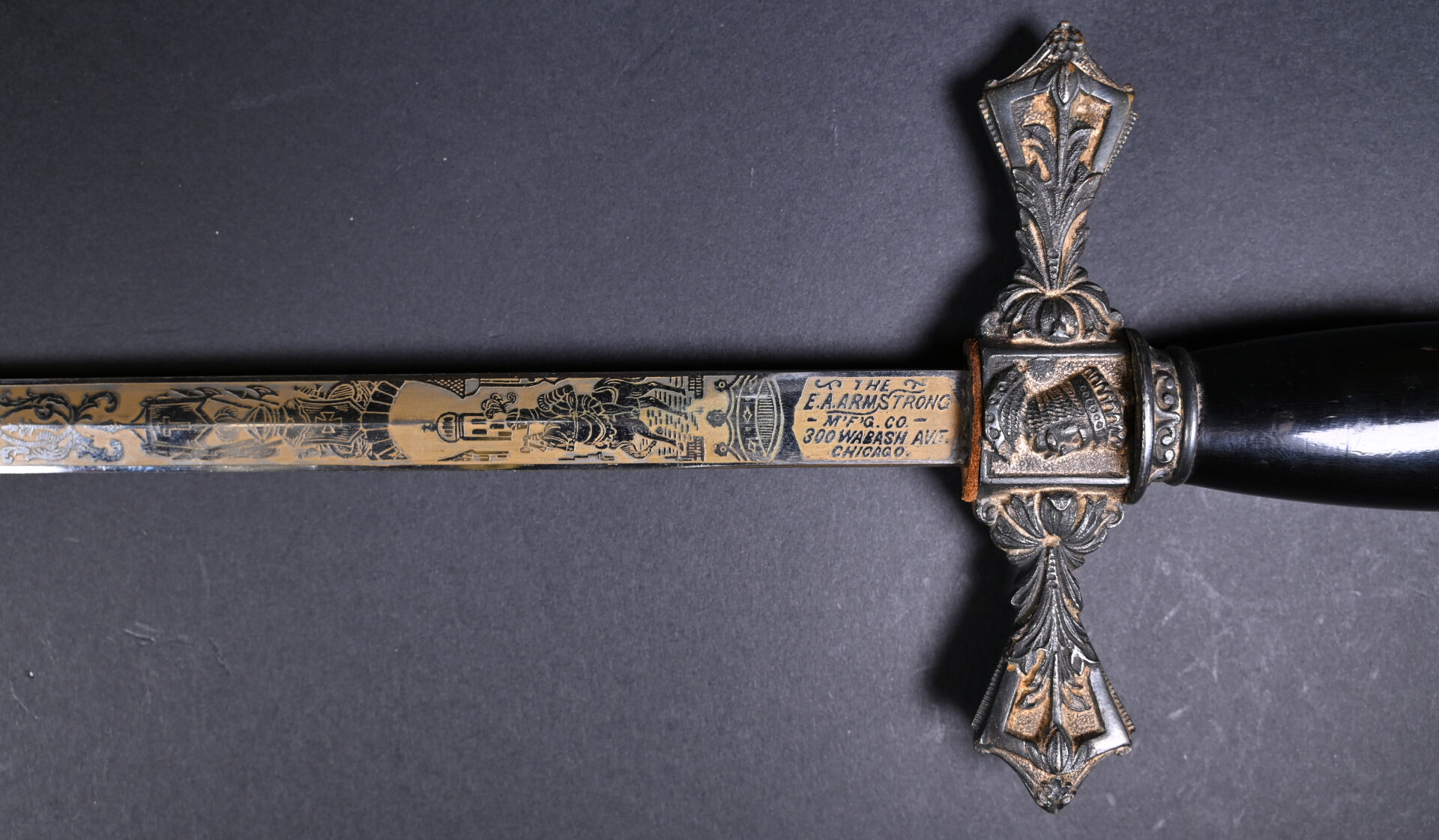 Épée de cérémonie franc-maçon. Lame droite à quatre pans, enrichie de gravures à l’acide figurant des chevaliers. Fond doré. Signature du fabricant : « The E.A. Armstrong – M’F’G.CO 300 Wabash Ave. Chicago. ». Pommeau au casque en panaché. Fusée noire dans son fourreau en tôle d’acier, richement décoré de symboles allégoriques. P