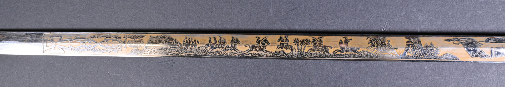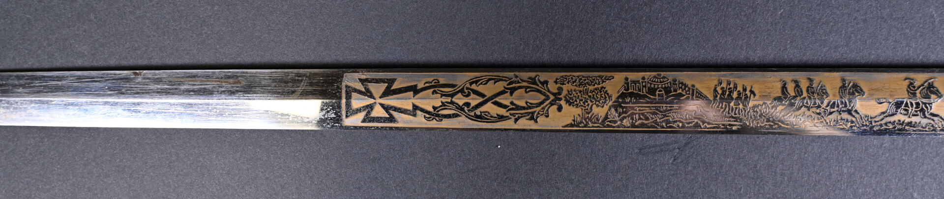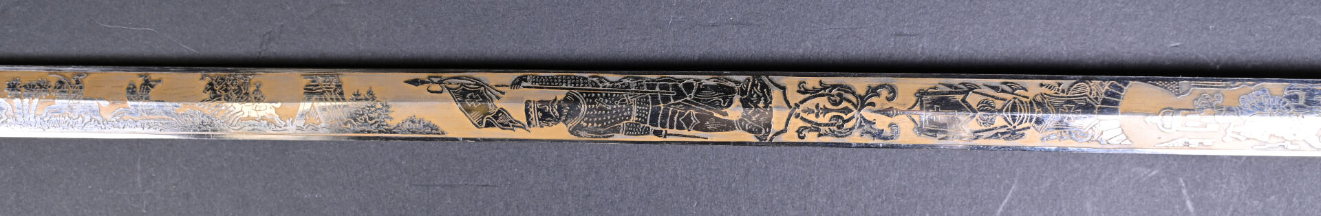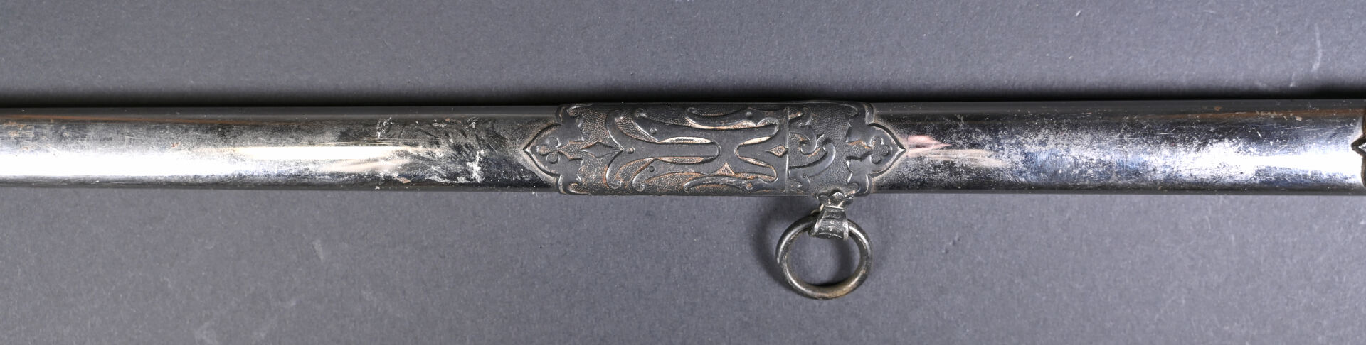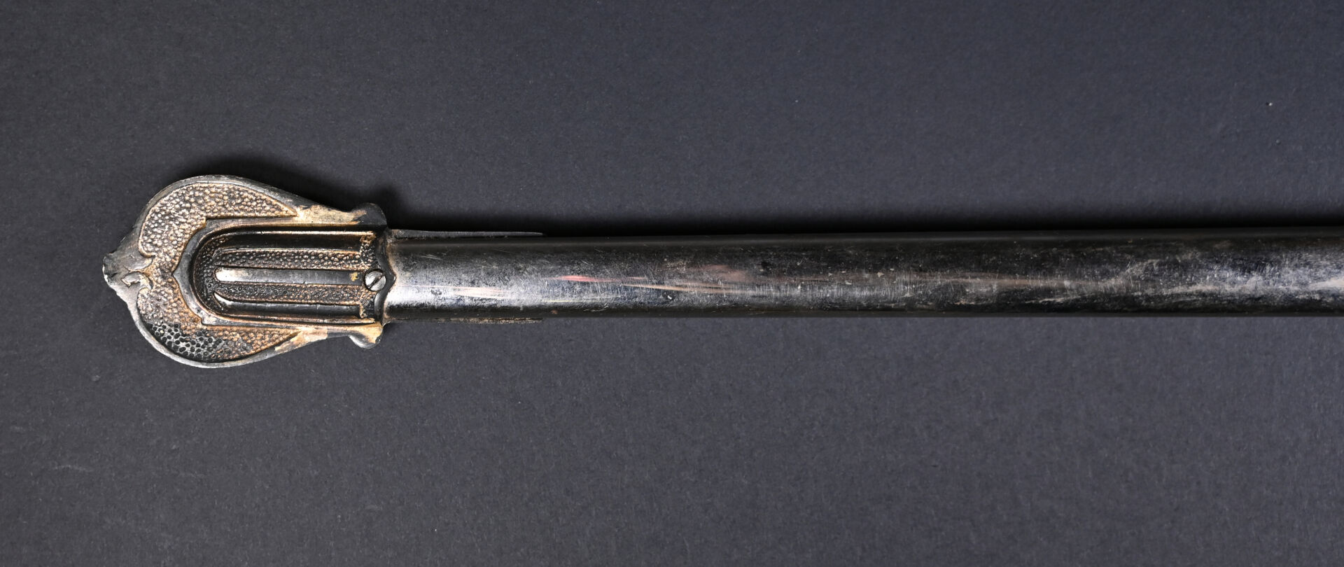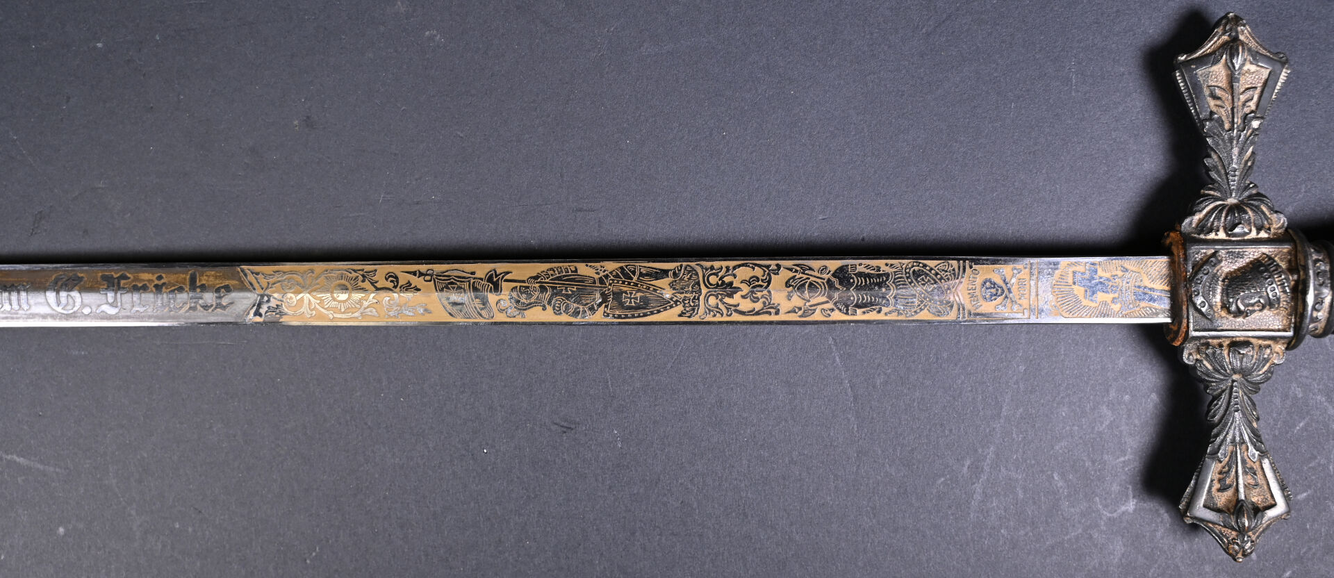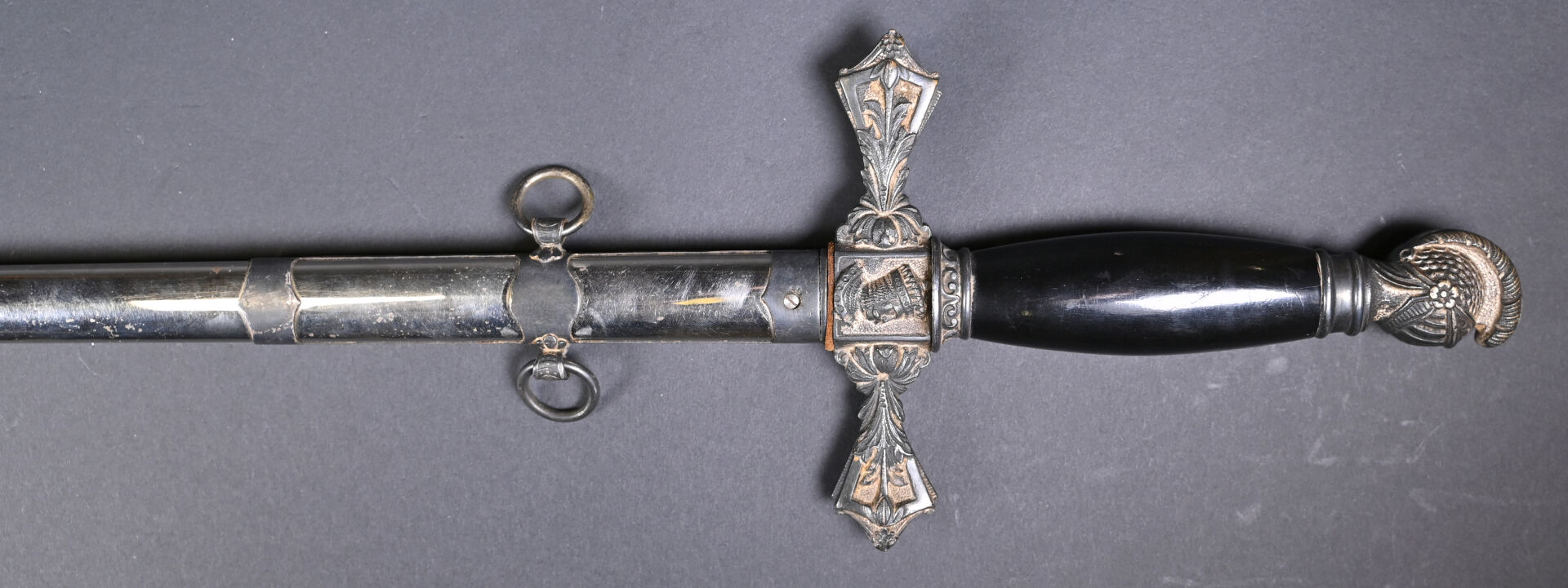 Épée de cérémonie franc-maçon. Lame droite à quatre pans, enrichie de gravures à l’acide figurant des chevaliers. Fond doré. Signature du fabricant : « The E.A. Armstrong – M’F’G.CO 300 Wabash Ave. Chicago. ». Pommeau au casque en panaché. Fusée noire dans son fourreau en tôle d’acier, richement décoré de symboles allégoriques. P