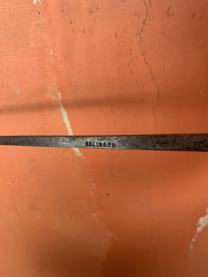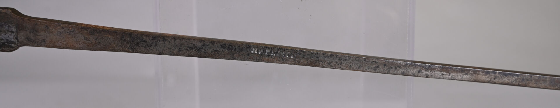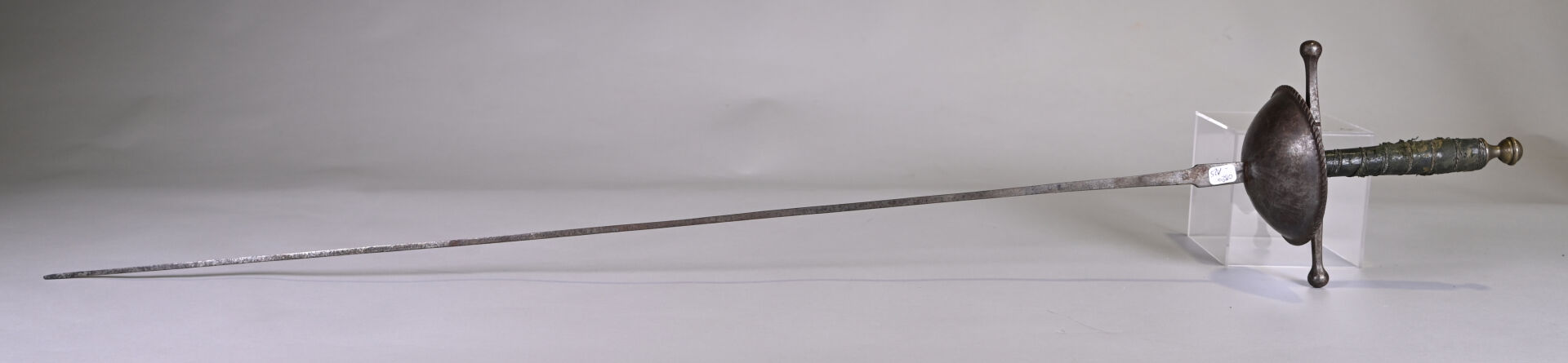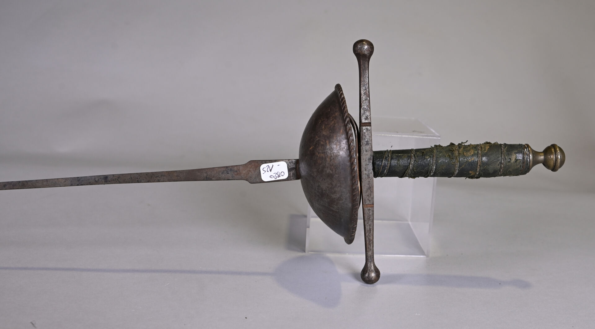 Épée d’escrime dans le goût d’une rapière à la Taza. Fine lame droite à quatre pans. Coquille hémisphérique. Pas de fourreau. État 2.