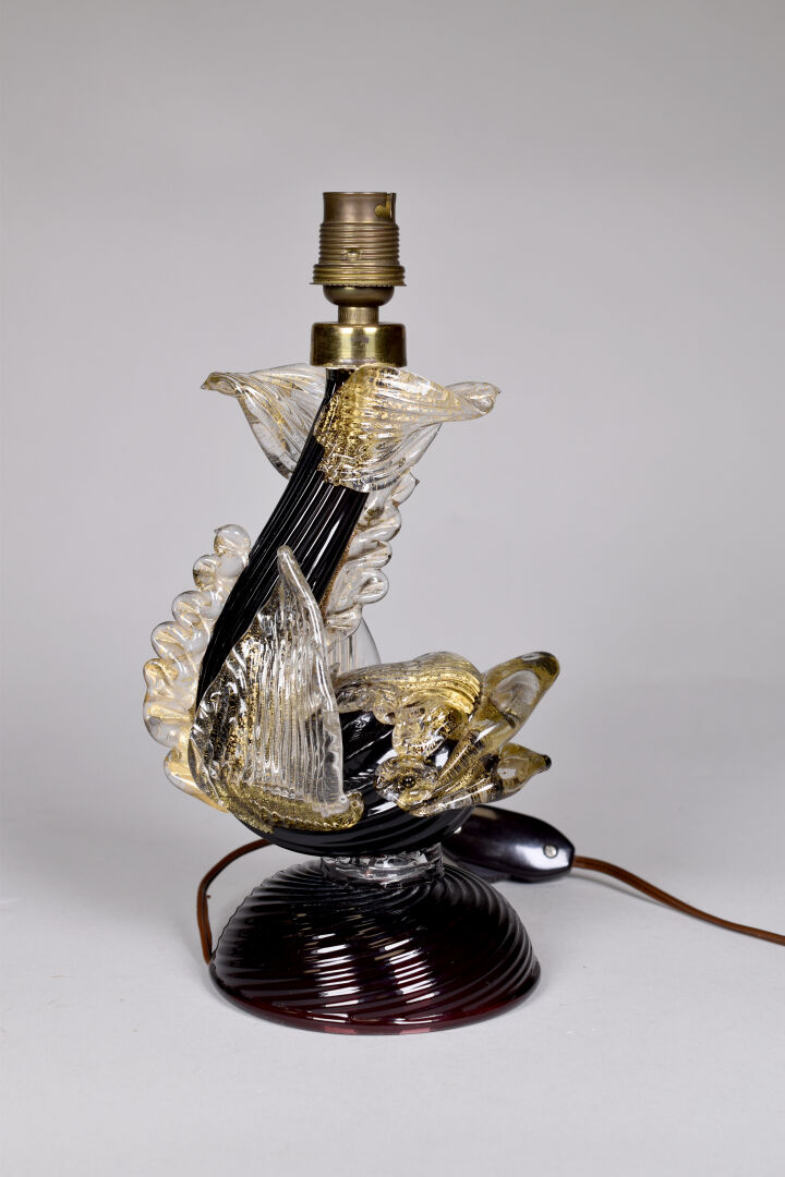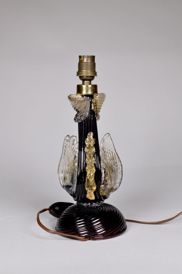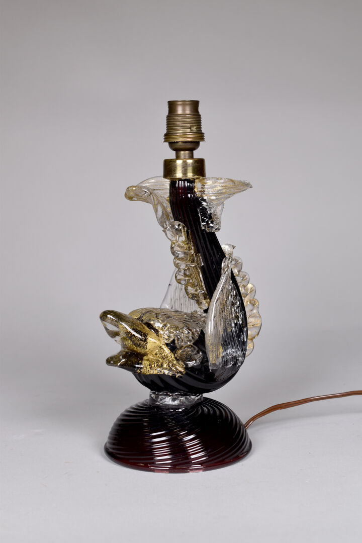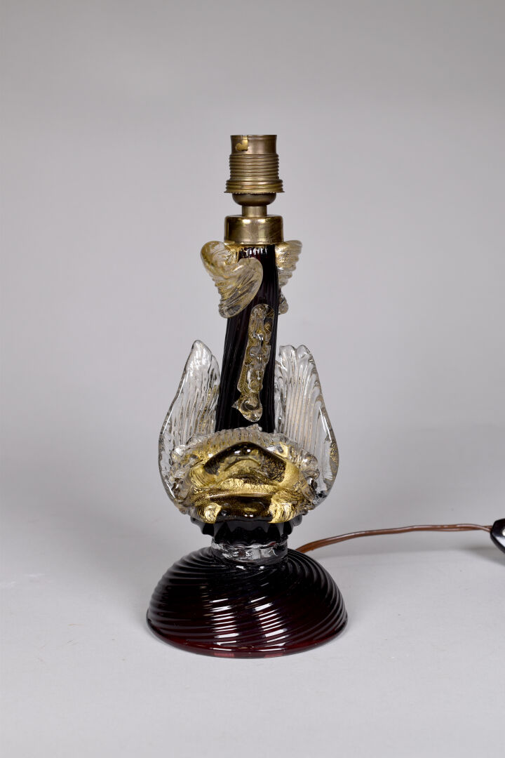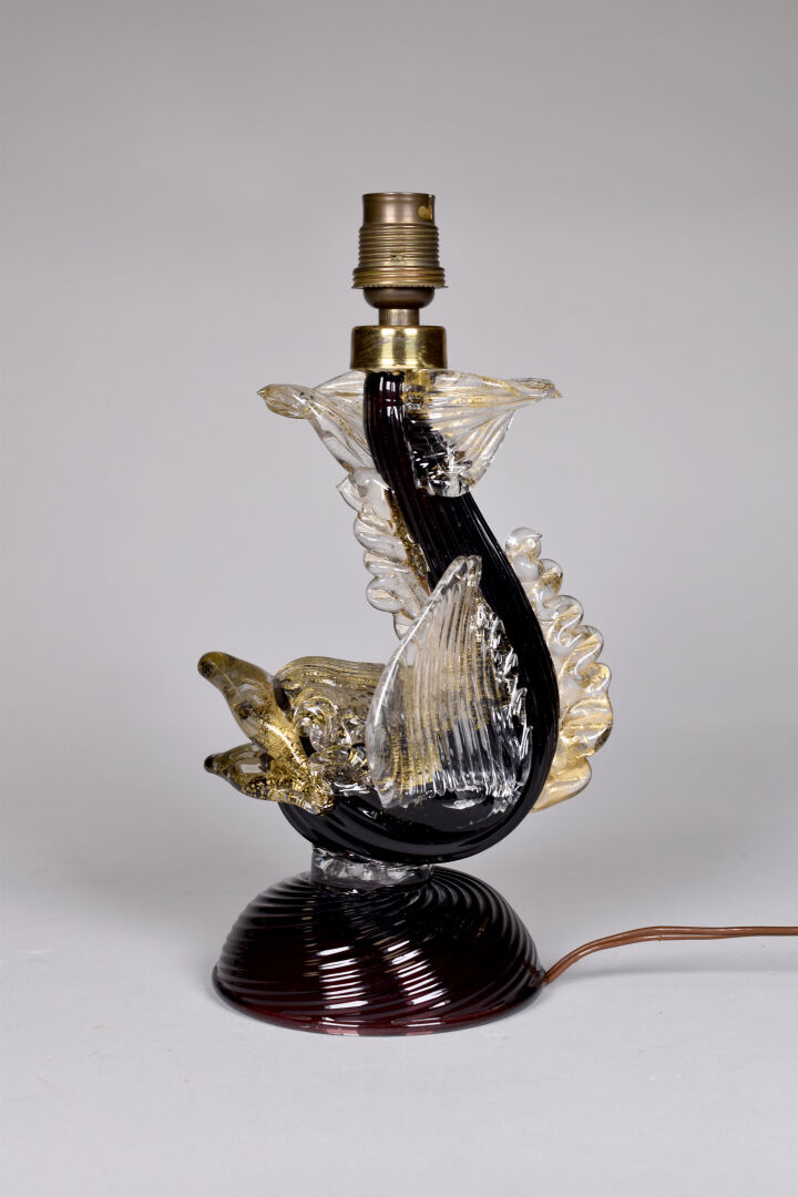 Ercole BAROVIER (1889-1974). Pied de lampe en verre mauve et paillons or figurant un dauphin. Haut. : 26,5 cm avec douille.