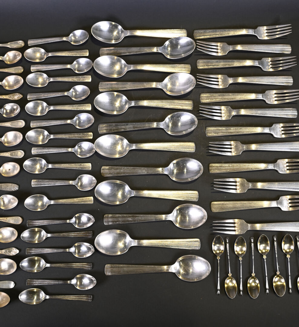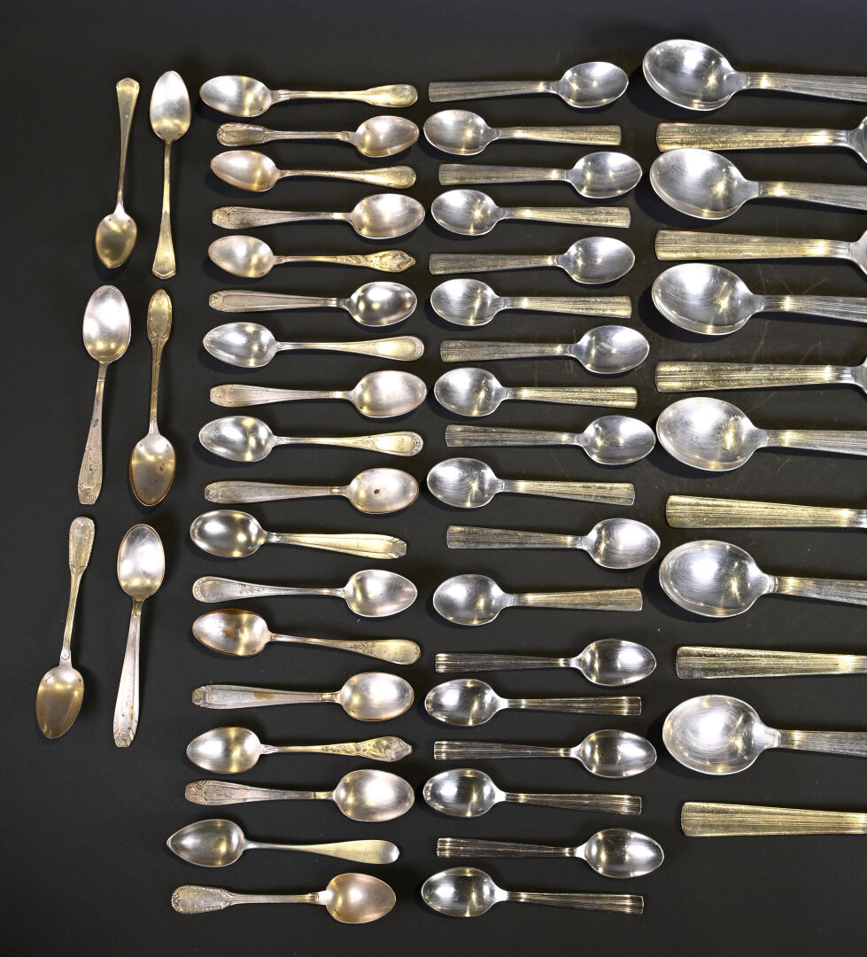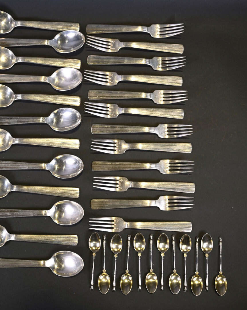 ERCUIS. Partie de ménagère en métal argenté, comprenant 12 grands couverts et 12 petites cuillères. Vers 1930. Marqués. On joint un lot de petites cuillères d’orfèvres et de modèles différents.