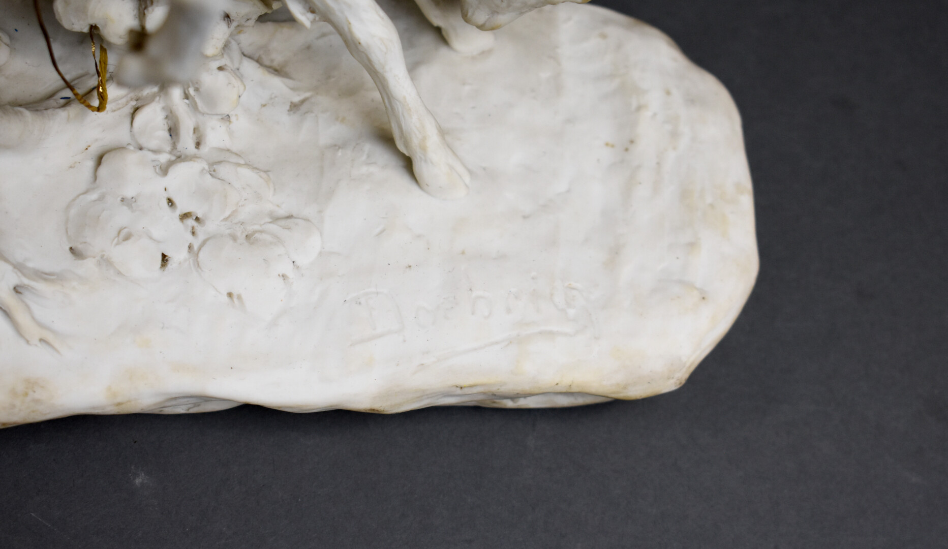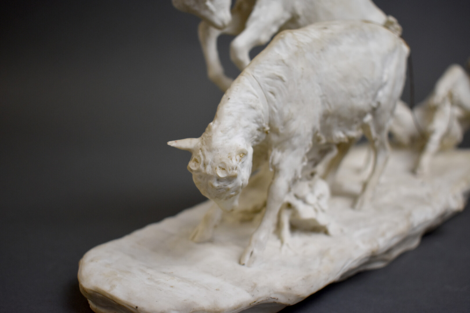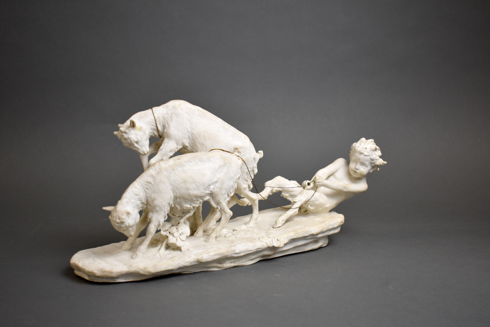 Ernst WAHLISS (1837-1900) Autriche. Sujet en biscuit représentant un faune tenant un couple de chèvres en laisse (manquent les deux cornes et une oreille à une chèvre). Signé à la pointe sur la terrasse et numéroté 1237 7 B avec cachet « Made in Austria » sous la base. Haut. : 20 cm – Larg. : 44 cm – Prof. : 13 cm.