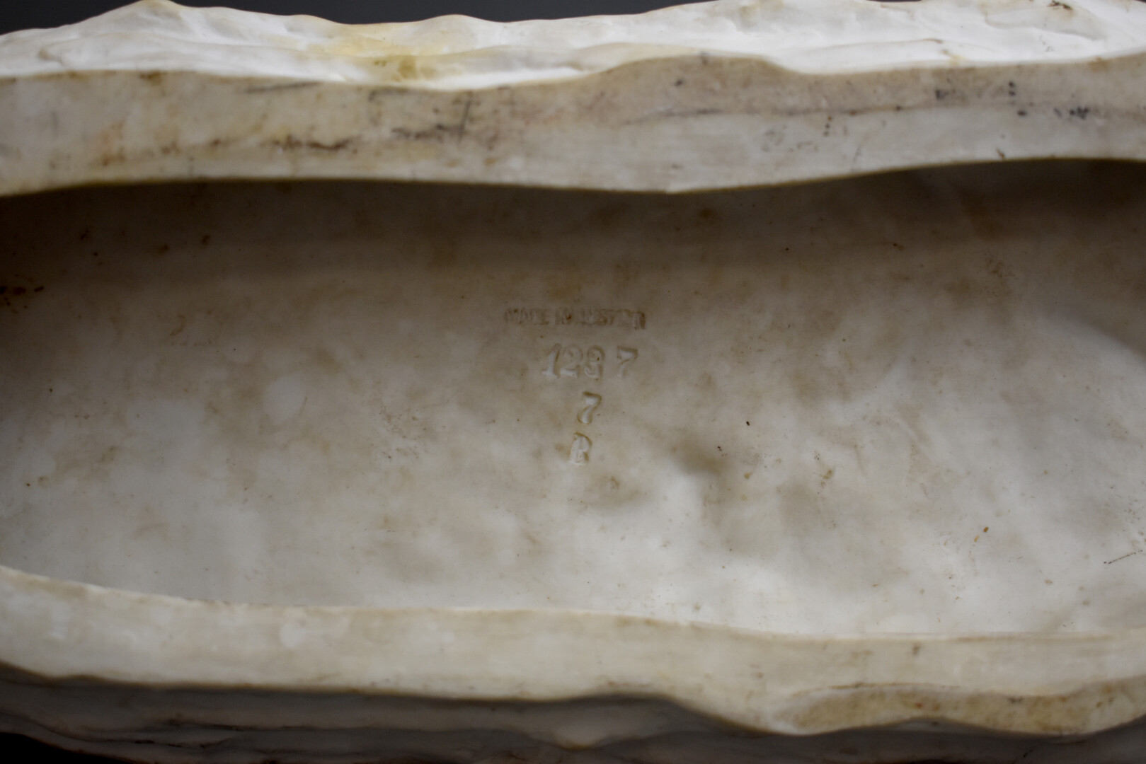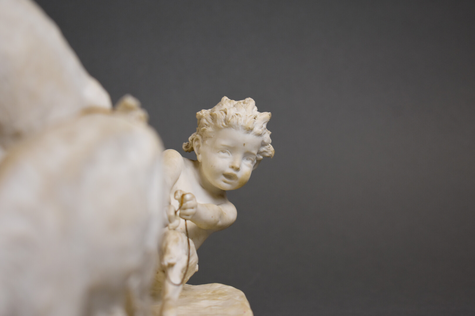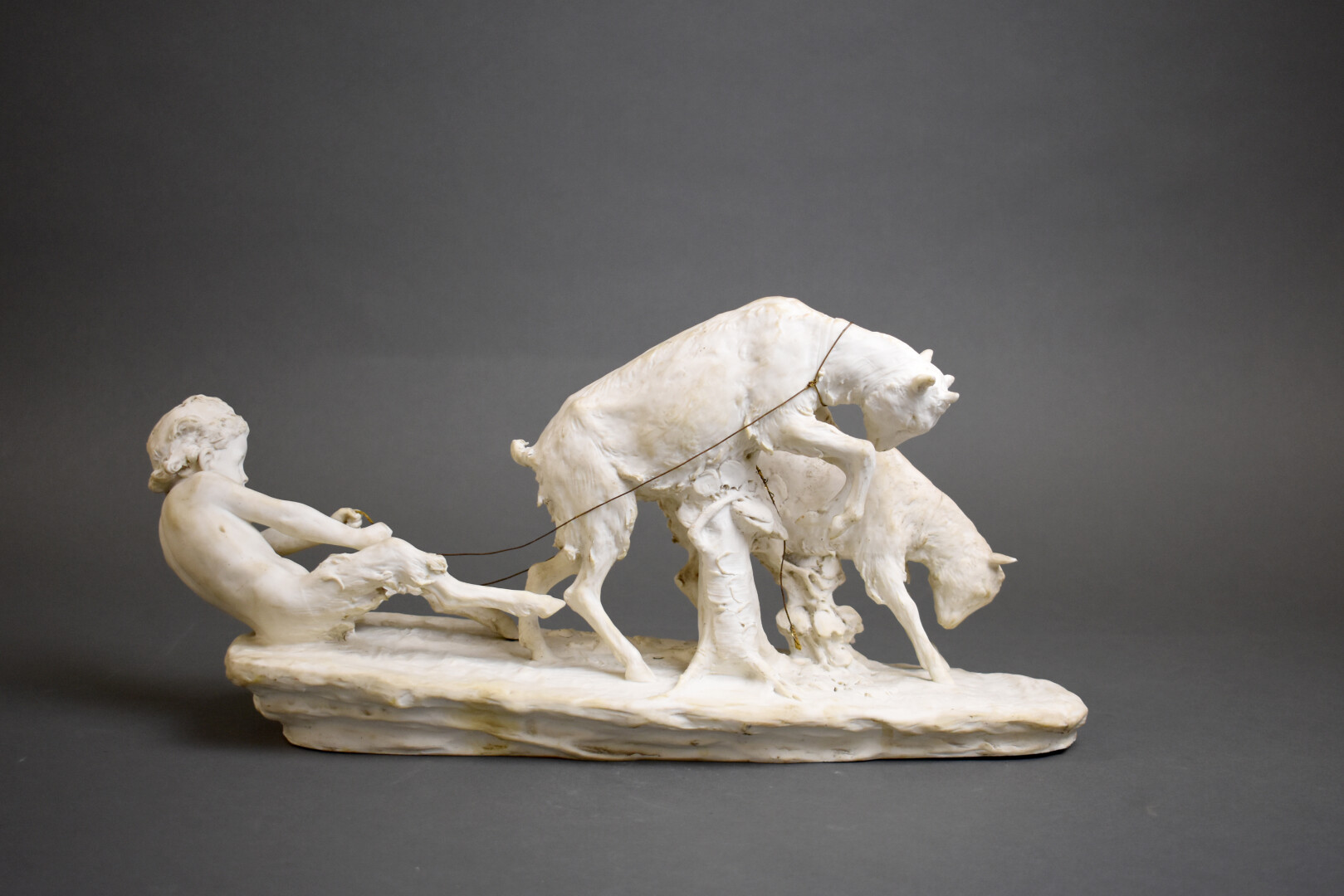 Ernst WAHLISS (1837-1900) Autriche. Sujet en biscuit représentant un faune tenant un couple de chèvres en laisse (manquent les deux cornes et une oreille à une chèvre). Signé à la pointe sur la terrasse et numéroté 1237 7 B avec cachet « Made in Austria » sous la base. Haut. : 20 cm – Larg. : 44 cm – Prof. : 13 cm.