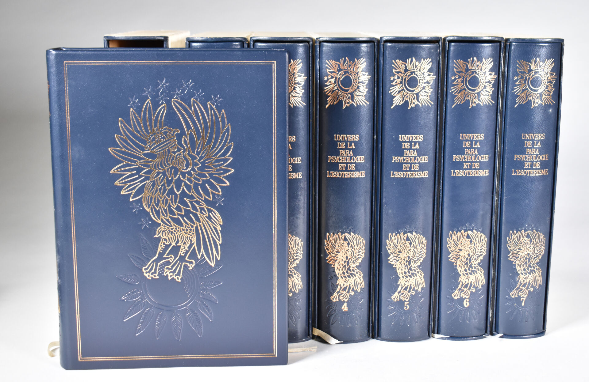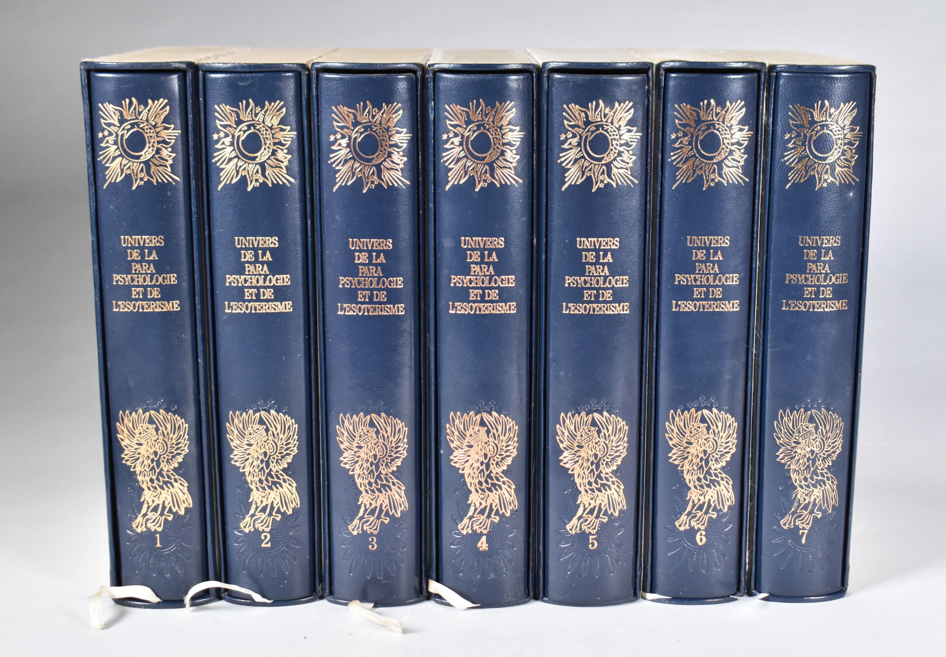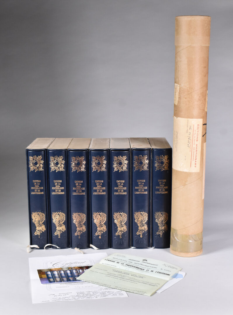 ESOTERISME. UNIVERS DE LA PARA PSYCHOLOGIE ET DE L’ESOTERISME – Ed. MARTINSART. 7 volumes. Reliure plein cuir bleu marine et or, orné d’un décor frappé à chaud, en 250 exemplaires numéroté, celui-ci numéroté 81. Emboitage éditeur. Avec lithographie originale.