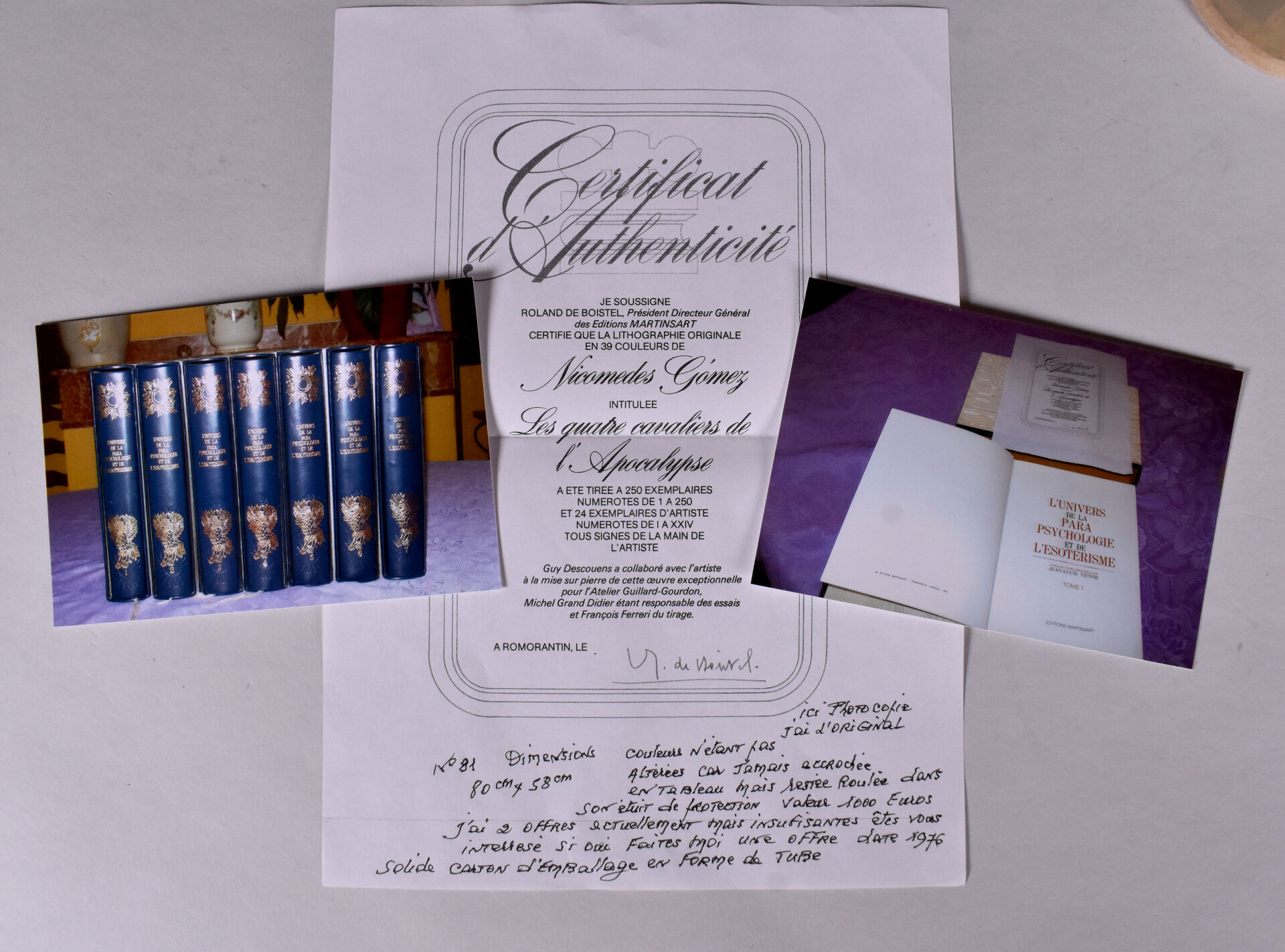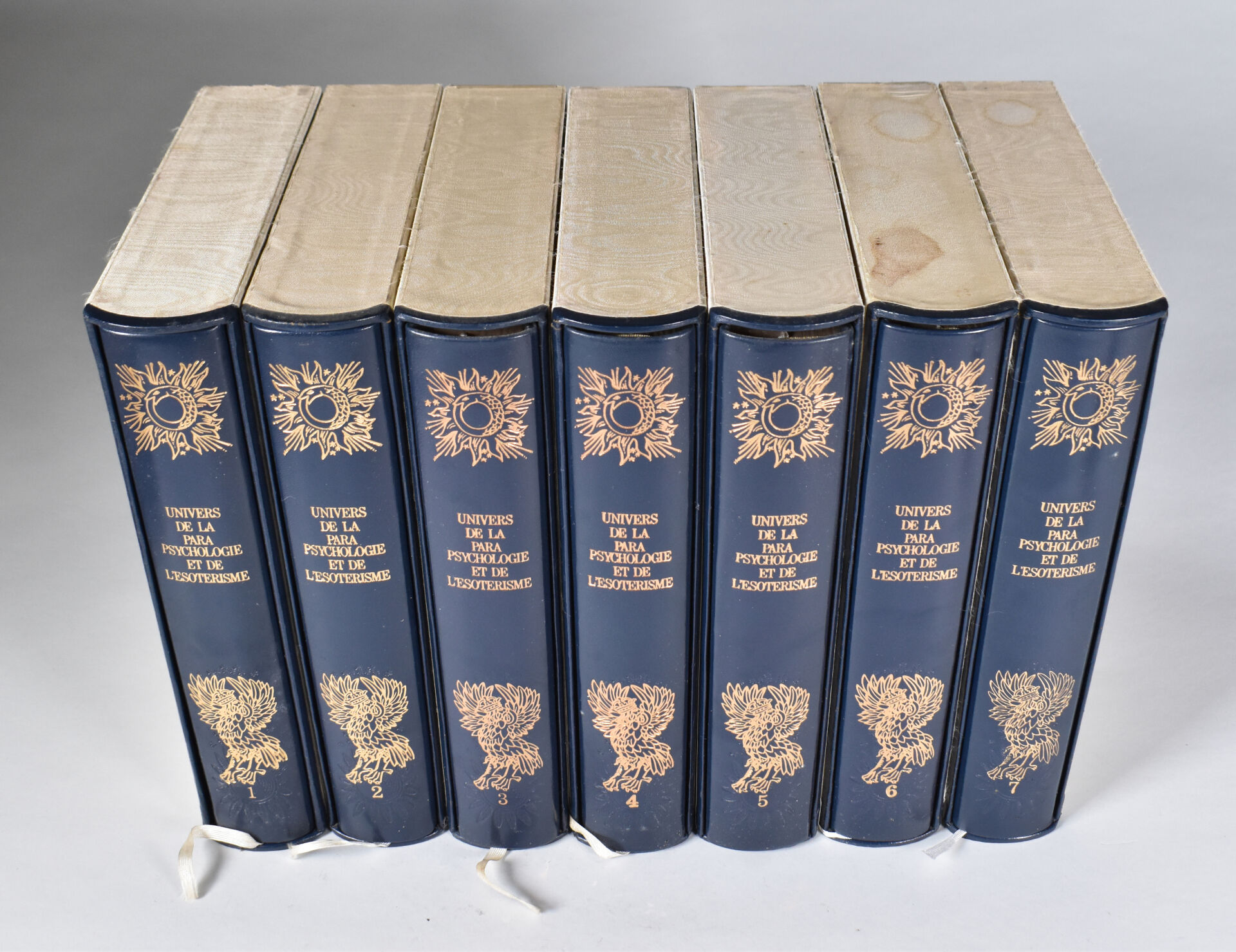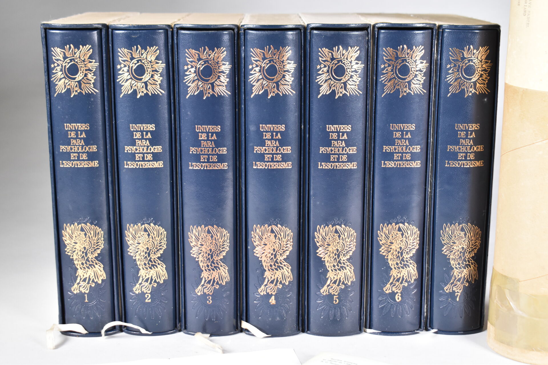 ESOTERISME. UNIVERS DE LA PARA PSYCHOLOGIE ET DE L’ESOTERISME – Ed. MARTINSART. 7 volumes. Reliure plein cuir bleu marine et or, orné d’un décor frappé à chaud, en 250 exemplaires numéroté, celui-ci numéroté 81. Emboitage éditeur. Avec lithographie originale.