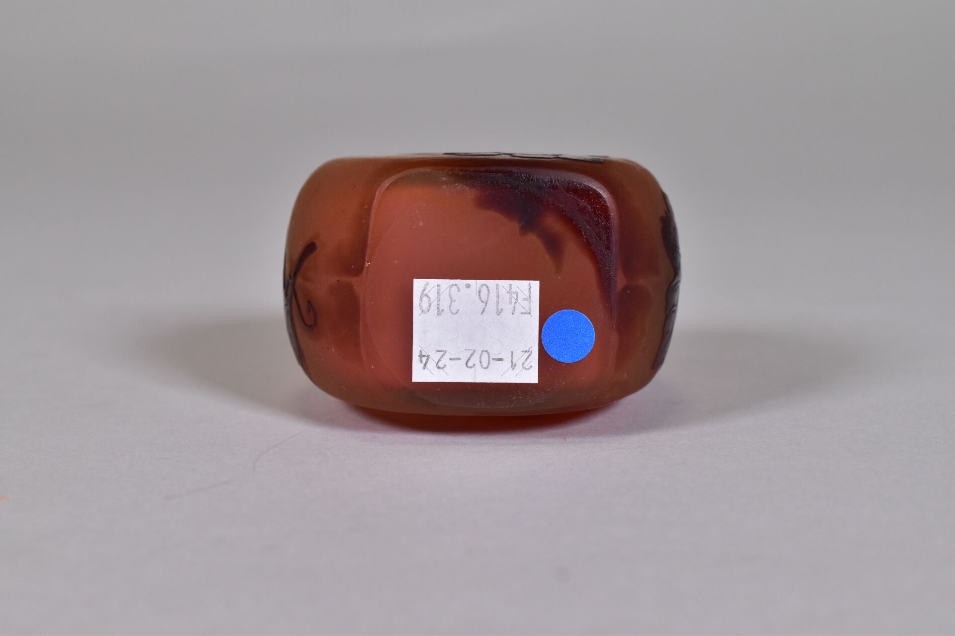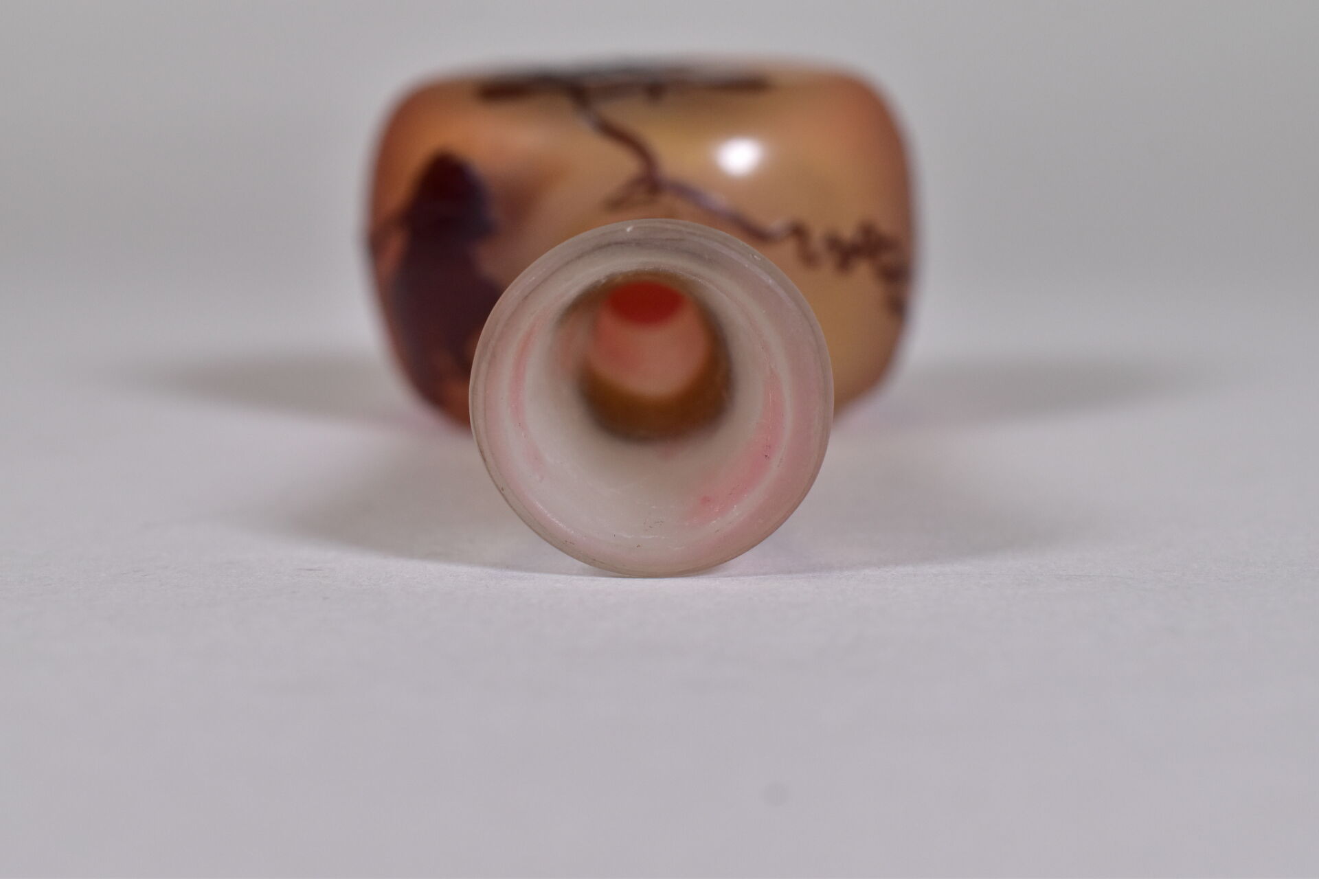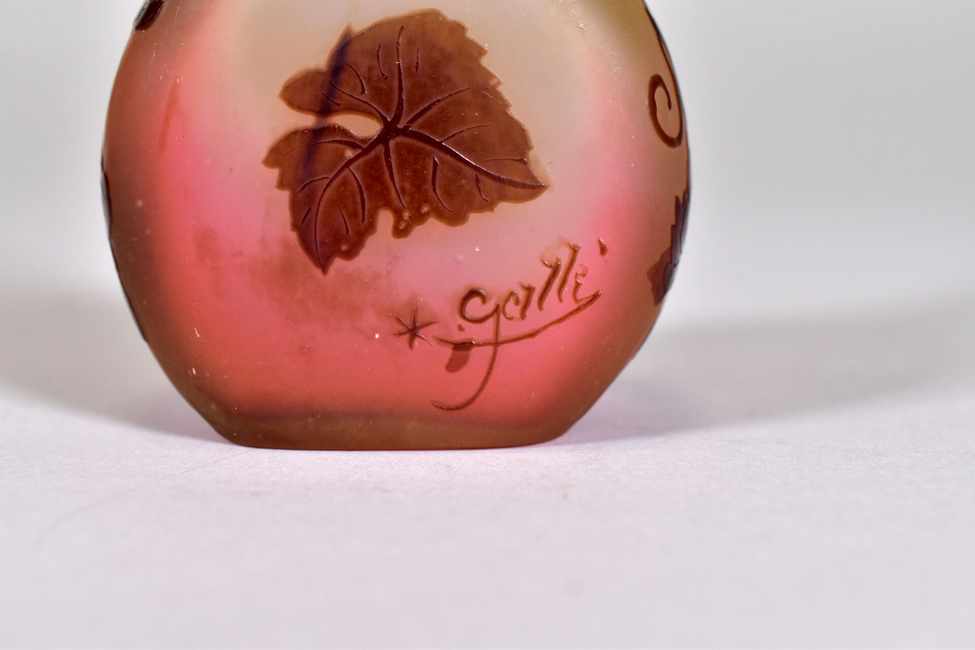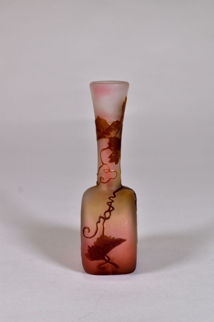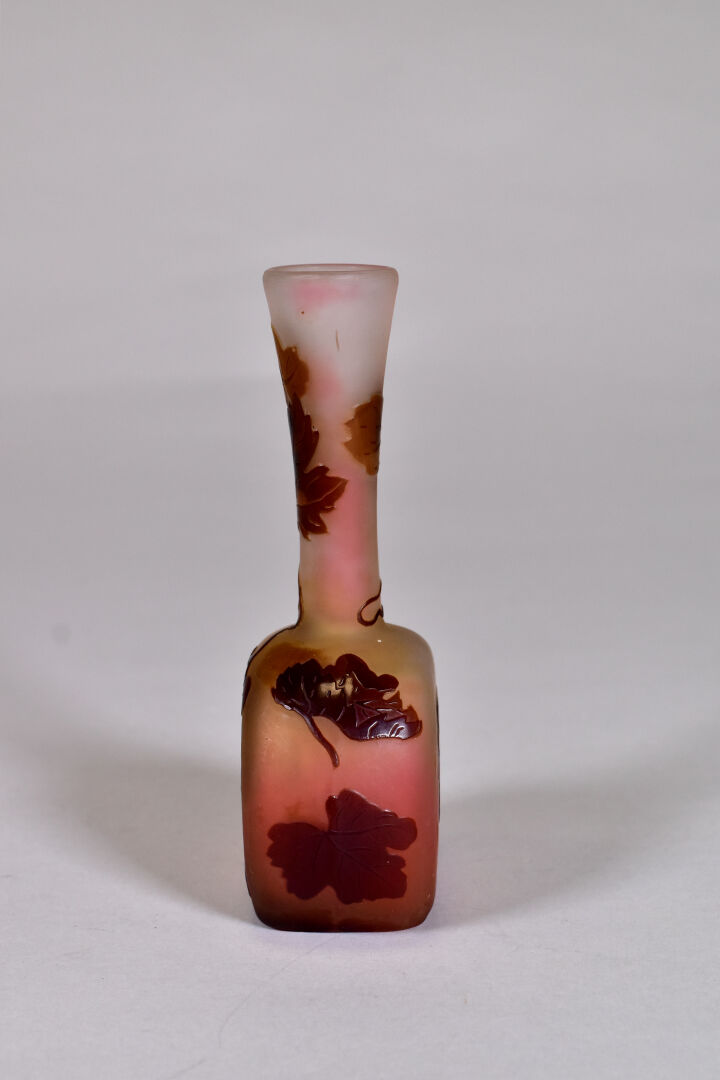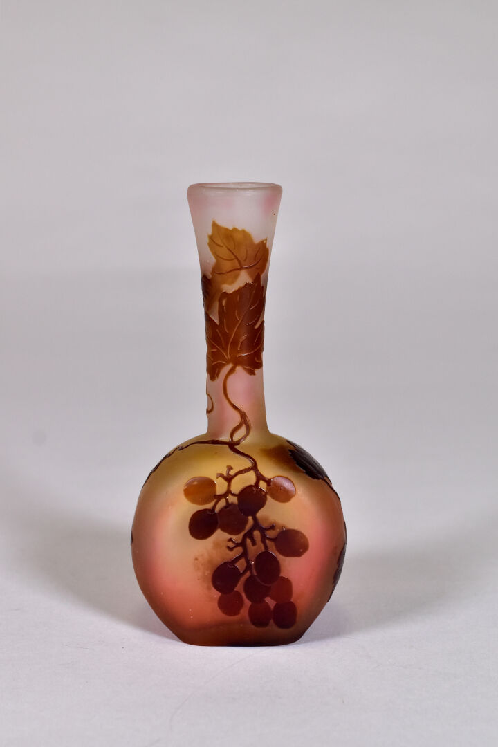 ETABLISSEMENTS ÉMILE GALLÉ. Petit vase à panse aplatie et haut col en verre à décor dégagé à l’acide en brun de pampres de vigne sur fond orangé. Signature à l’étoile. Haut. : 15 cm.