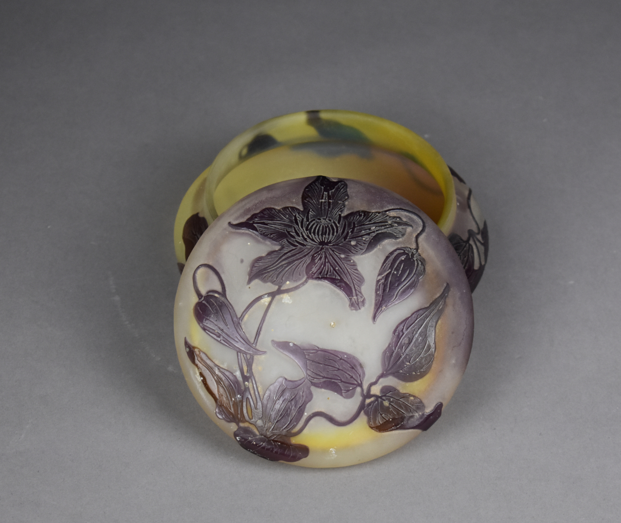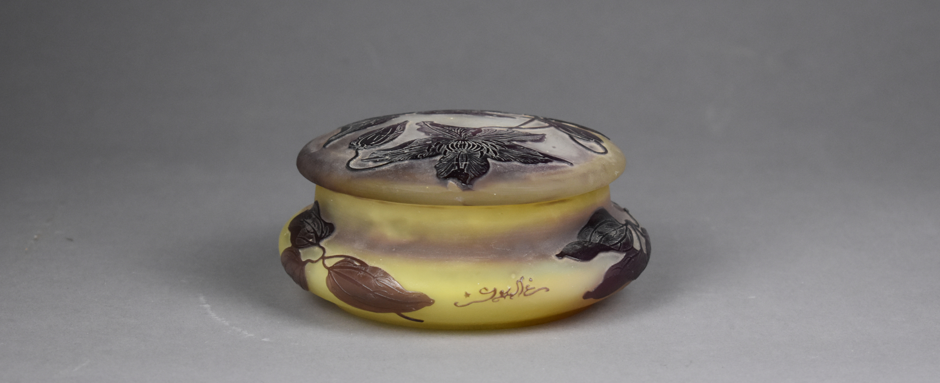 ÉTABLISSEMENTS GALLÉ. Bonbonnière en verre multicouche à décor dégagé à l’acide en mauve de fleurs sur fond jaune. Signature à l’étoile. Haut. : 7,5 cm – Diam. : 14,5 cm.