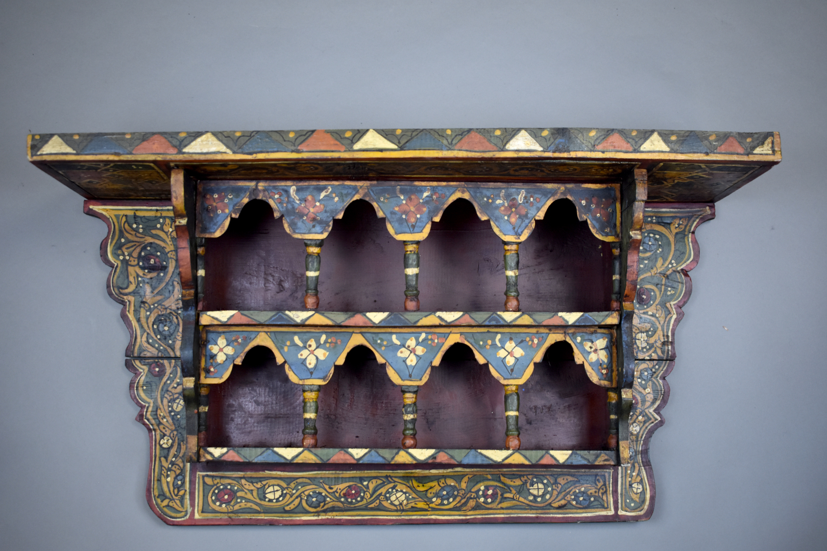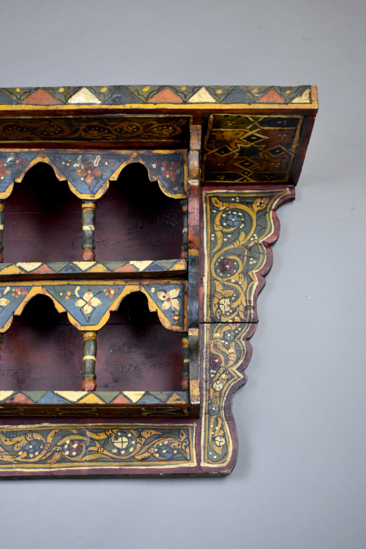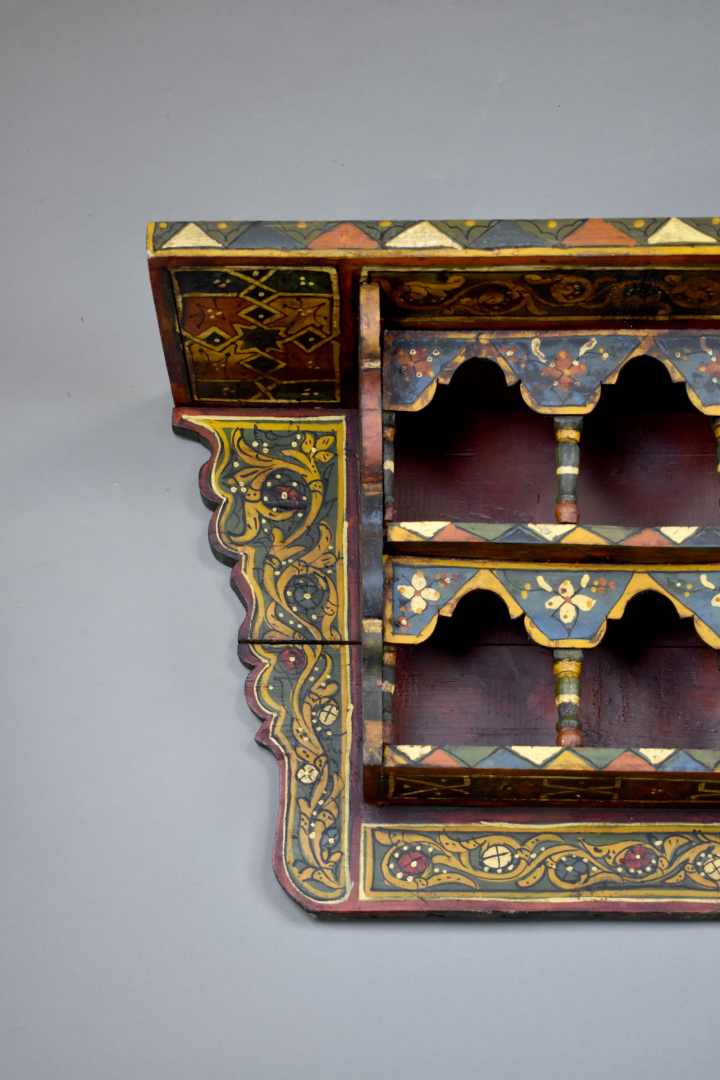 Etagère en bois à décor peint en polychromie d’entrelacs, motifs géométriques et végétaux. Travail Marocain (Berbère ?) du début du XXe siècle. Haut. : 45 cm – Larg. : 76 cm – Prof. : 20 cm.