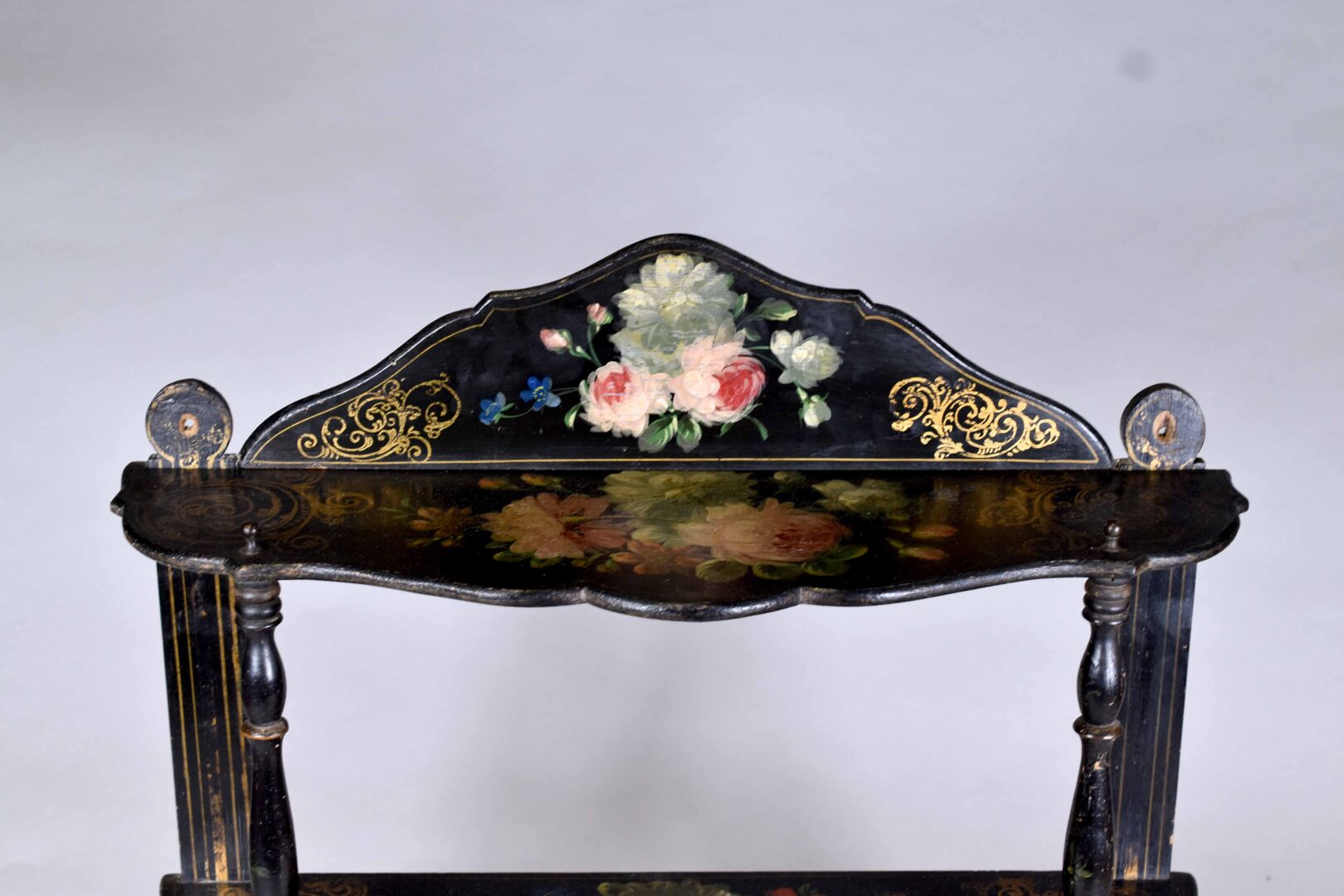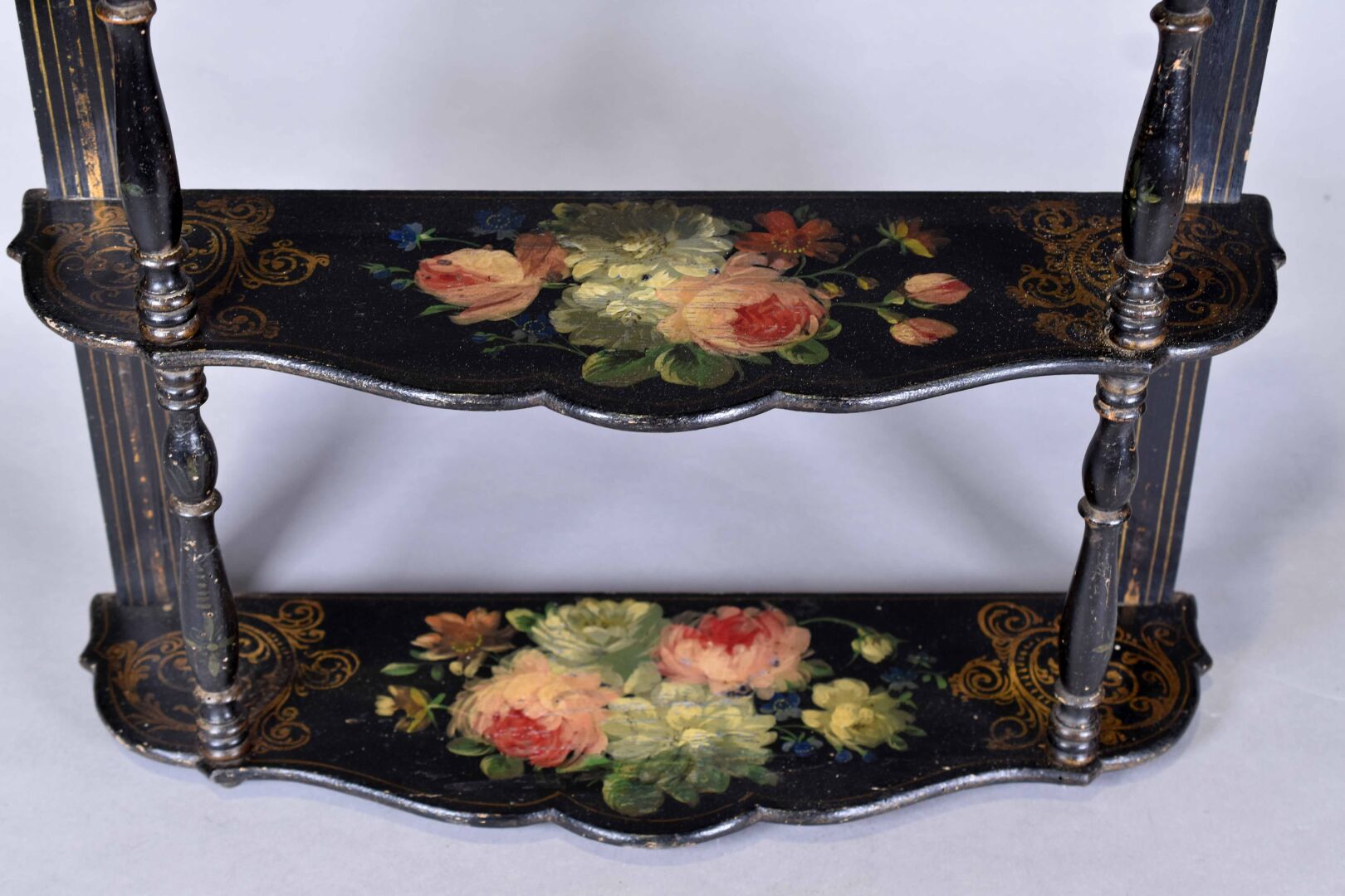 Etagère murale en bois noirci et peint de fleurs, décor d’acanthes en dorure (usures et fentes, à refixer). Epoque Napoléon III. Haut. 60 cm – Larg. : 55 cm – Prof. : 17 cm.