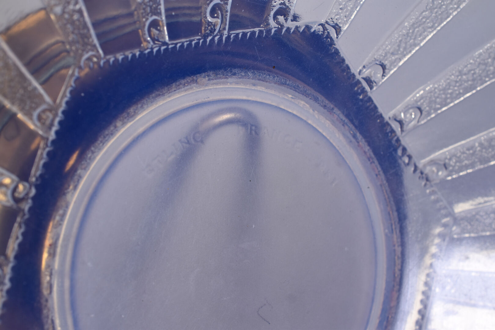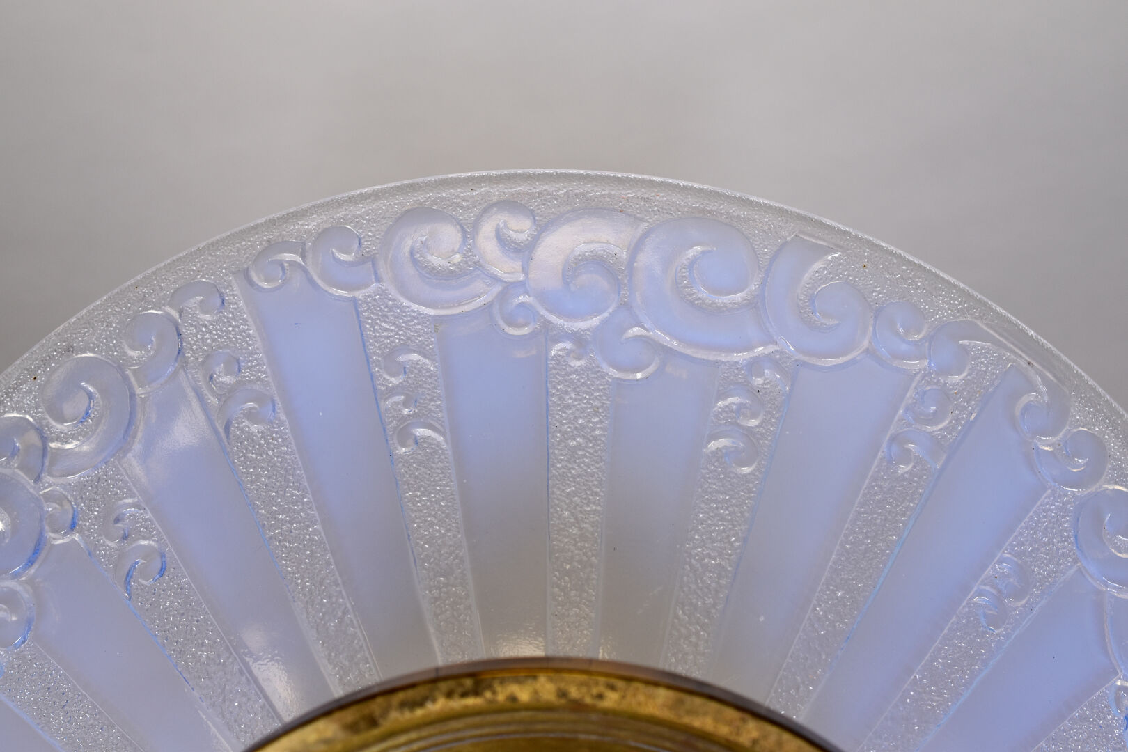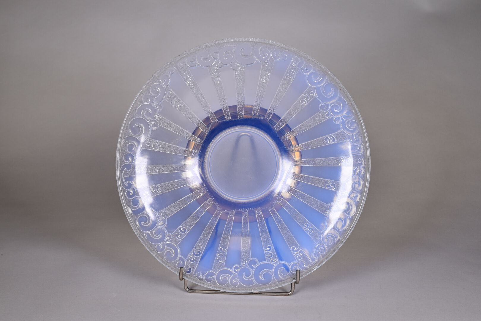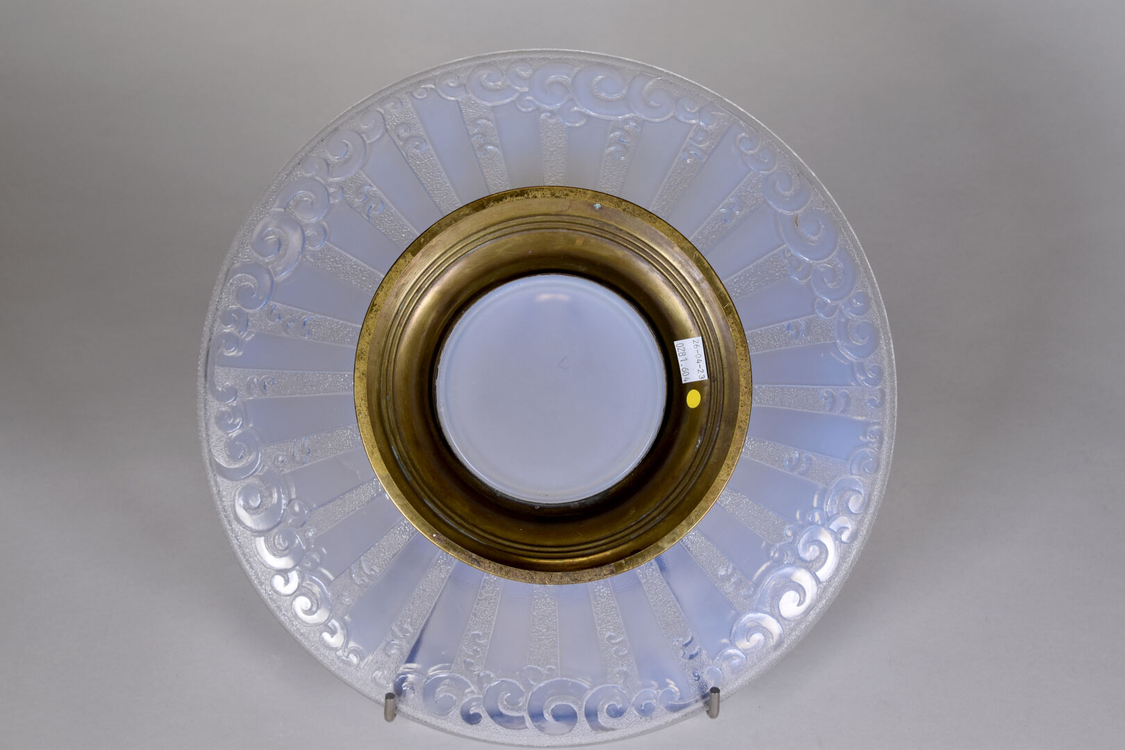 ETLING. Coupe sur pied en verre opalescent à décor de nuages rayonnants. Le pied à gradins en laiton. Marquée au dessous. Haut. :10,5 cm – Diam. : 35 cm.