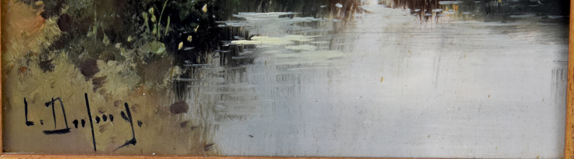 Eugène GALIEN-LALOUE alias Louis DUPUY (1854-1941). Paysage animé en bord d’étang. Huile sur panneau signée en bas à gauche. 34,5 x 16,5 cm (à vue).
