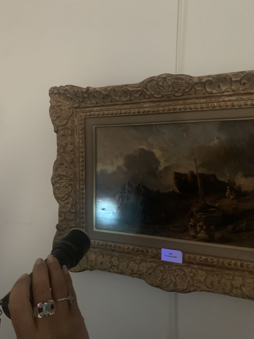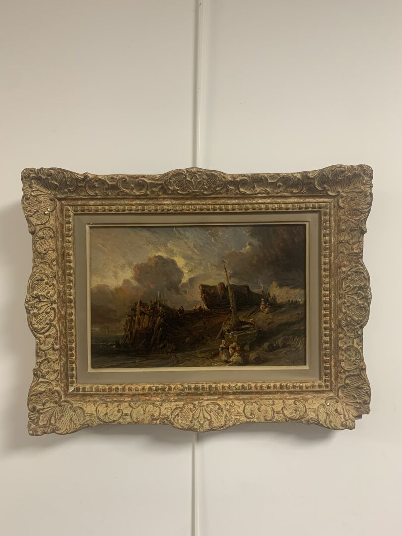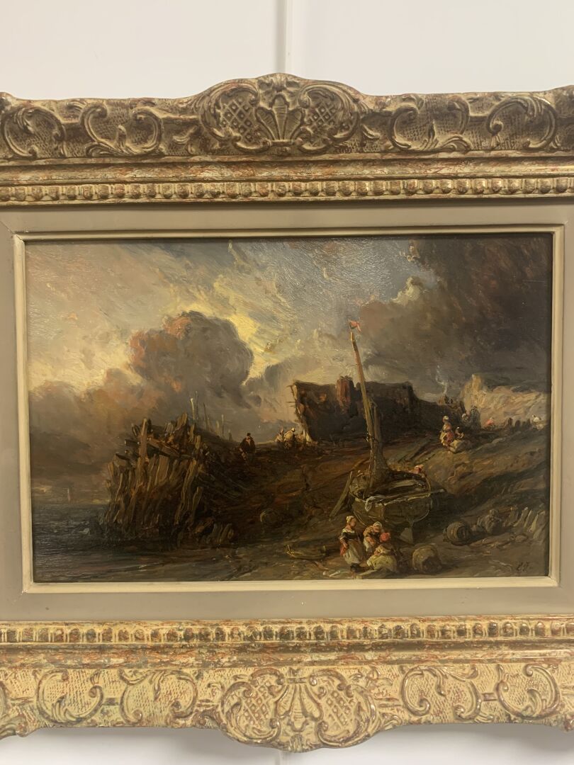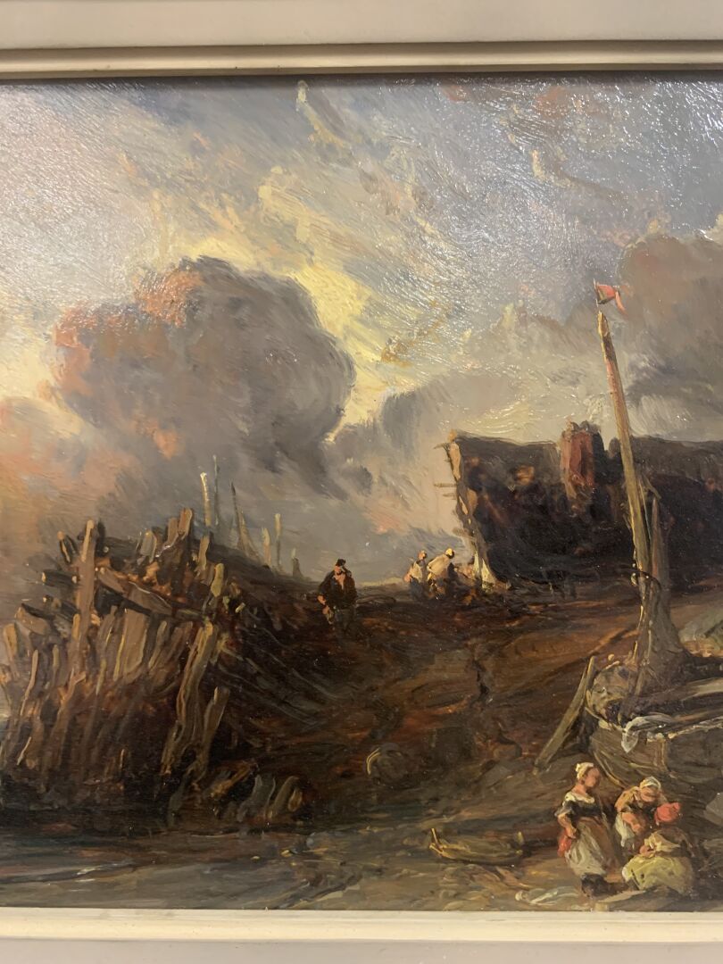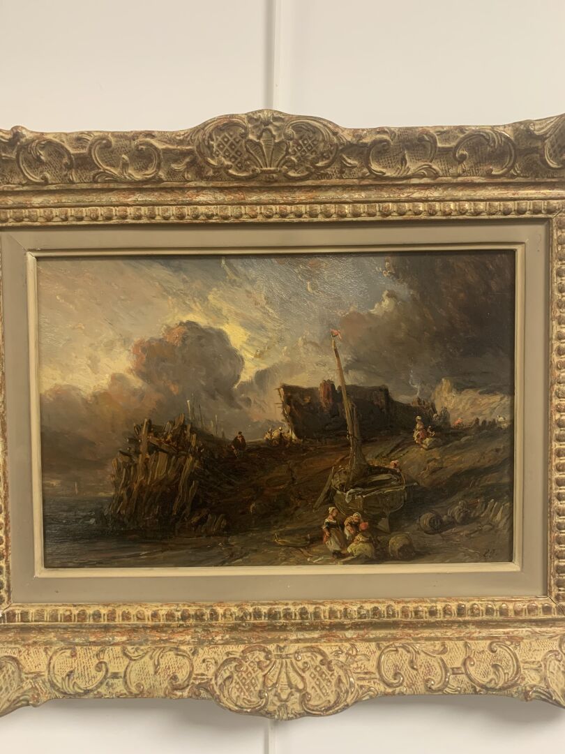 Eugène ISABEY (1804-1886) Enfants jouant près d’un voilier à marée basse. Huile sur panneau de bois, monogramme E.J en bas à droite (quelques petits repeints). 22 x 32,5 cm.