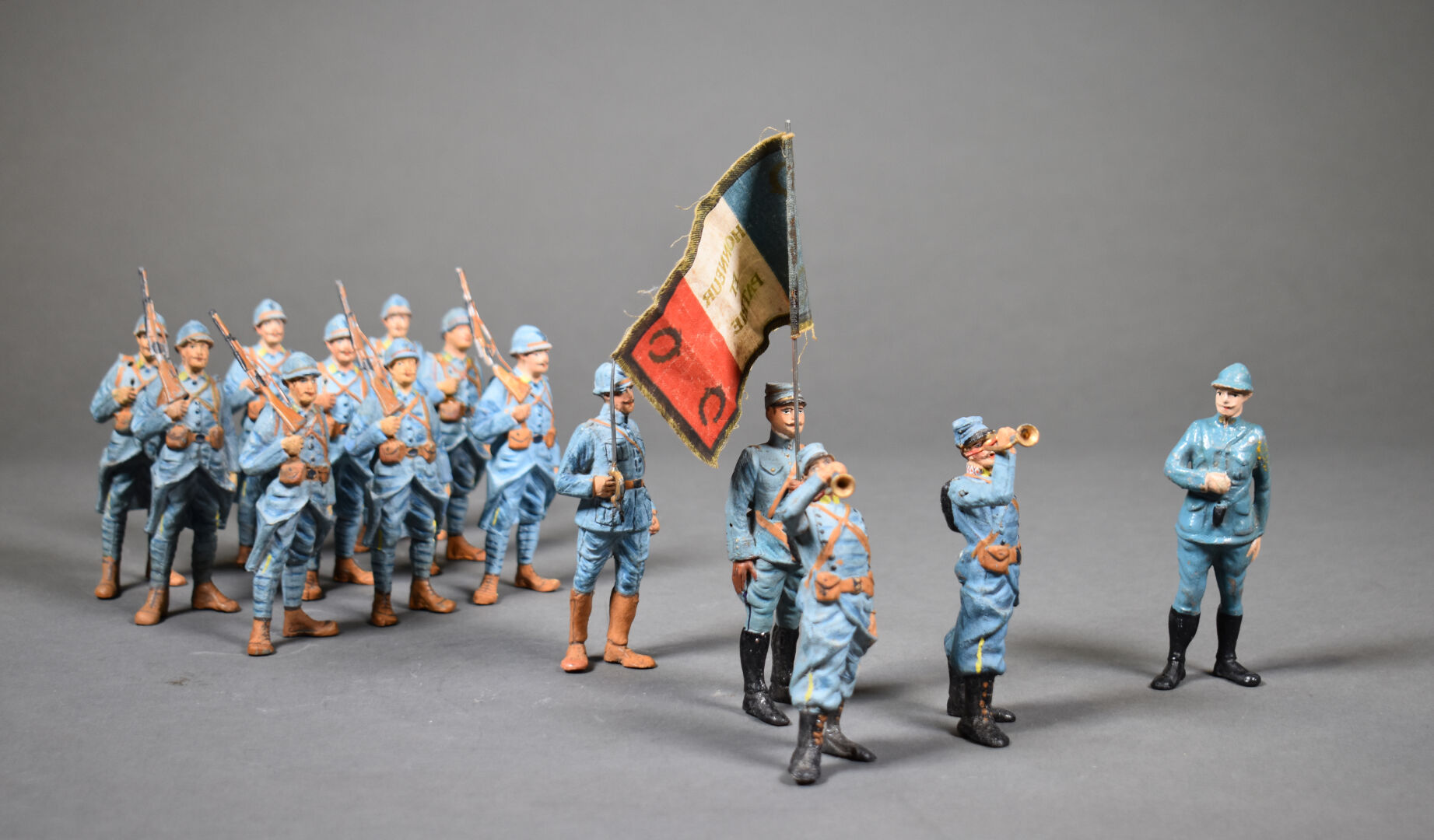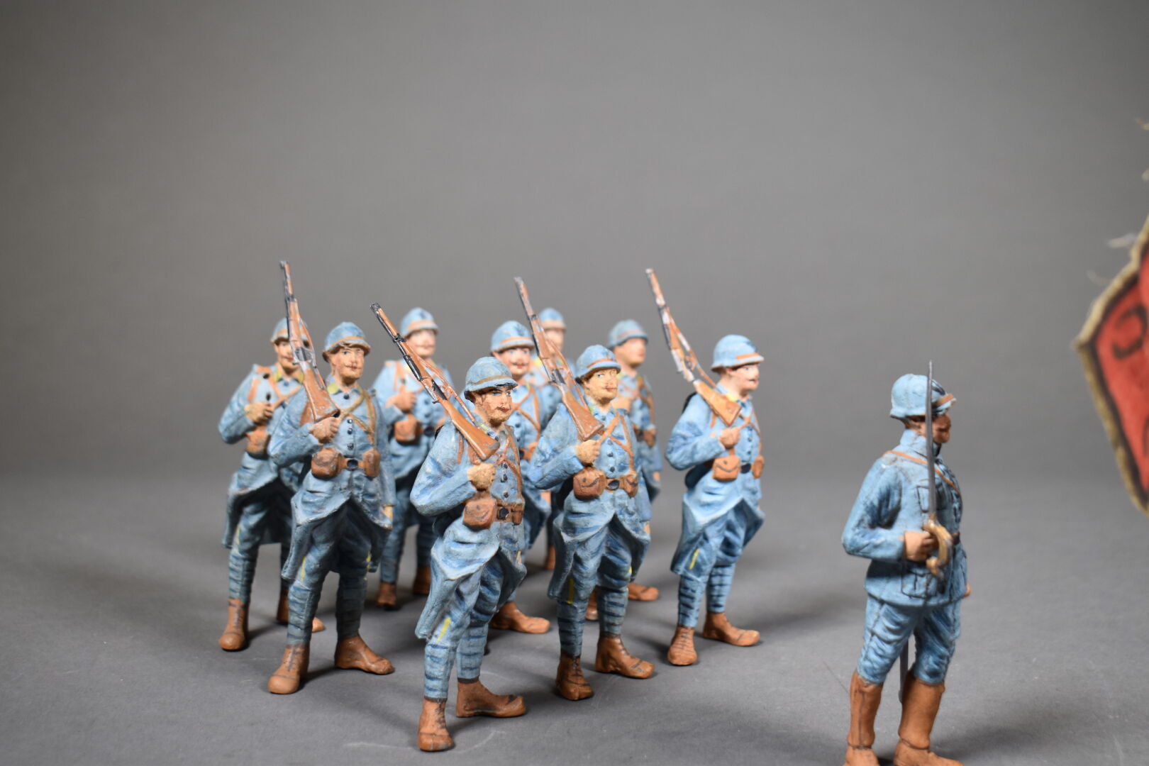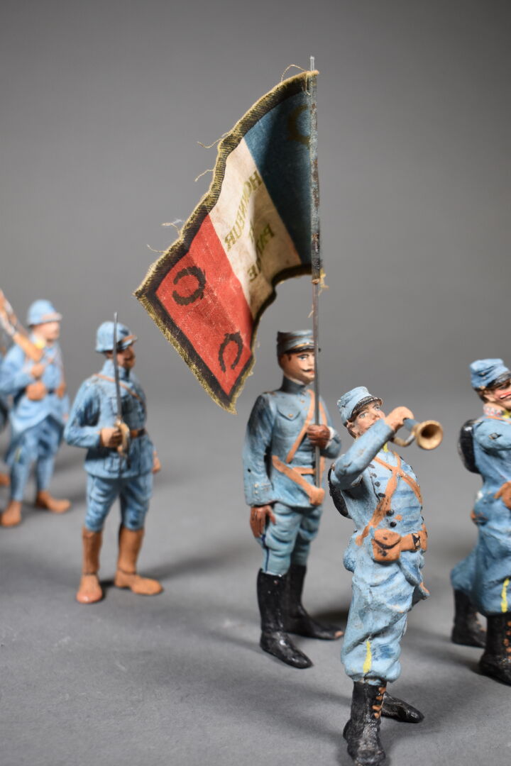 Exceptionnel lot de figurines françaises SFBJ. Soldats français Première Guerre mondiale dont porte-drapeau, musique et fantassins. 14 pièces en état d’usage, pour certains manque le fusil et d’autres traces de repeints.