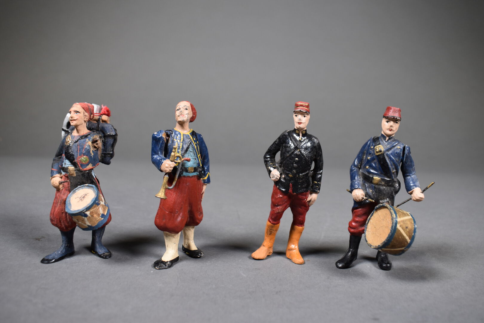 Exceptionnel lot de figurines françaises SFBJ. Soldats français Première Guerre mondiale dont porte-drapeau, musique et fantassins. 14 pièces en état d’usage, pour certains manque le fusil et d’autres traces de repeints. On joint 1 zouave tambour, manque un bras, un tambour. 3e République et 2 autres pièces.