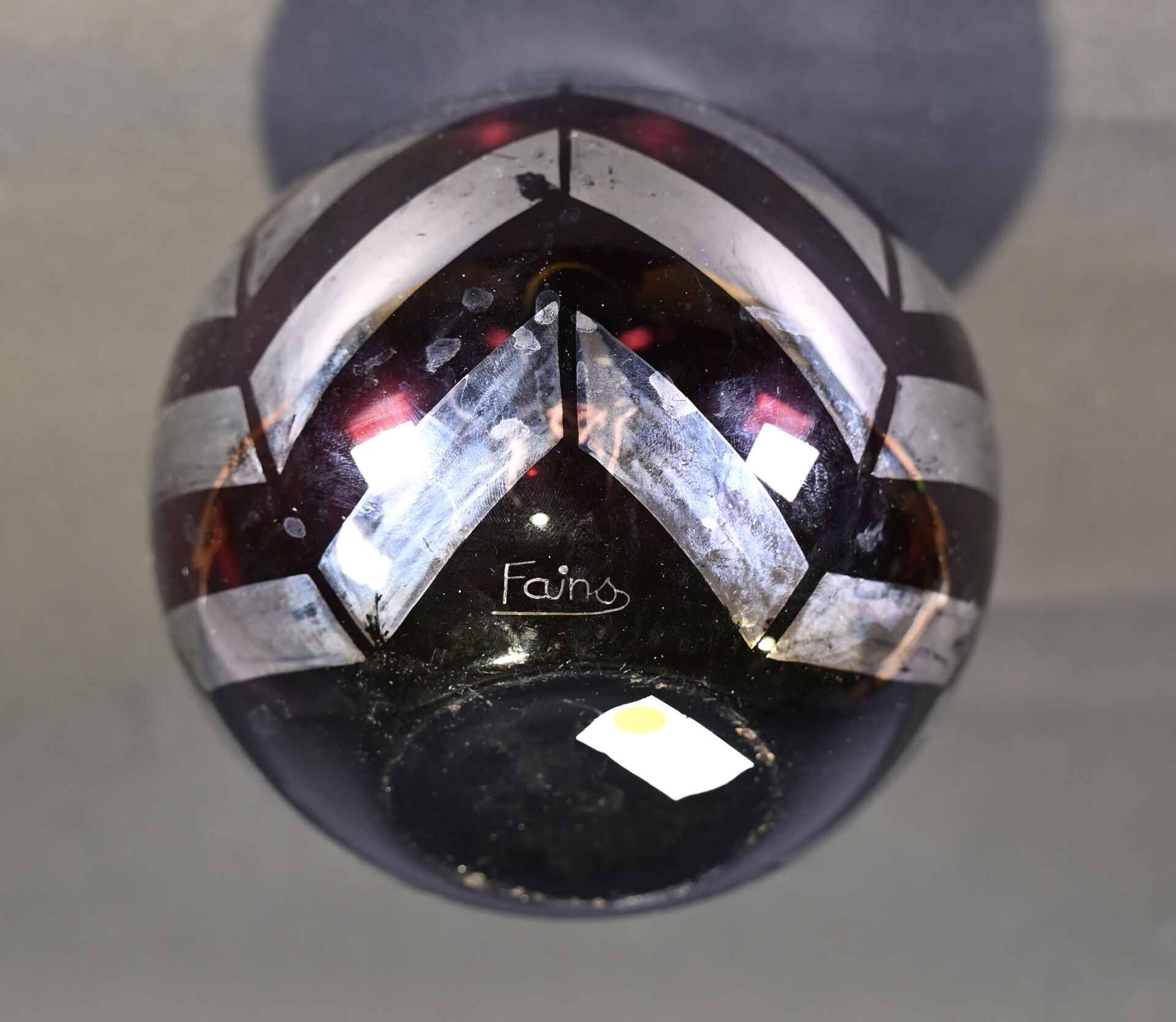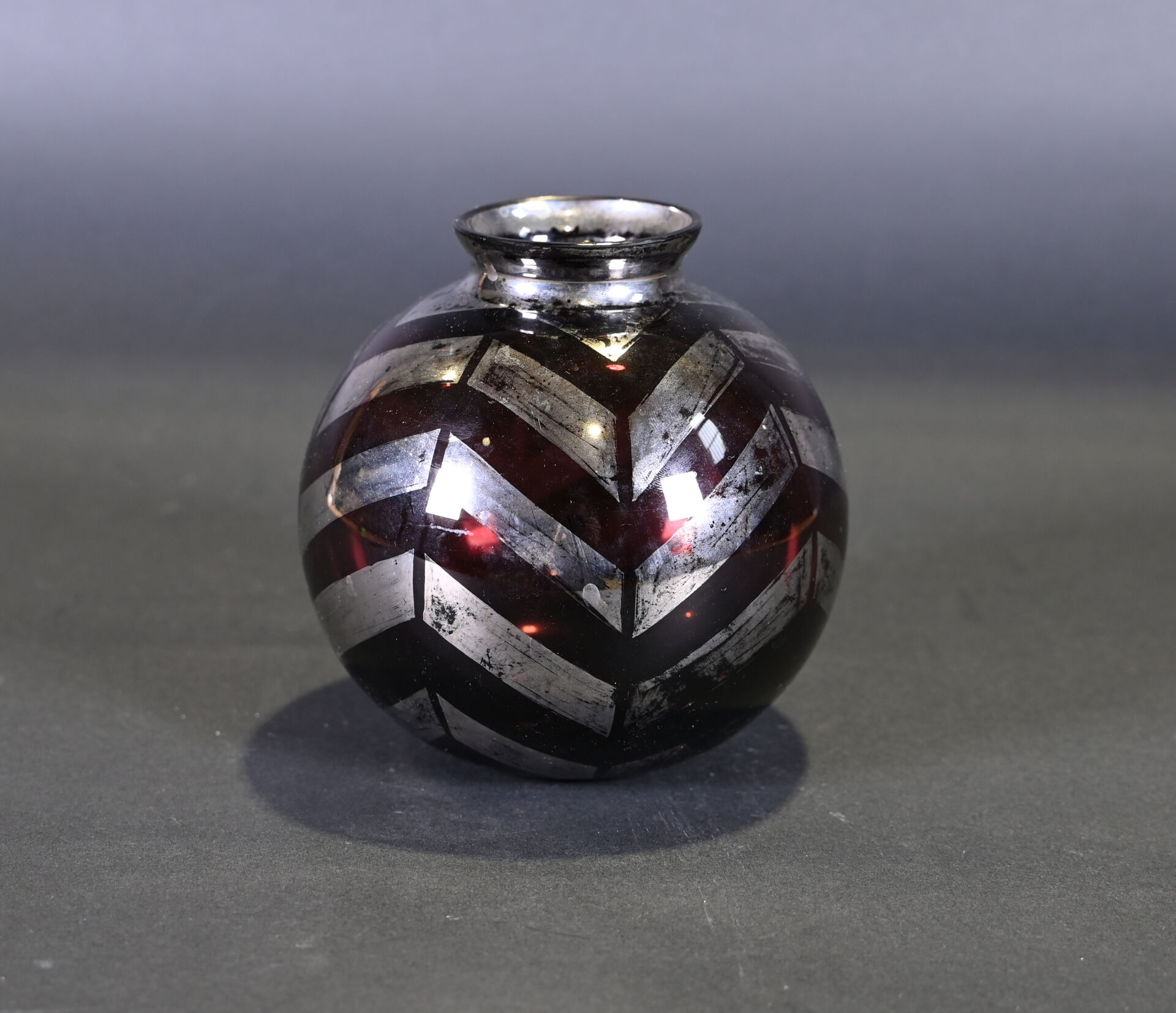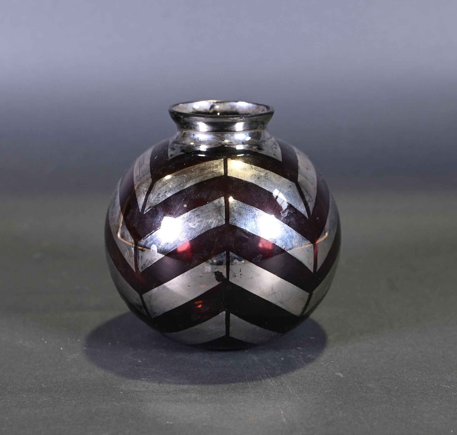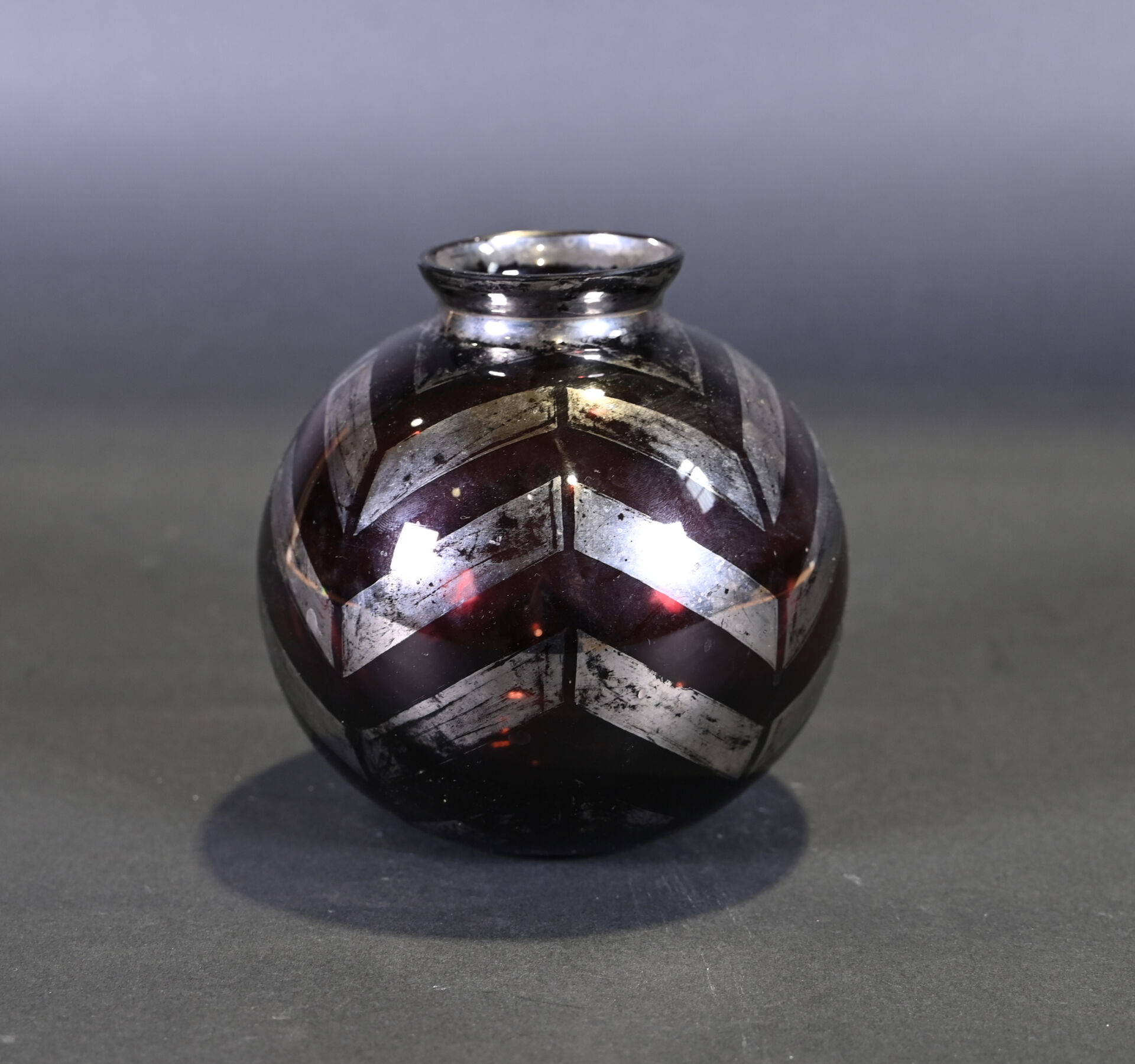 FAINS-LES-SOURCES. Vase boule en verre mauve à décor argenté de chevrons. Signé. Haut. : 15 cm. On joint un autre vase en verre à décor gravé de fleurs dans le goût de Legras.