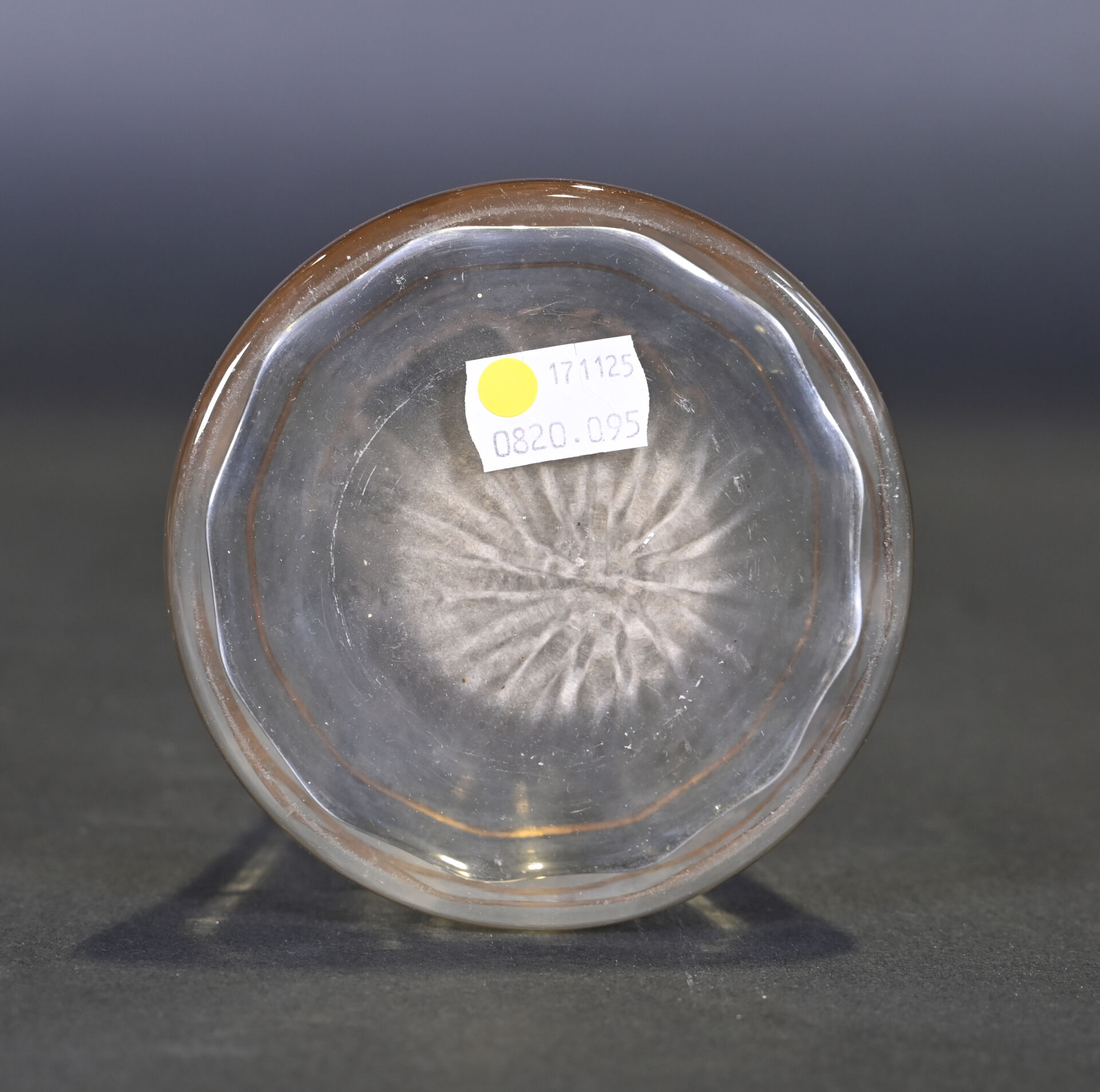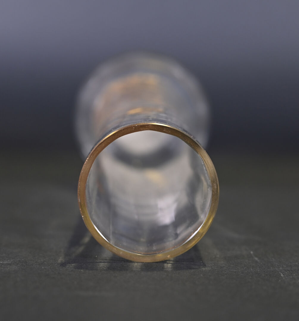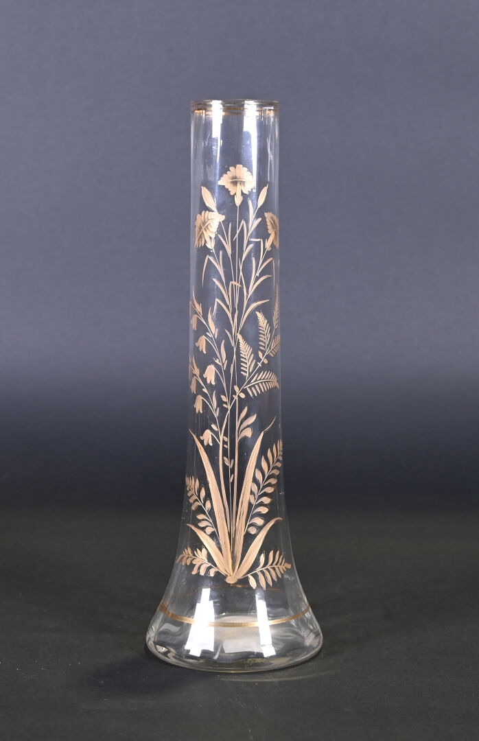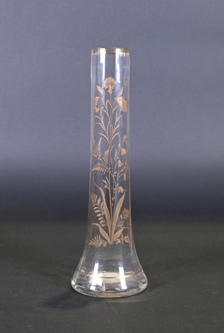 FAINS-LES-SOURCES. Vase boule en verre mauve à décor argenté de chevrons. Signé. Haut. : 15 cm. On joint un autre vase en verre à décor gravé de fleurs dans le goût de Legras.