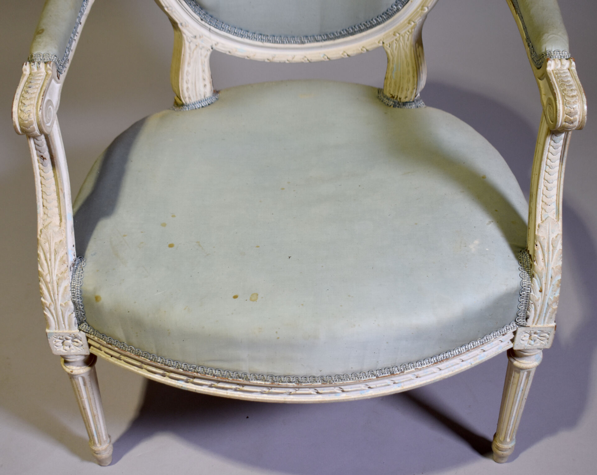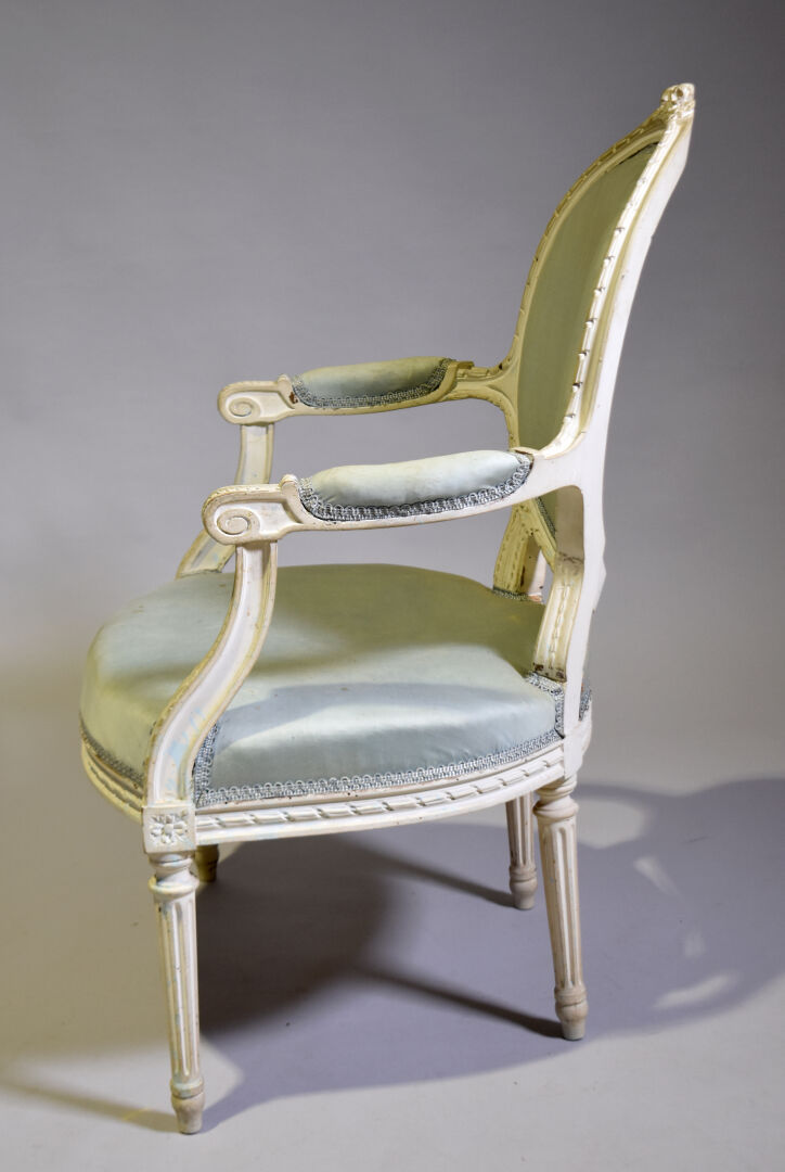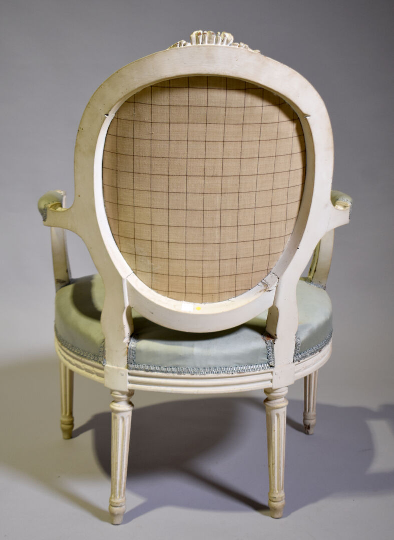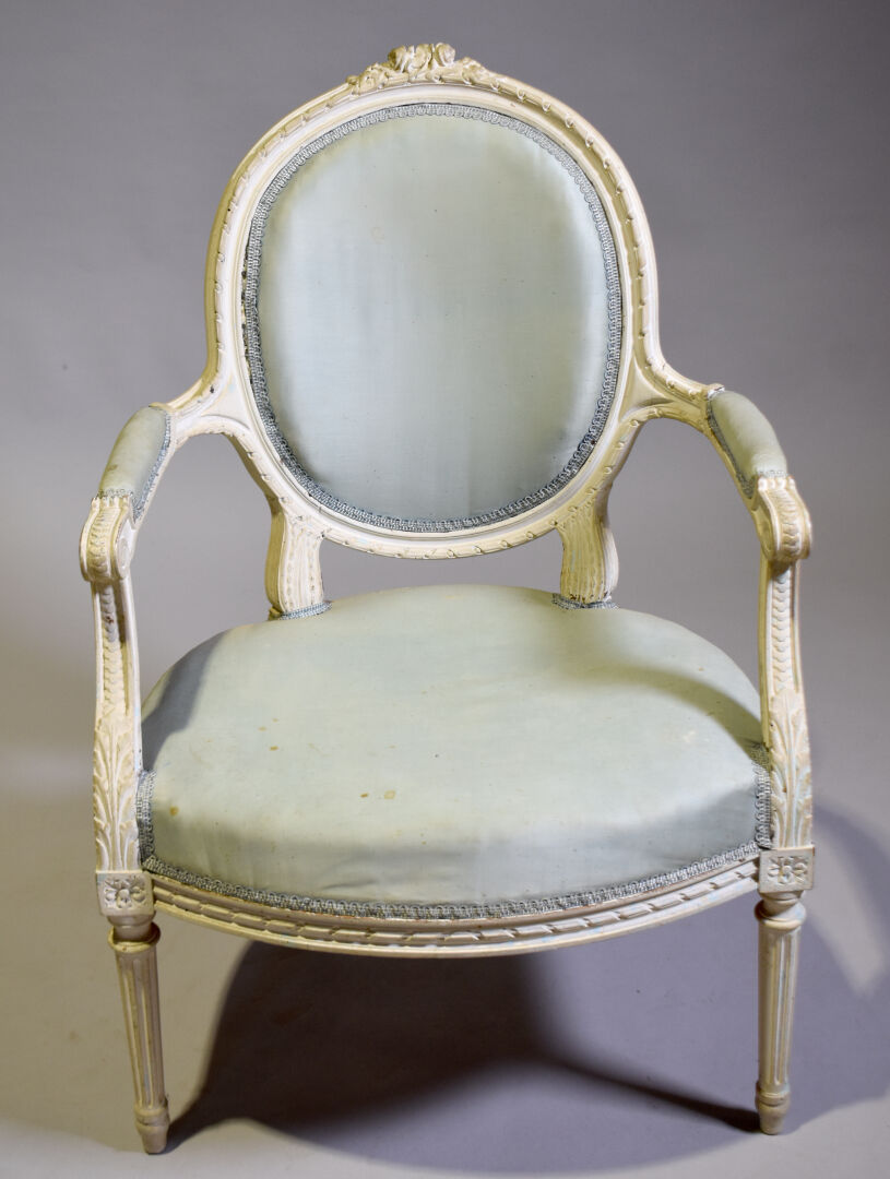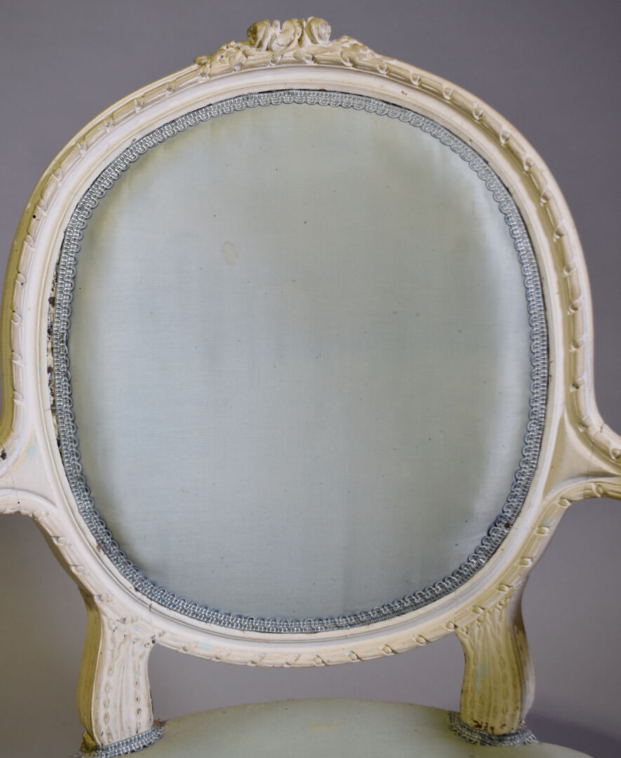 Fauteuil à dossier médaillon en bois sculpté relaqué crème, le haut du dossier orné de fleurs, les accotoirs à manchettes, les montants à frise de piastre, les pieds fuselés cannelés. Style Louis XVI, XIXe siècle. Garniture de tissu bleu ciel (usures et taches). Haut. : 94 cm.