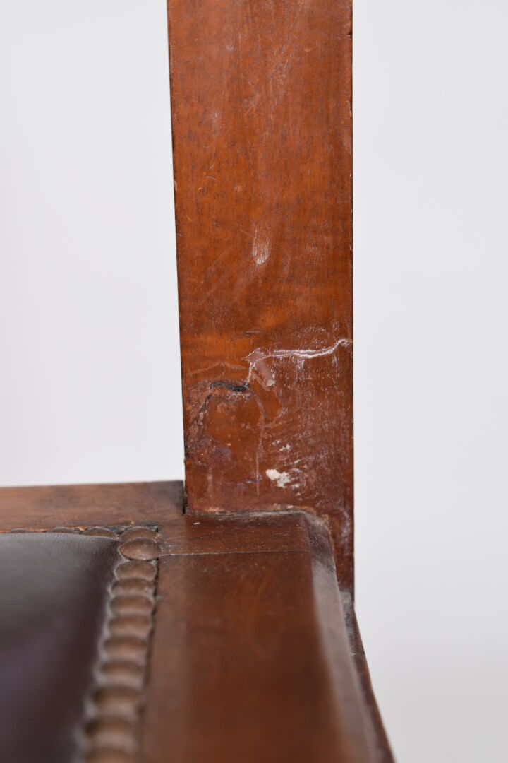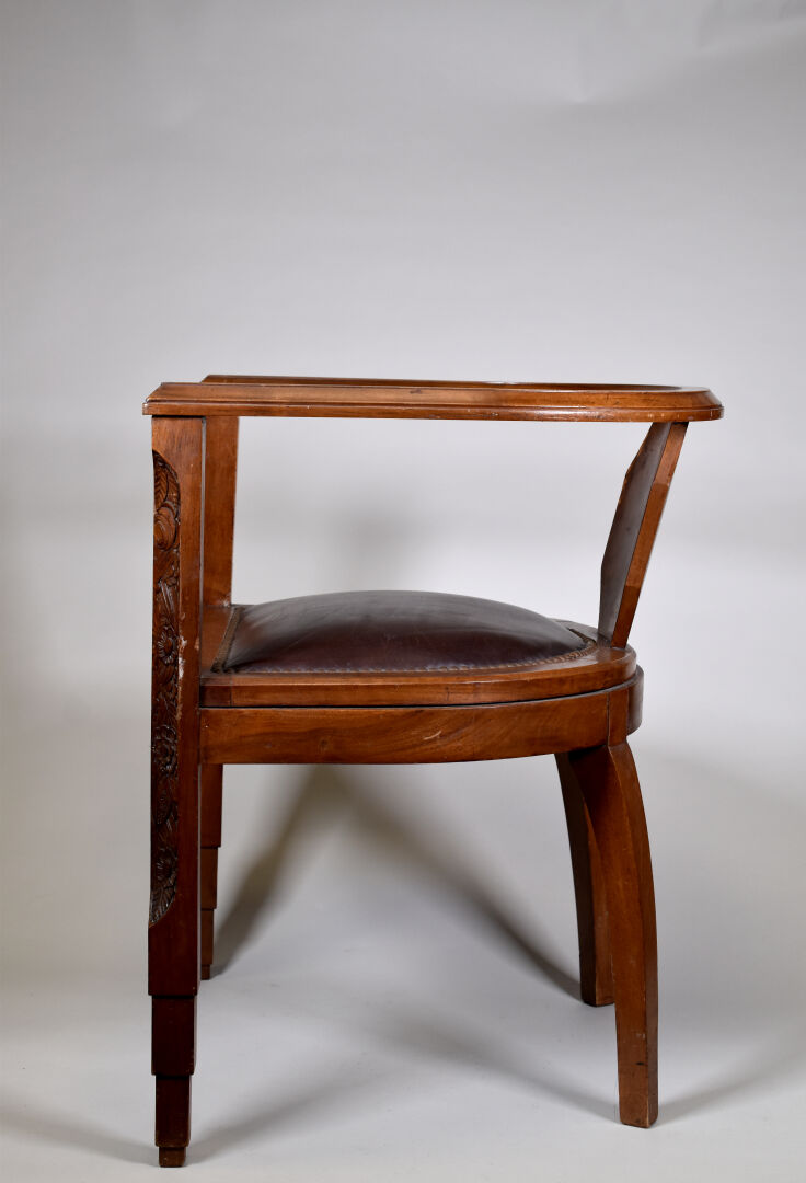 Fauteuil corbeille en placage de noyer et noyer mouluré sculpté, les supports d’accotoirs sculptés de fleurs, les pieds antérieurs droit, en gradins, postérieurs légèrement courbés (restaurations, quelques usures et sauts de placage). Garniture de cuir brun (usures). Epoque Art Déco. Haut. : 71 cm.