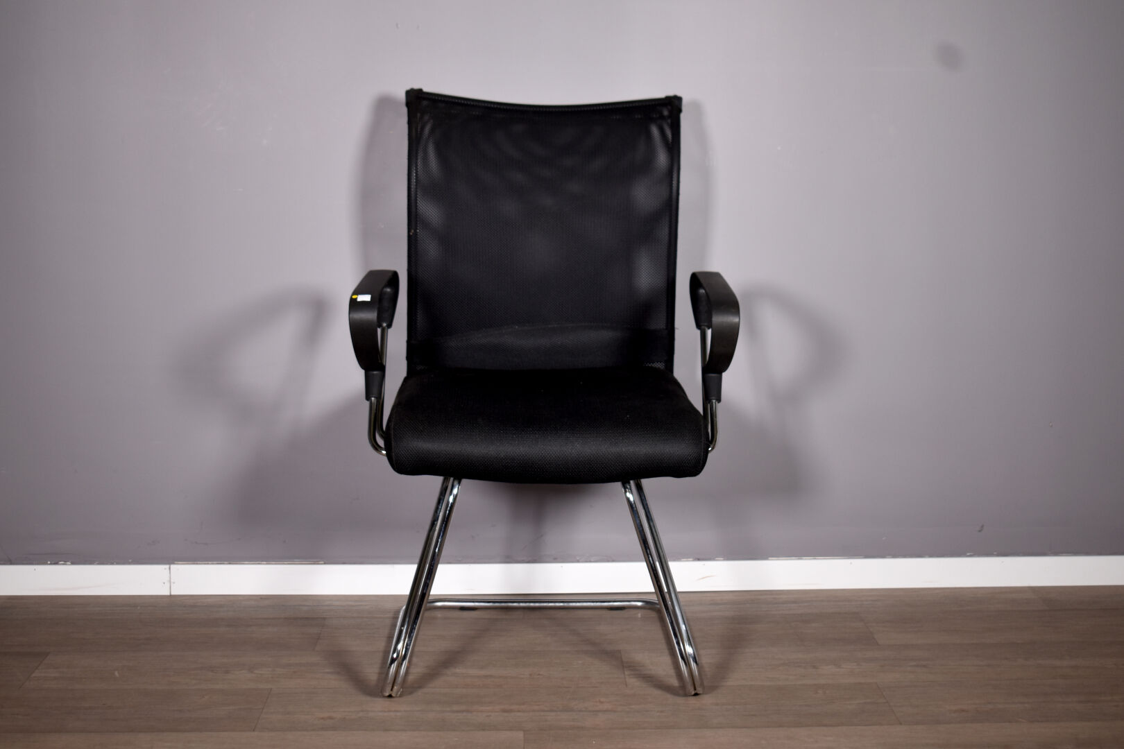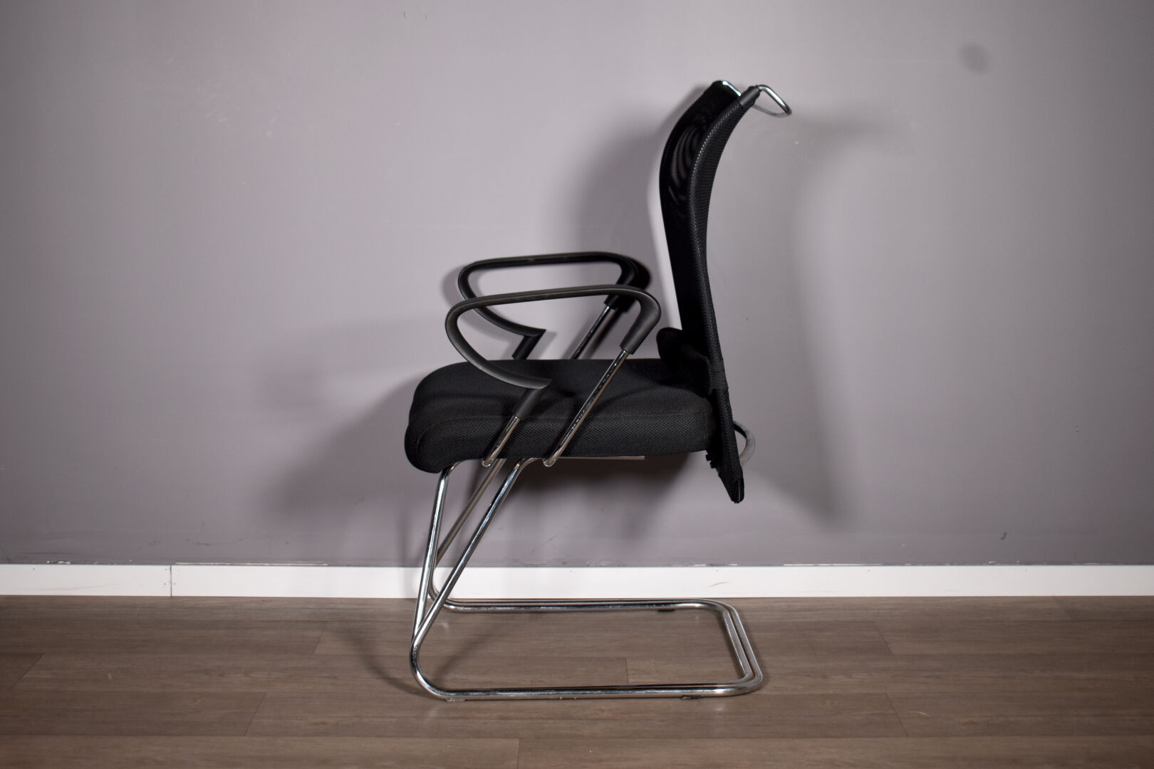 Fauteuil de bureau à garniture de tissu et résille noire. Piétement luge en métal chromé. Années 2000. Haut. : 100 cm.