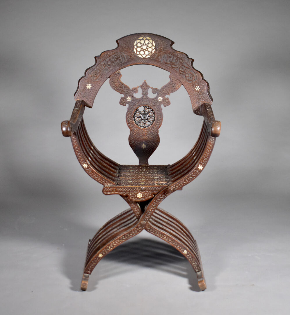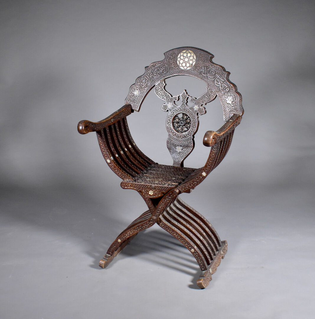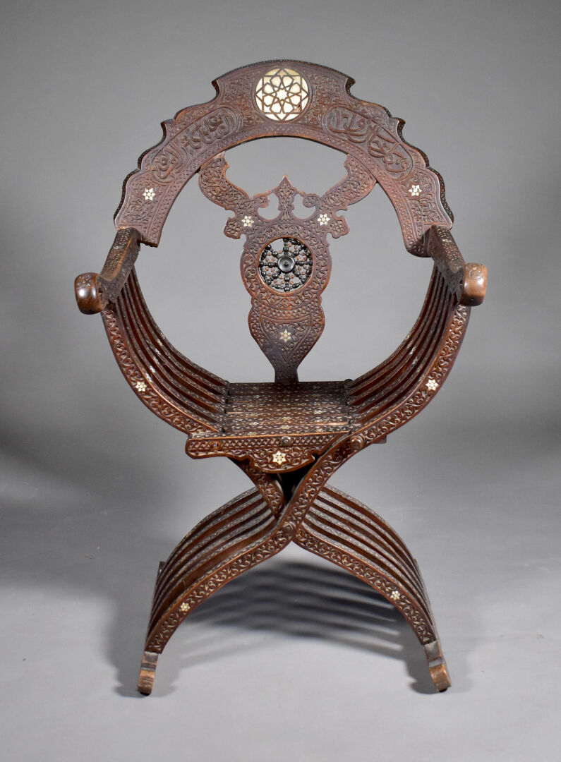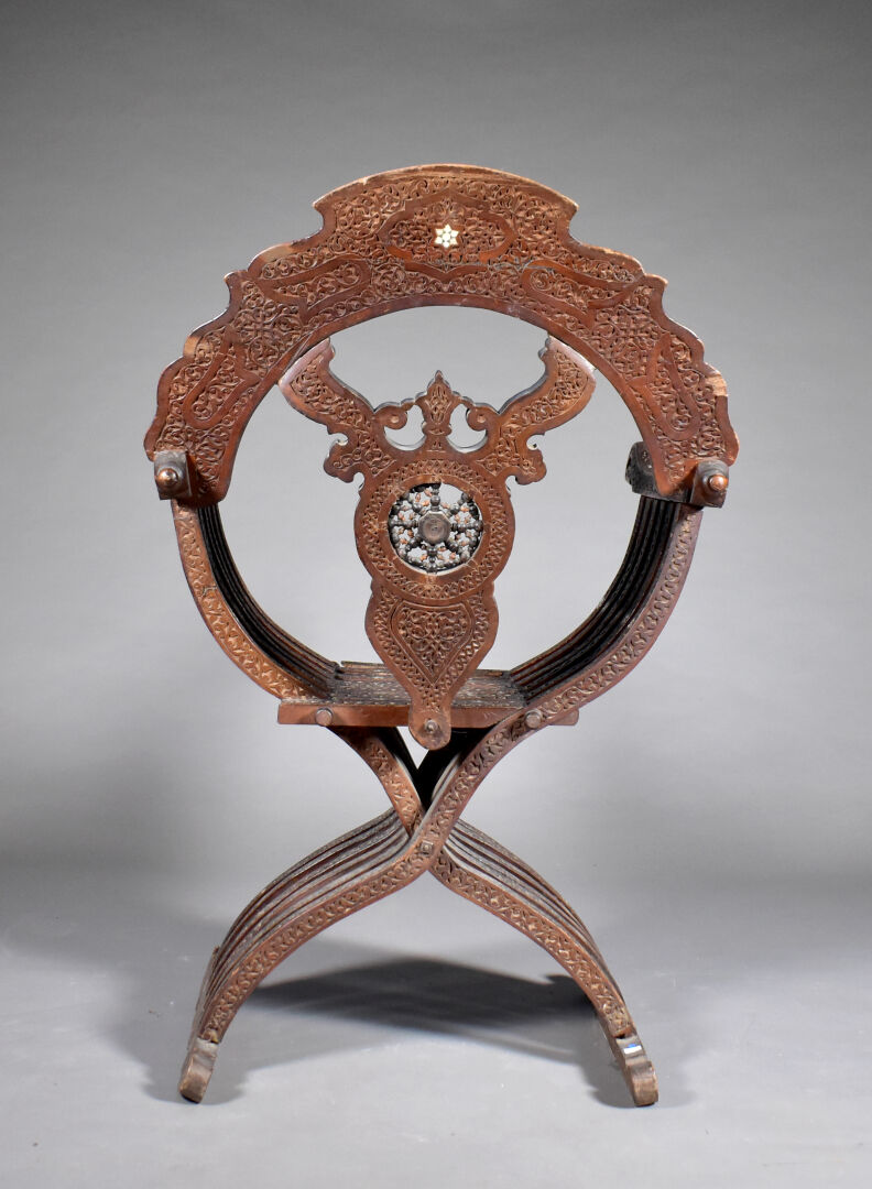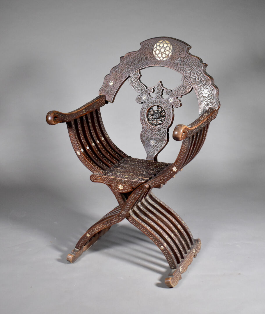 Fauteuil en bois sculpté à décor incrusté de nacre, le dossier orné d’une étoile (manques). Travail Syrien du début du XXe siècle. Haut. : 109 cm.