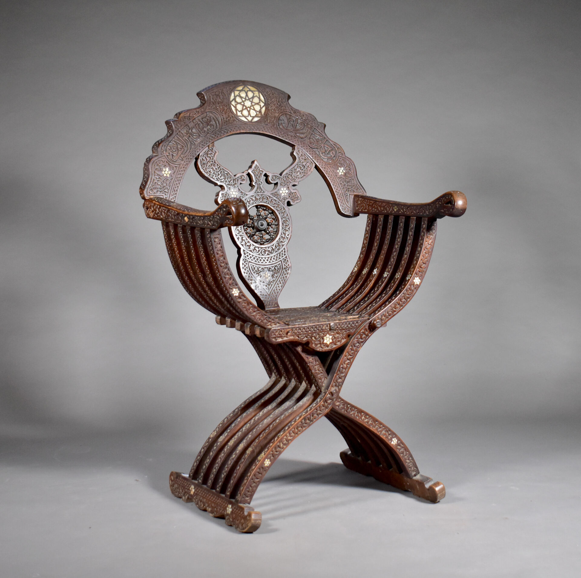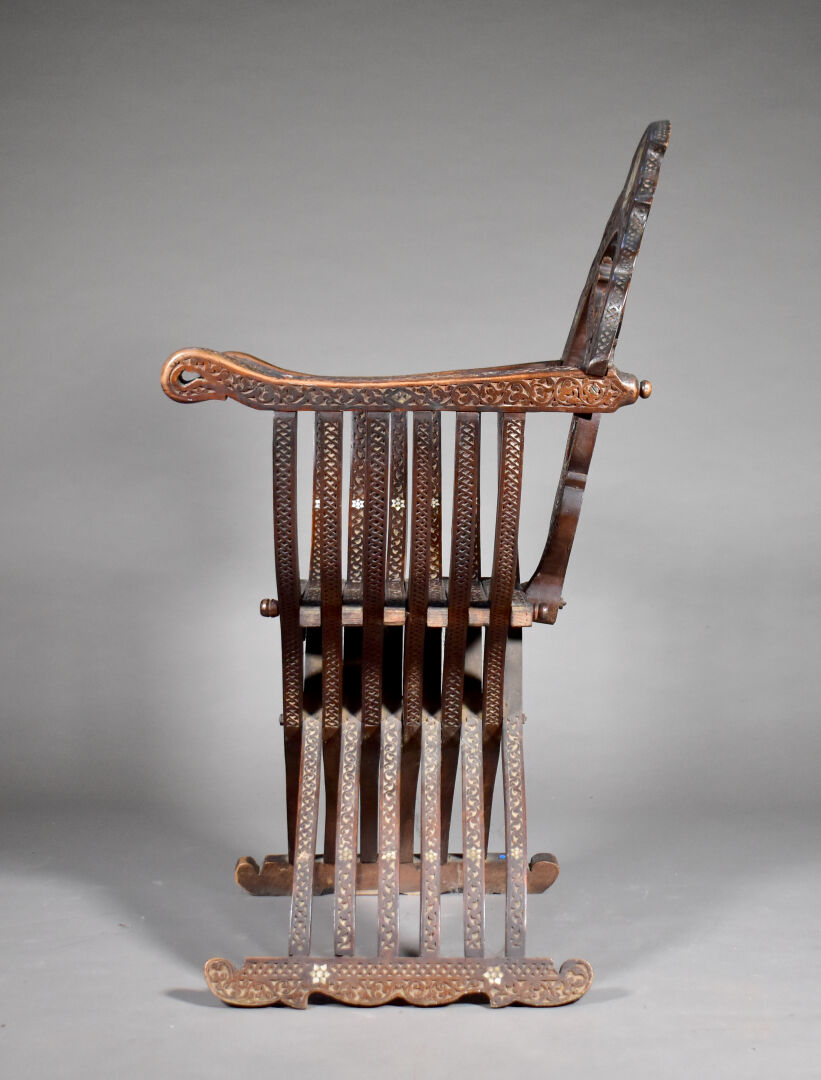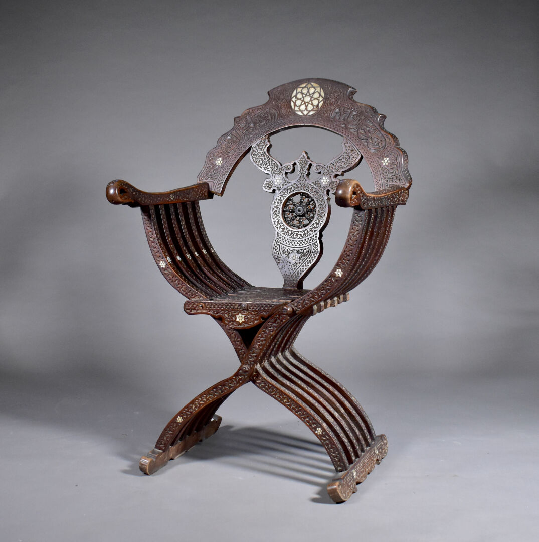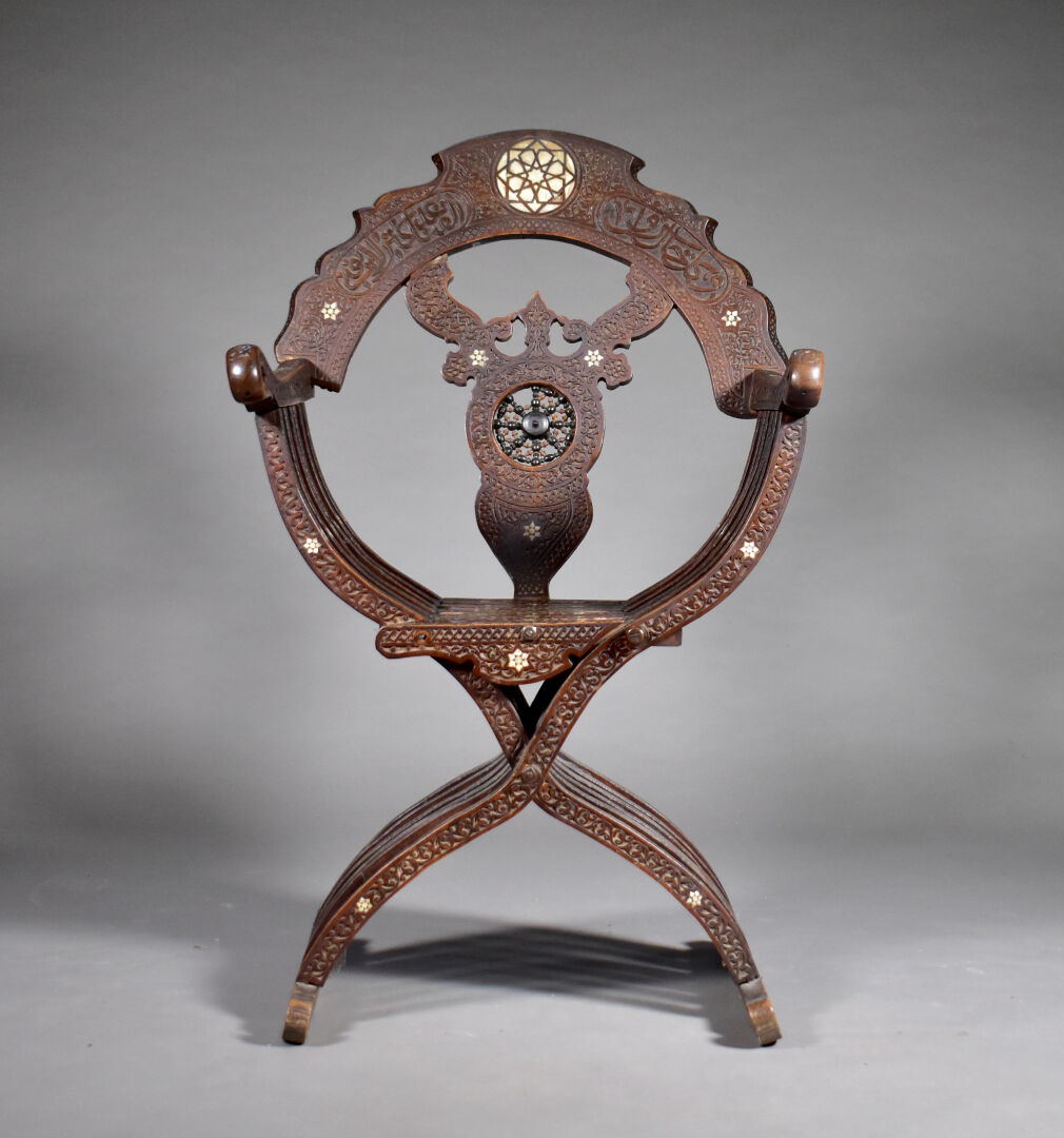 Fauteuil en bois sculpté à décor incrusté de nacre, le dossier orné d’une étoile (manques). Travail Syrien du début du XXe siècle. Haut. : 109 cm.