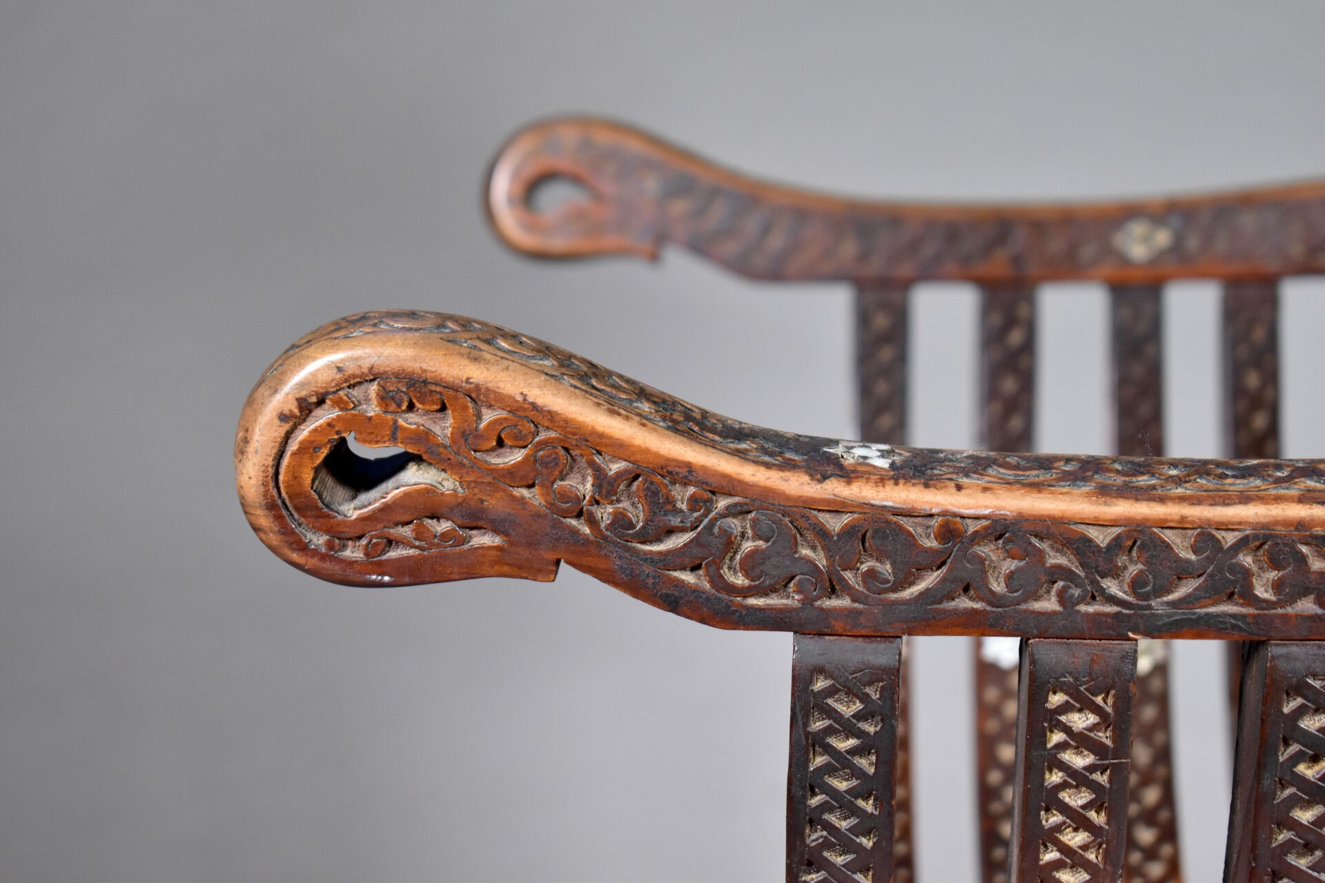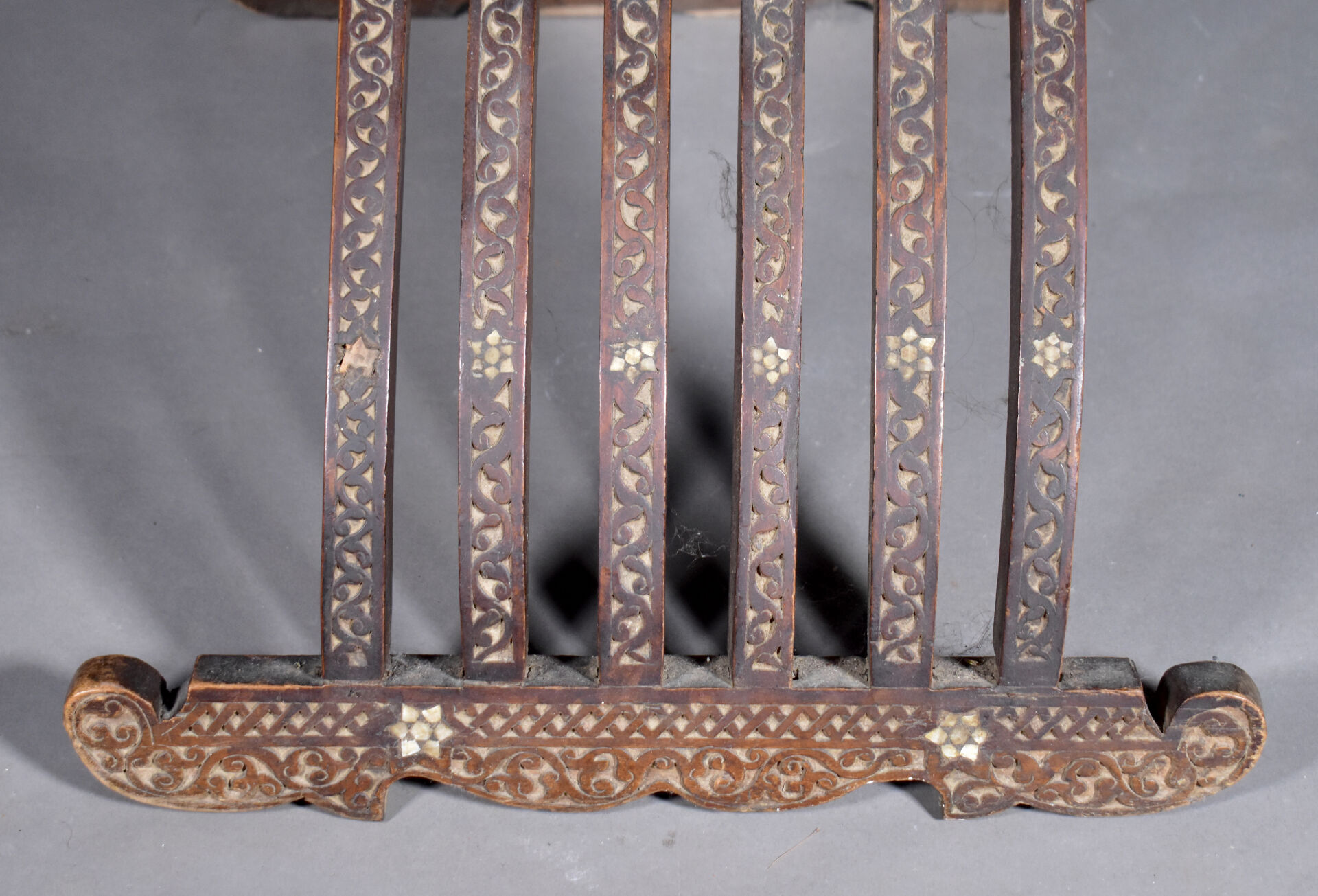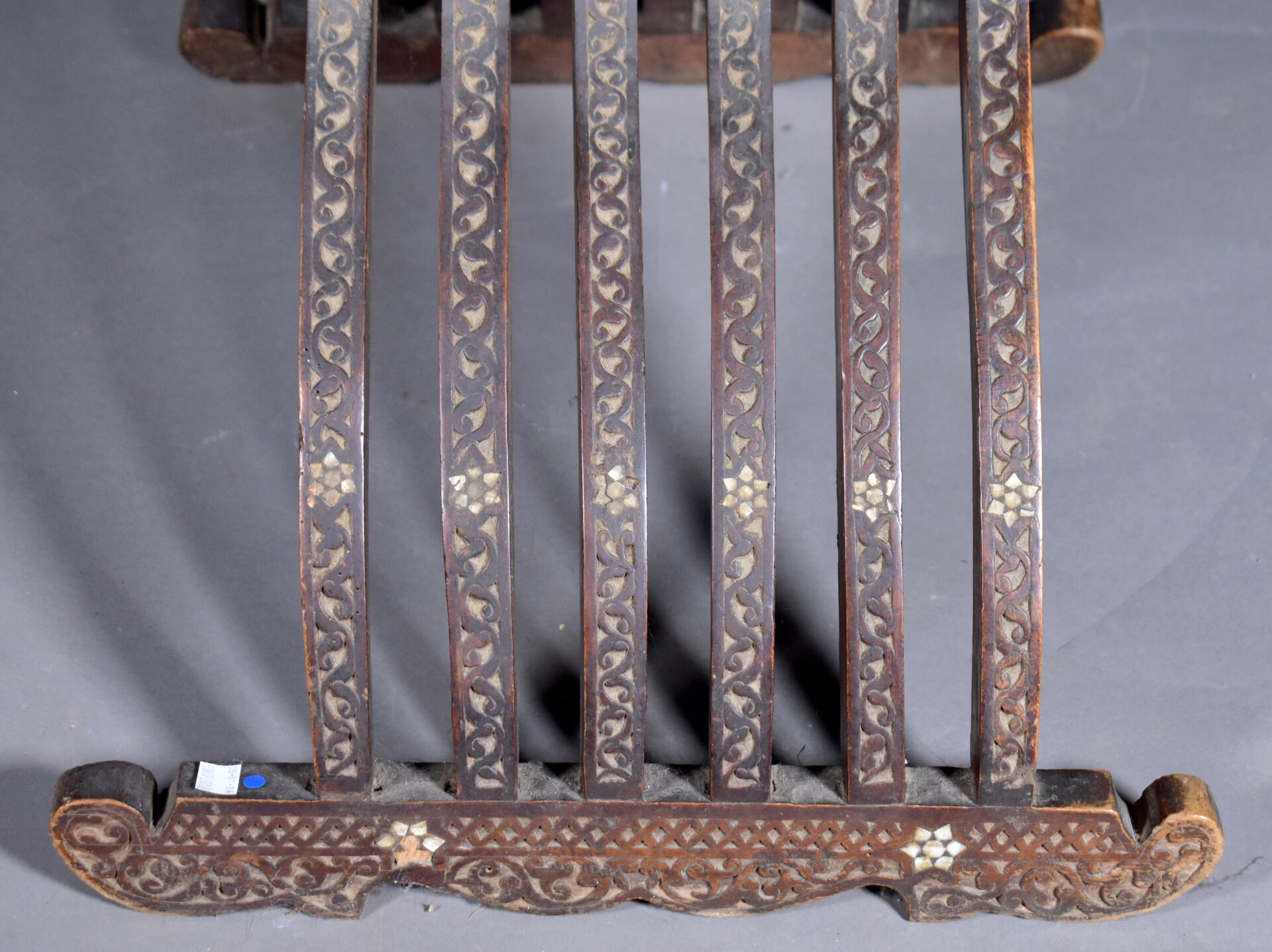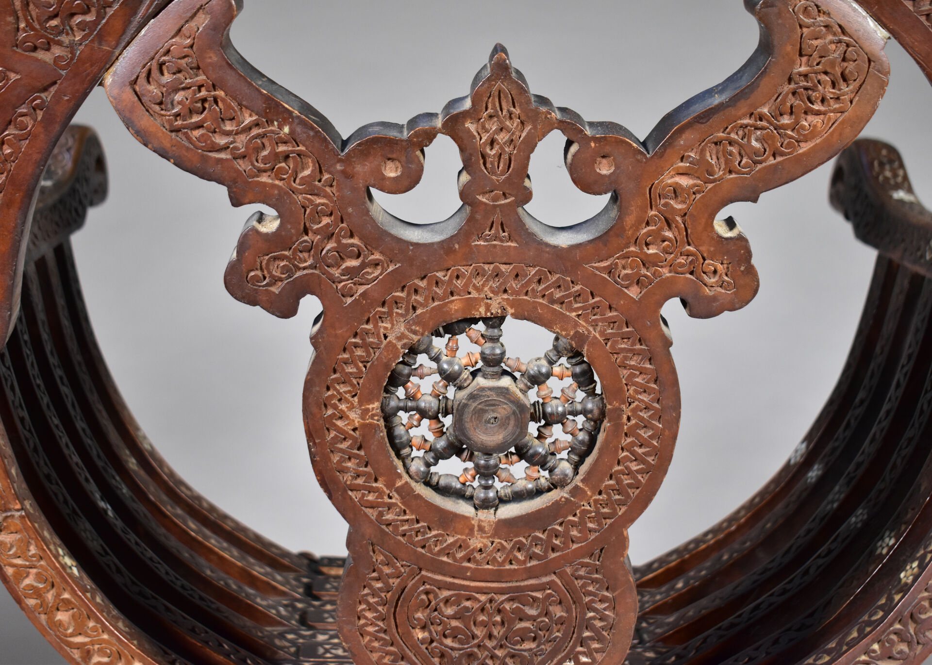 Fauteuil en bois sculpté à décor incrusté de nacre, le dossier orné d’une étoile (manques). Travail Syrien du début du XXe siècle. Haut. : 109 cm.