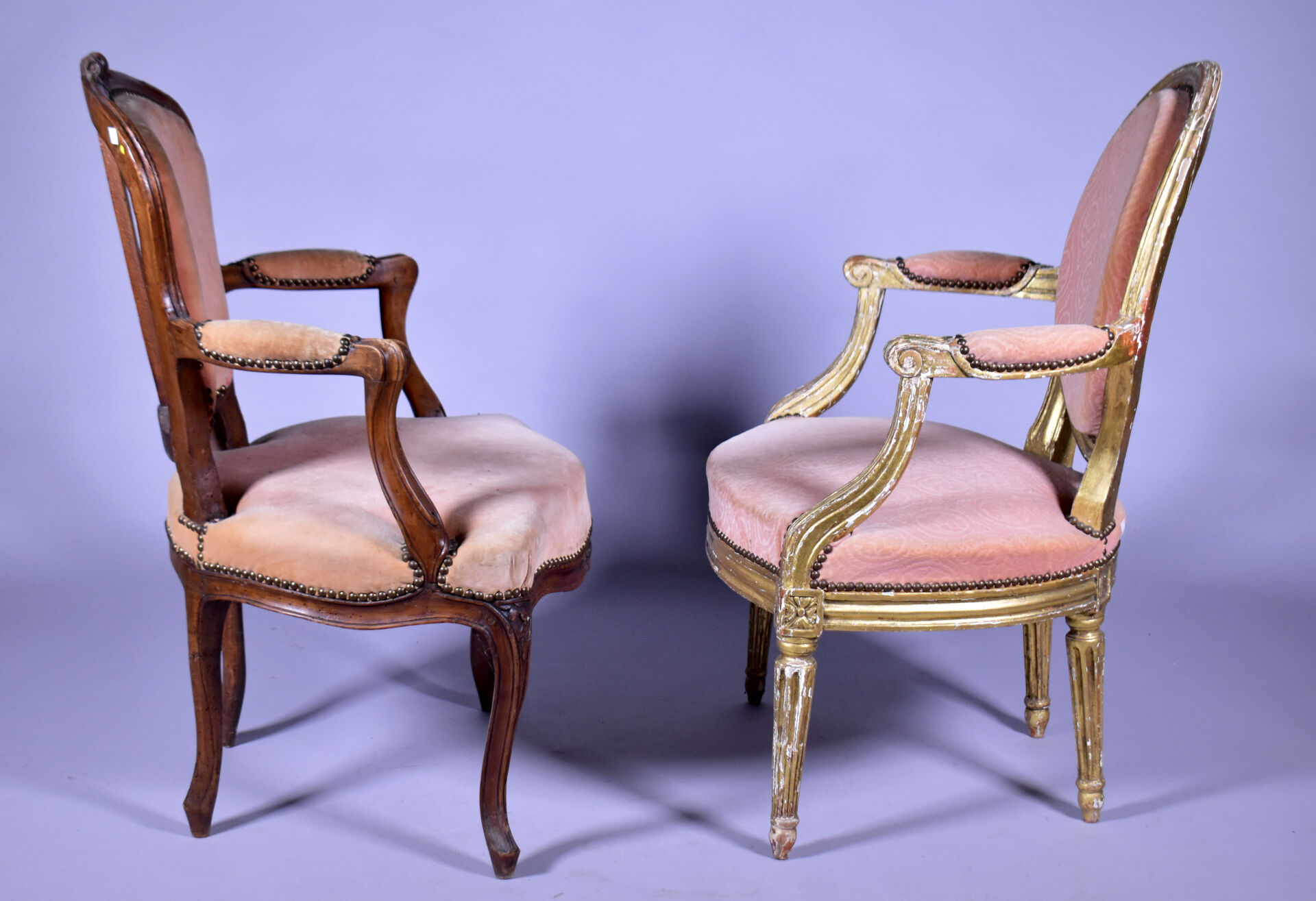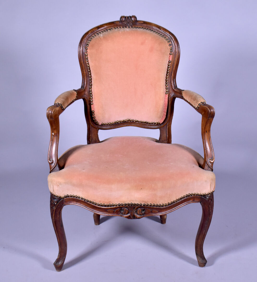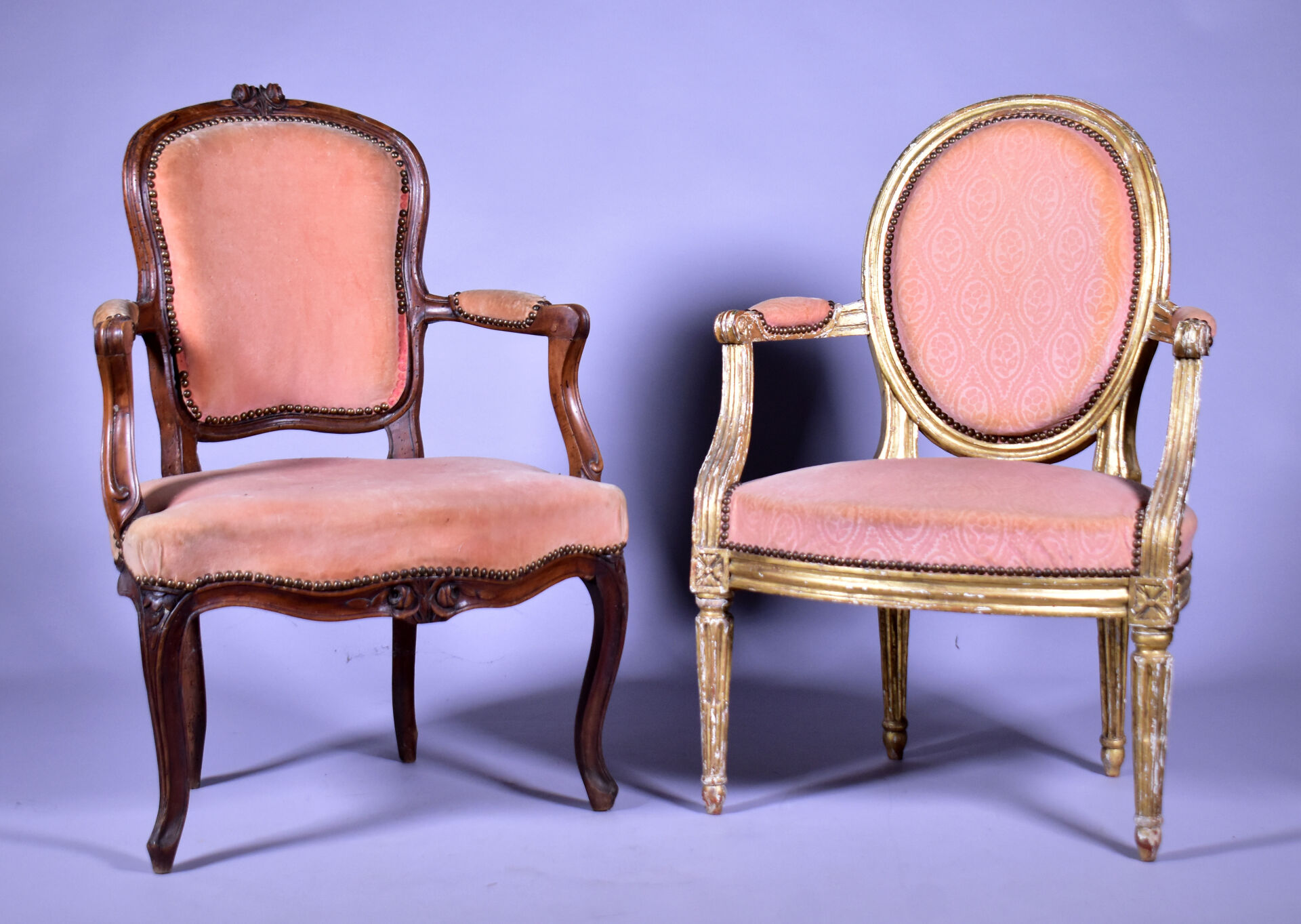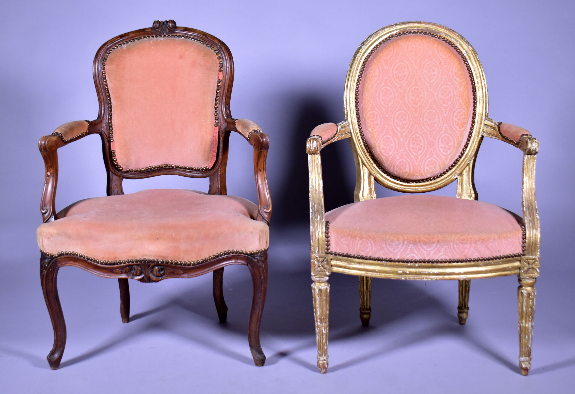 Fauteuil en cabriolet en hêtre mouluré sculpté, les accotoirs à manchettes, les supports en coup de fouet, les pieds cambrés à larges moulures (usures et restaurations). Epoque Louis XV. Garniture de velours rose postérieure. Haut. : 89 cm. On joint un fauteuil médaillon en bois sculpté doré à pieds cannelés. Style Louis XVI. Haut. : 87 cm.