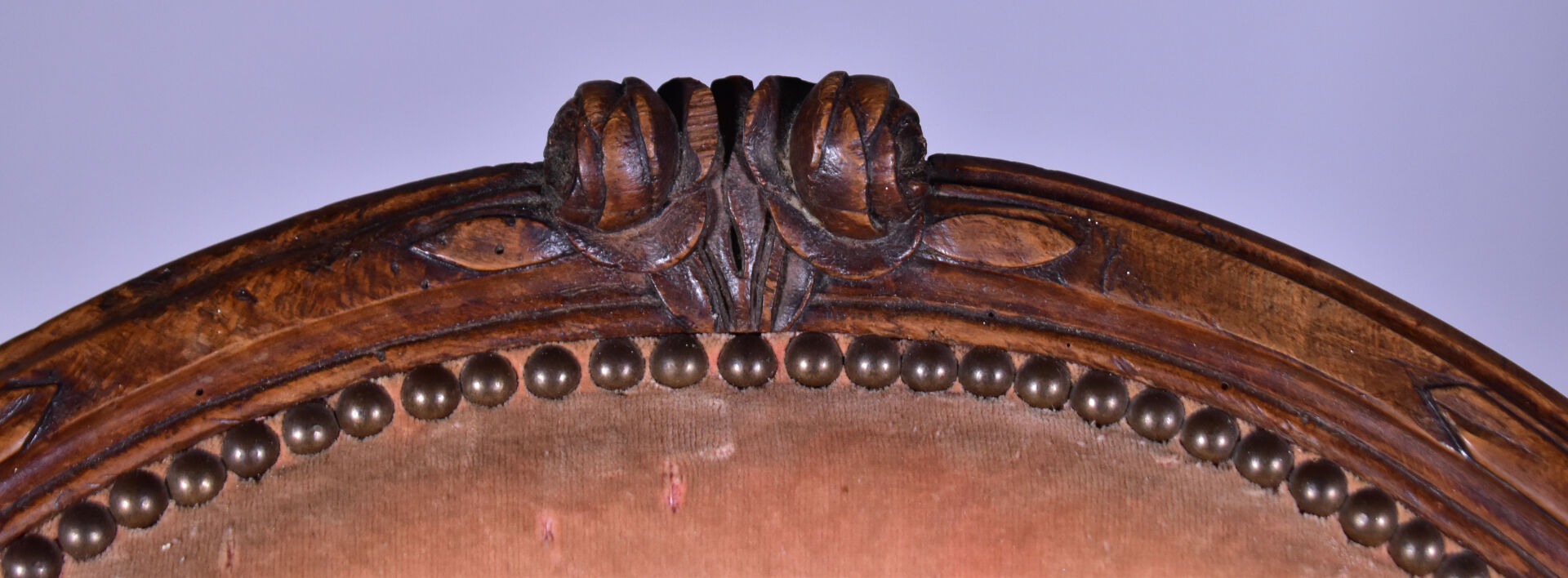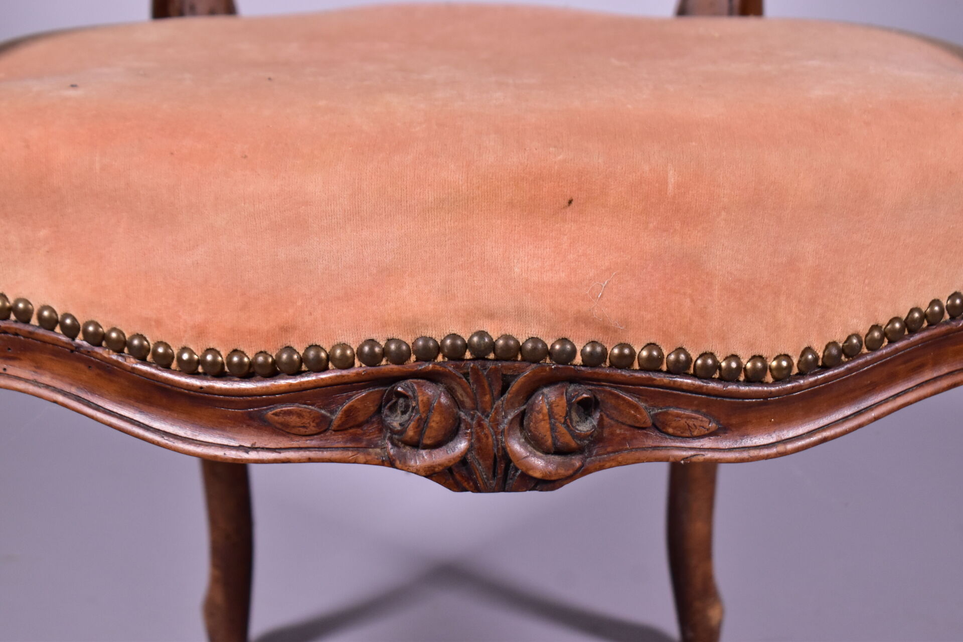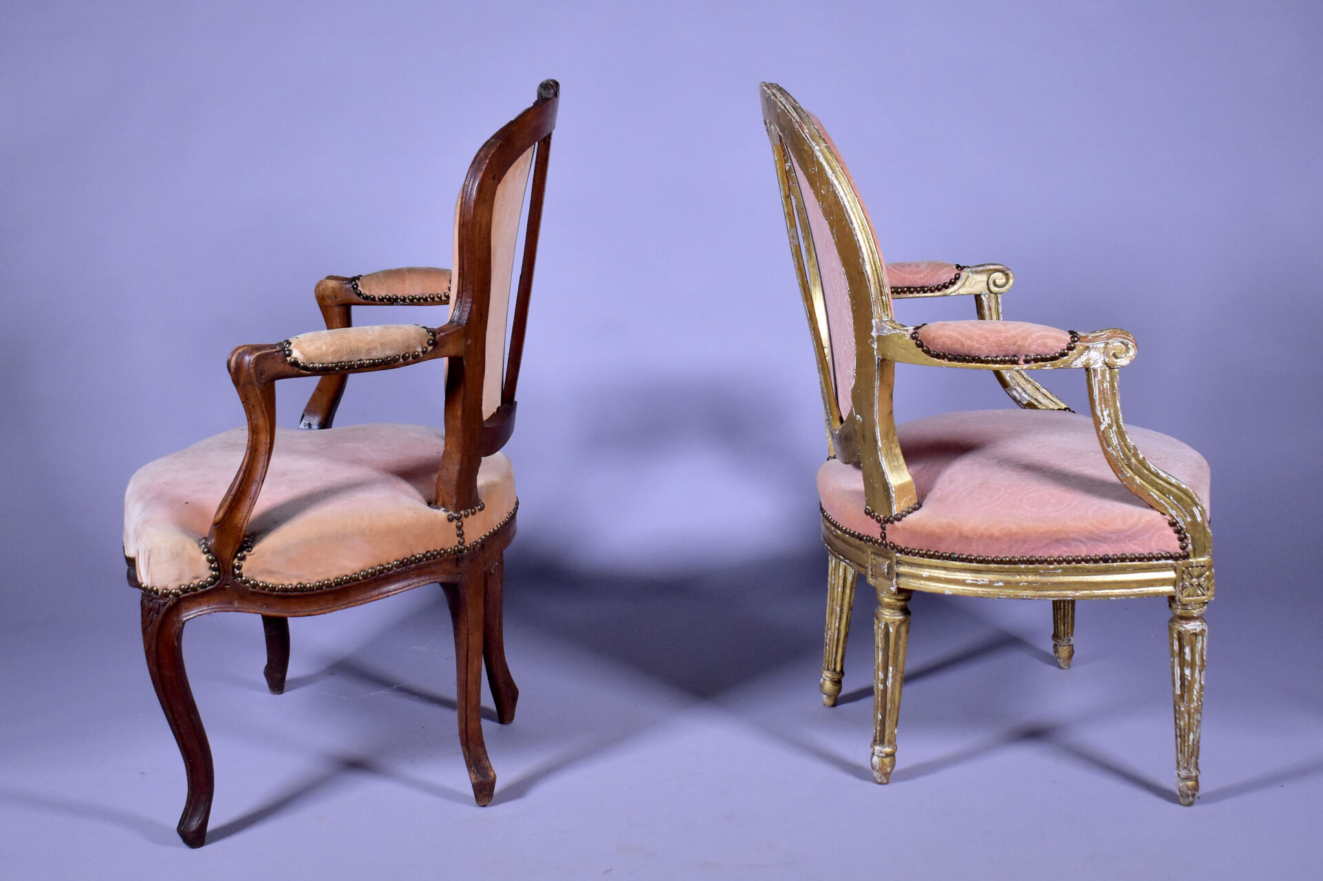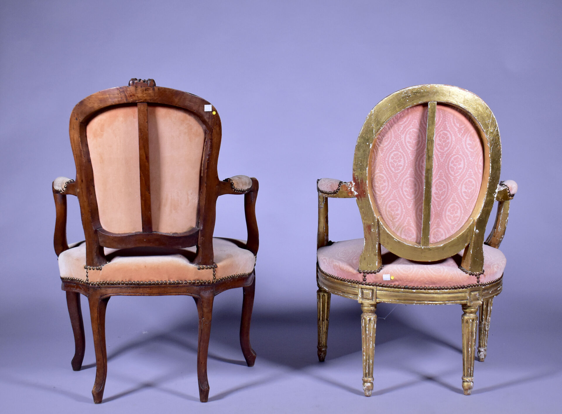 Fauteuil en cabriolet en hêtre mouluré sculpté, les accotoirs à manchettes, les supports en coup de fouet, les pieds cambrés à larges moulures (usures et restaurations). Epoque Louis XV. Garniture de velours rose postérieure. Haut. : 89 cm. On joint un fauteuil médaillon en bois sculpté doré à pieds cannelés. Style Louis XVI. Haut. : 87 cm.