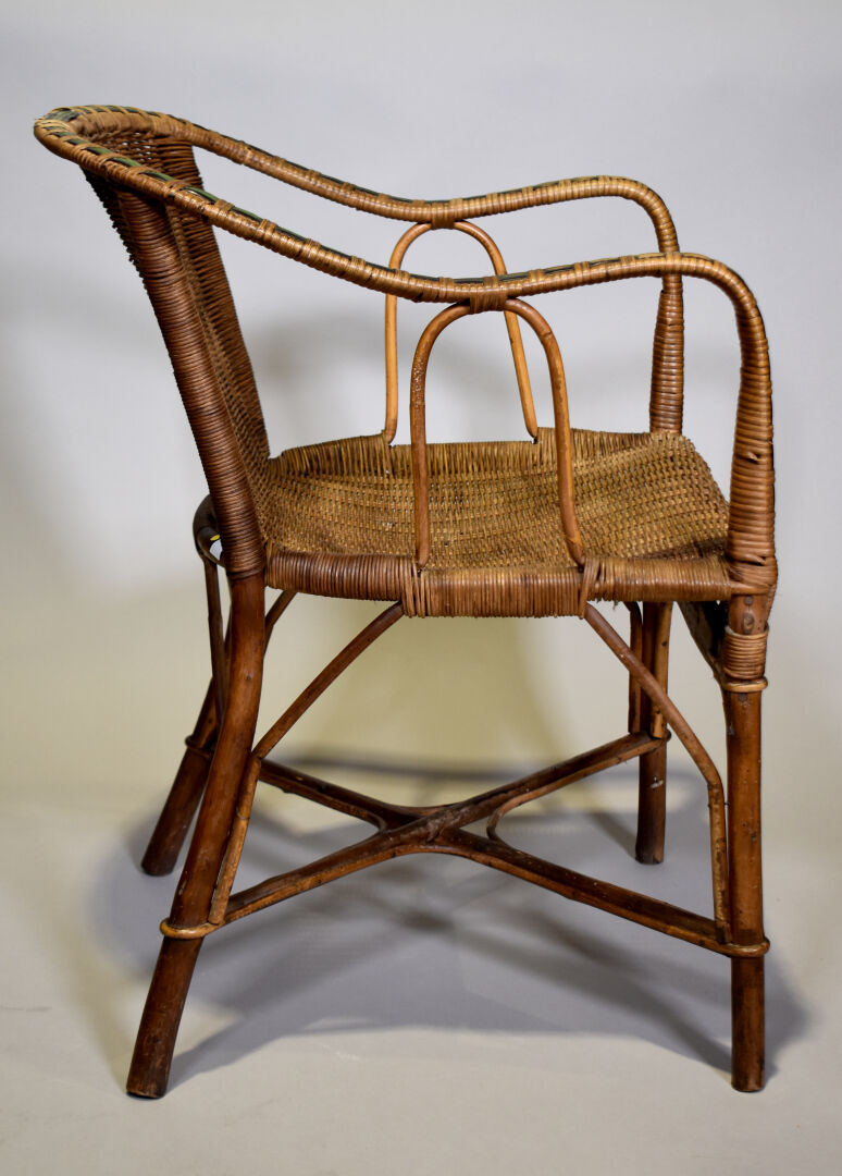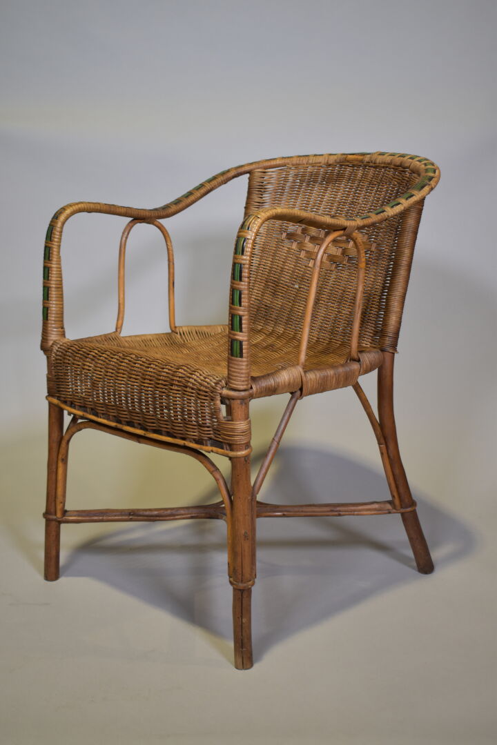 Fauteuil en rotin tressé et laqué vert (usures). XXe siècle. Haut. : 72,5 cm.