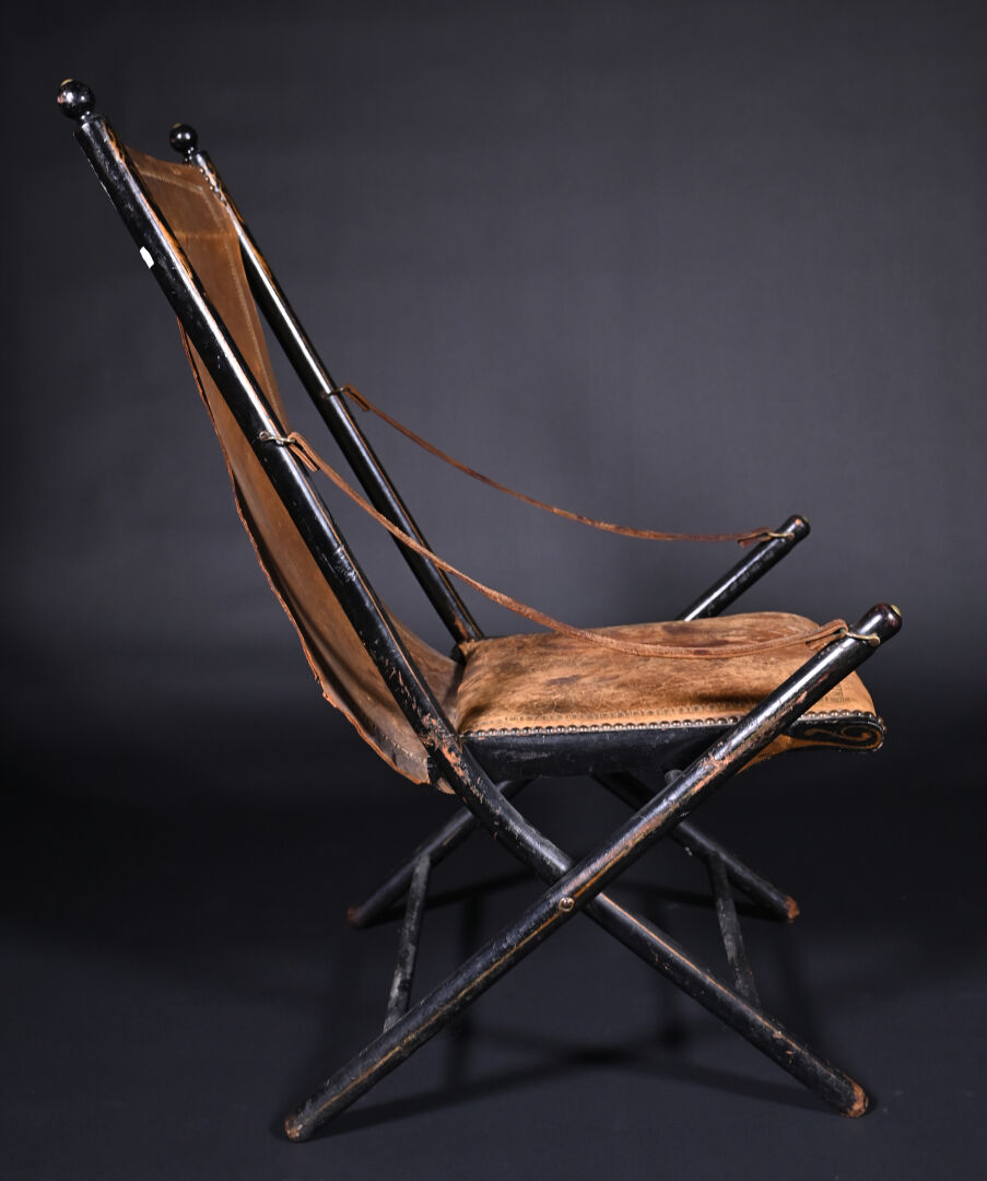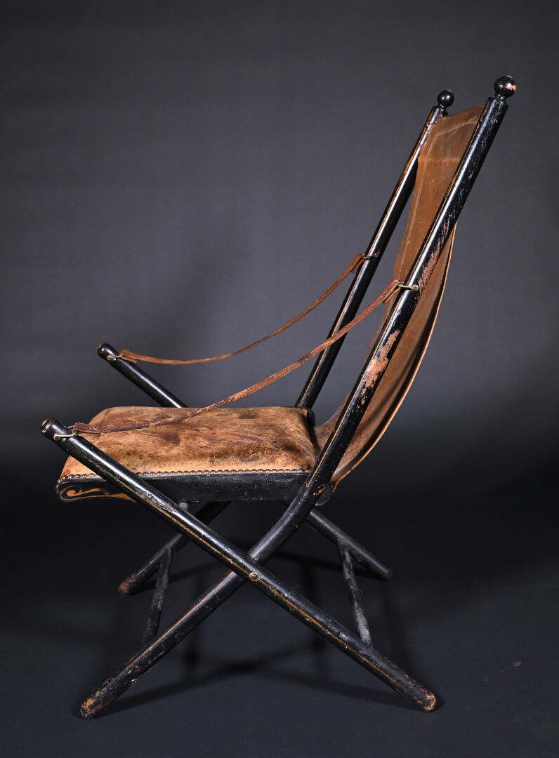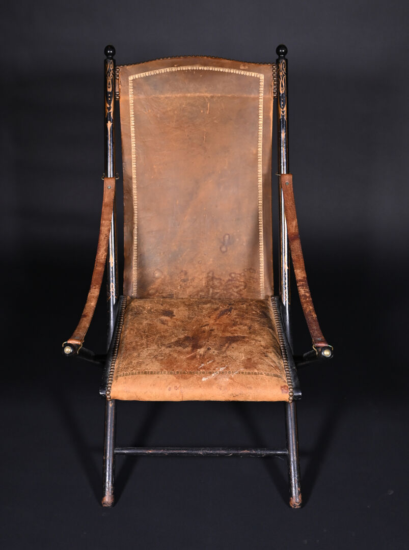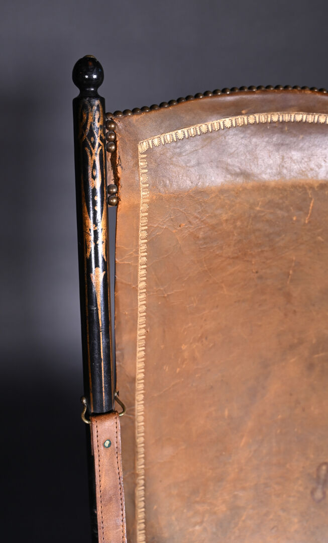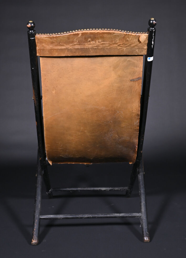 Fauteuil pliant en bois noirci à garniture de cuir fauve doré au petit fer et clouté (usures et mouillures). Travail Anglais de l’époque Victorienne. Haut. : 98 cm.