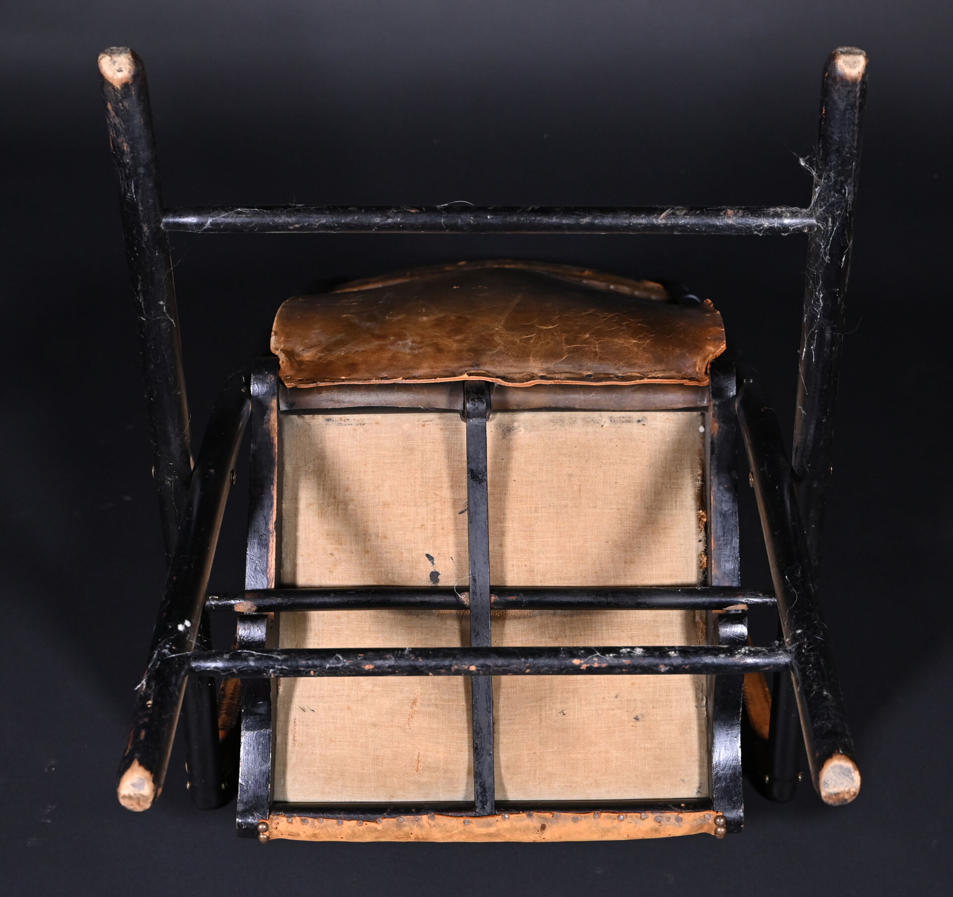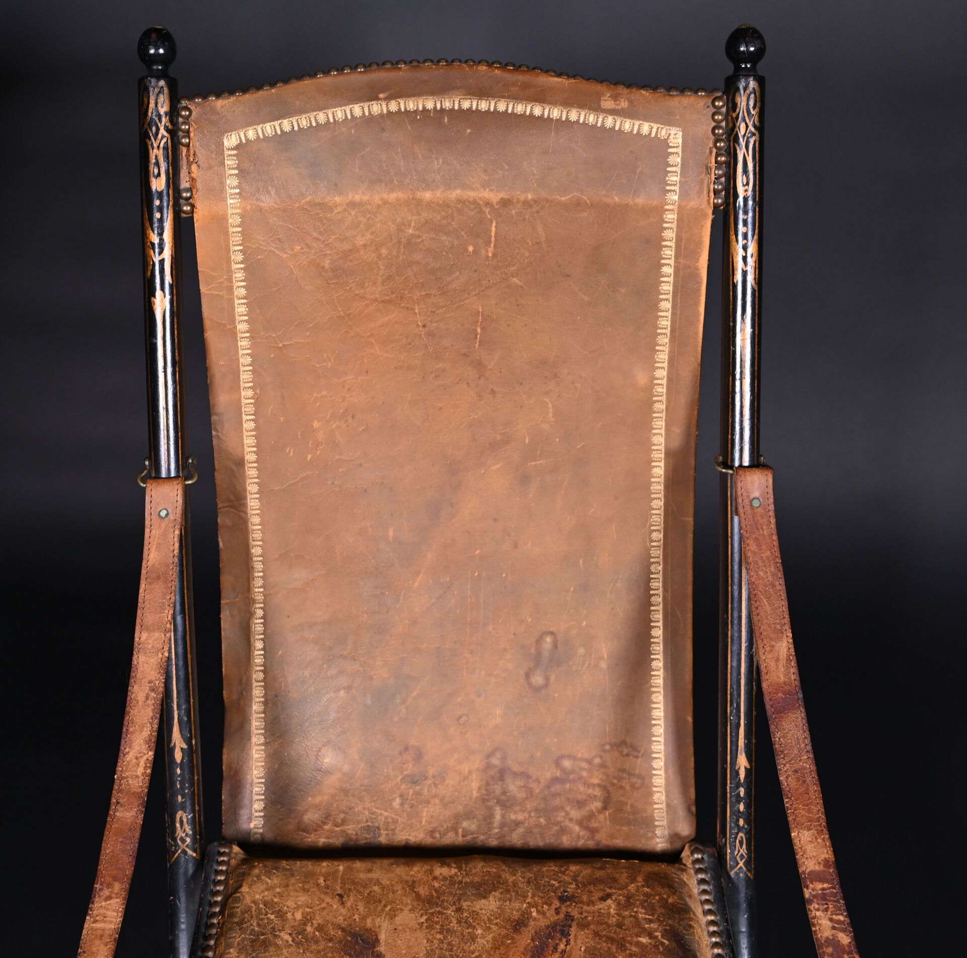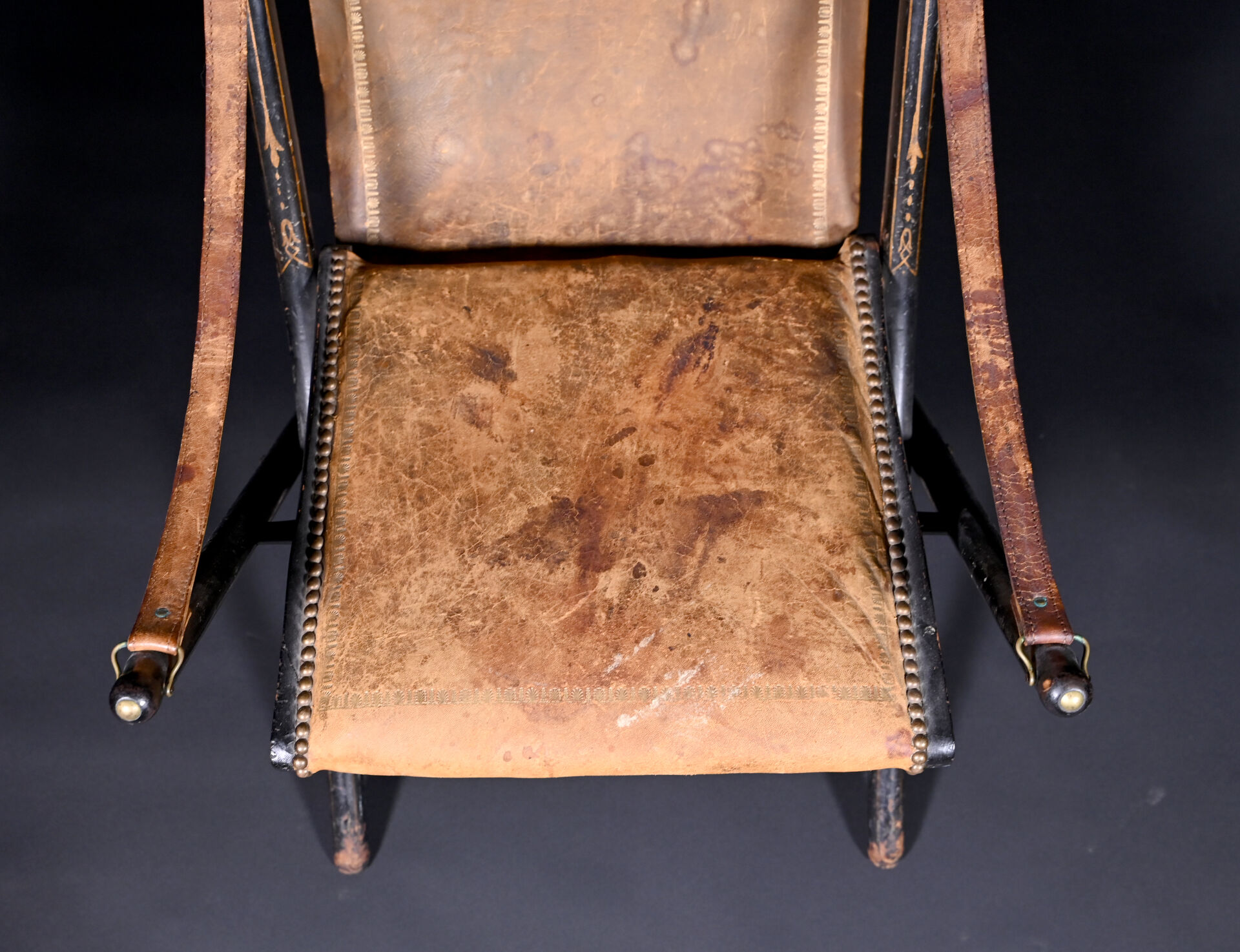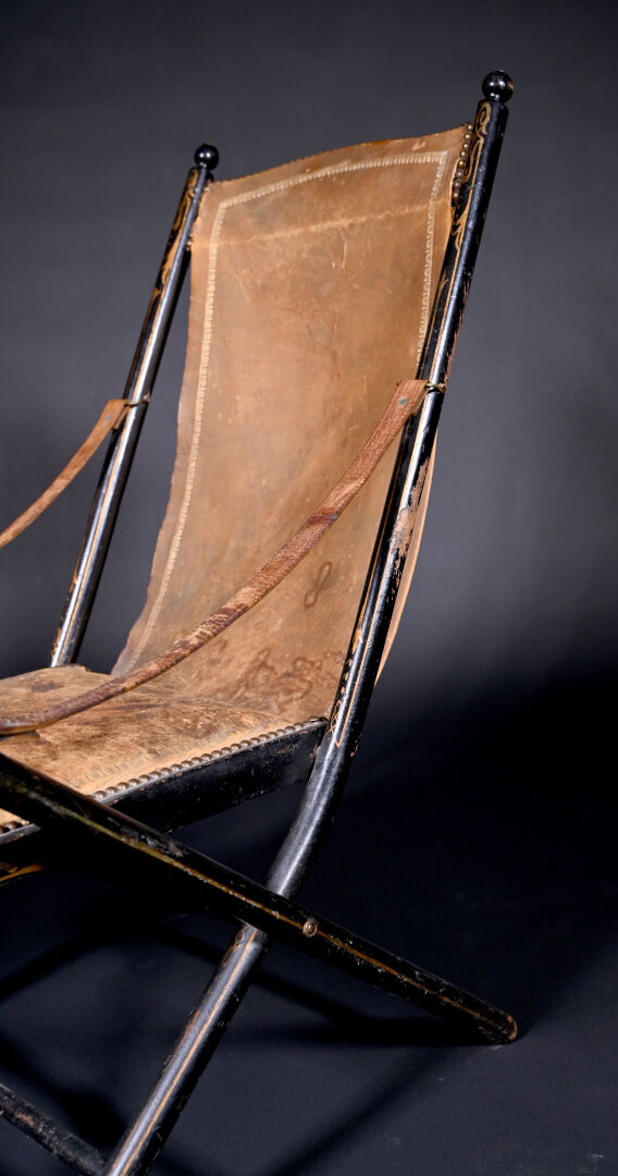 Fauteuil pliant en bois noirci à garniture de cuir fauve doré au petit fer et clouté (usures et mouillures). Travail Anglais de l’époque Victorienne. Haut. : 98 cm.