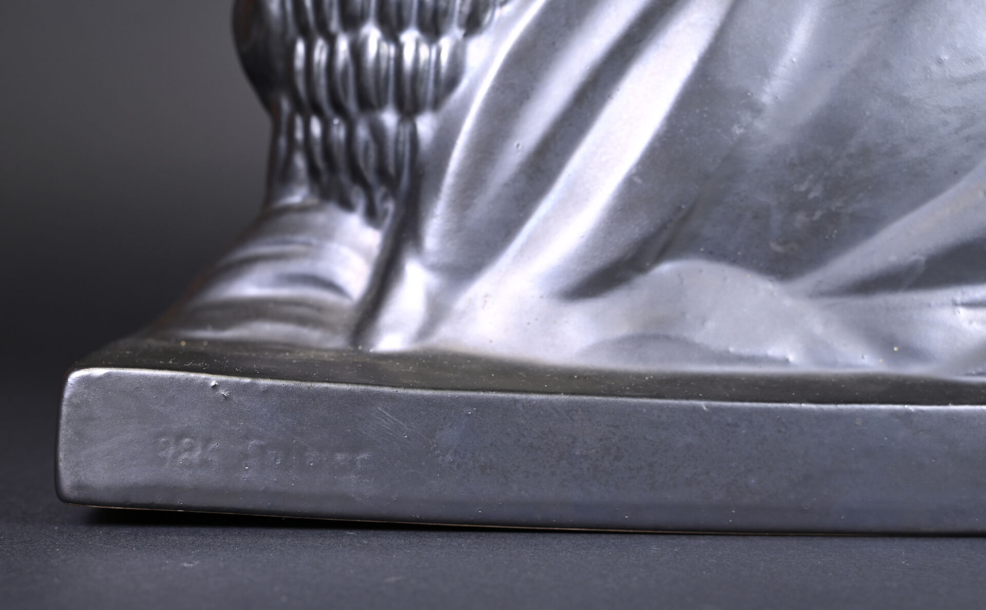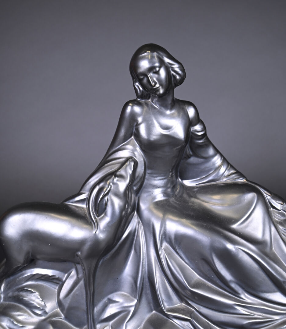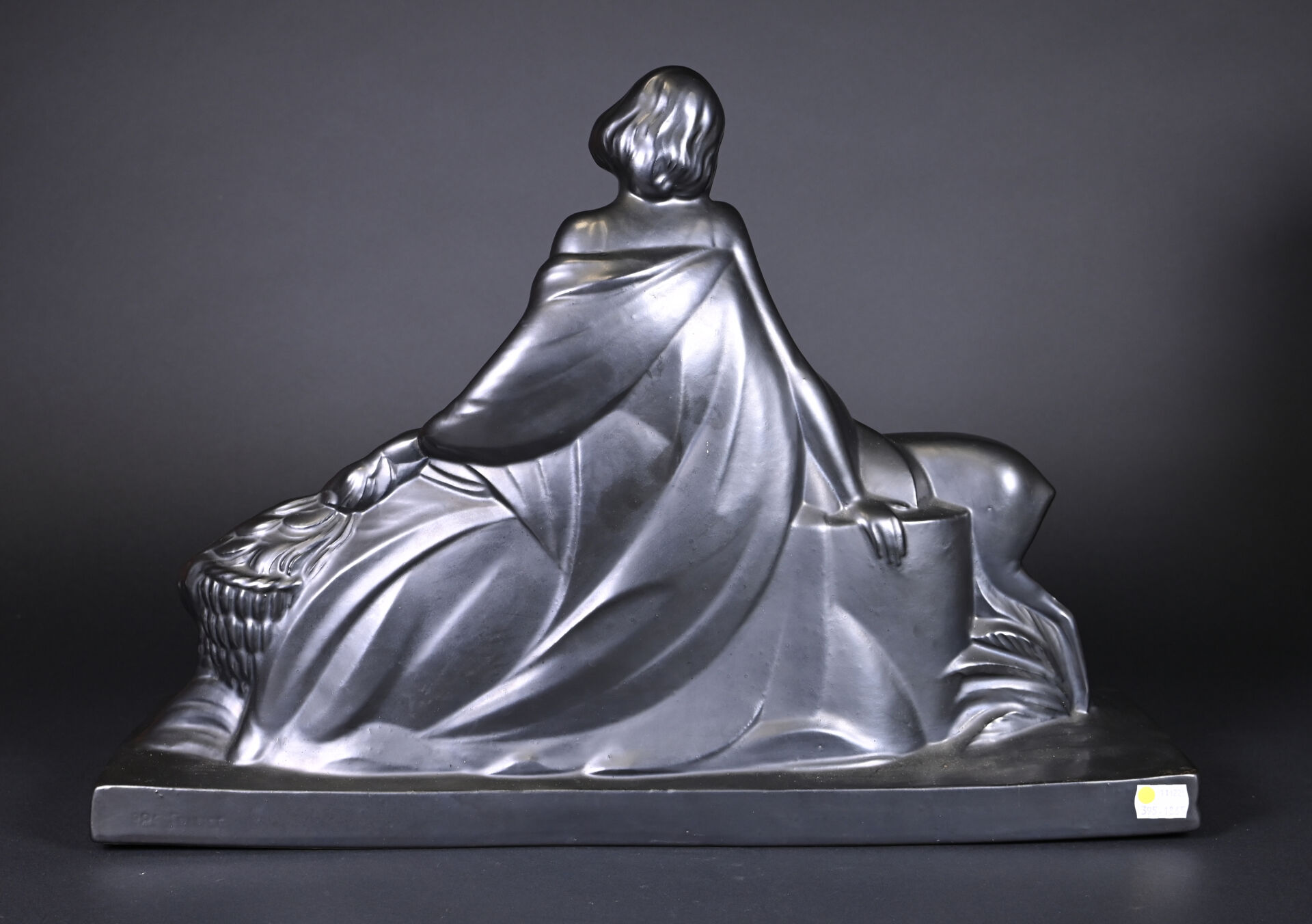 Femme au panier et à la gazelle en céramique émaillée noir à reflets irisés. Vers 1930/1940. Haut. : 38,5 cm – Larg. : 54 cm – Prof. : 18 cm.