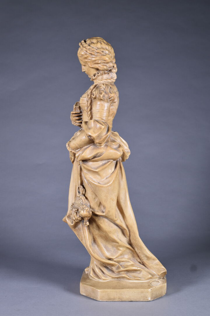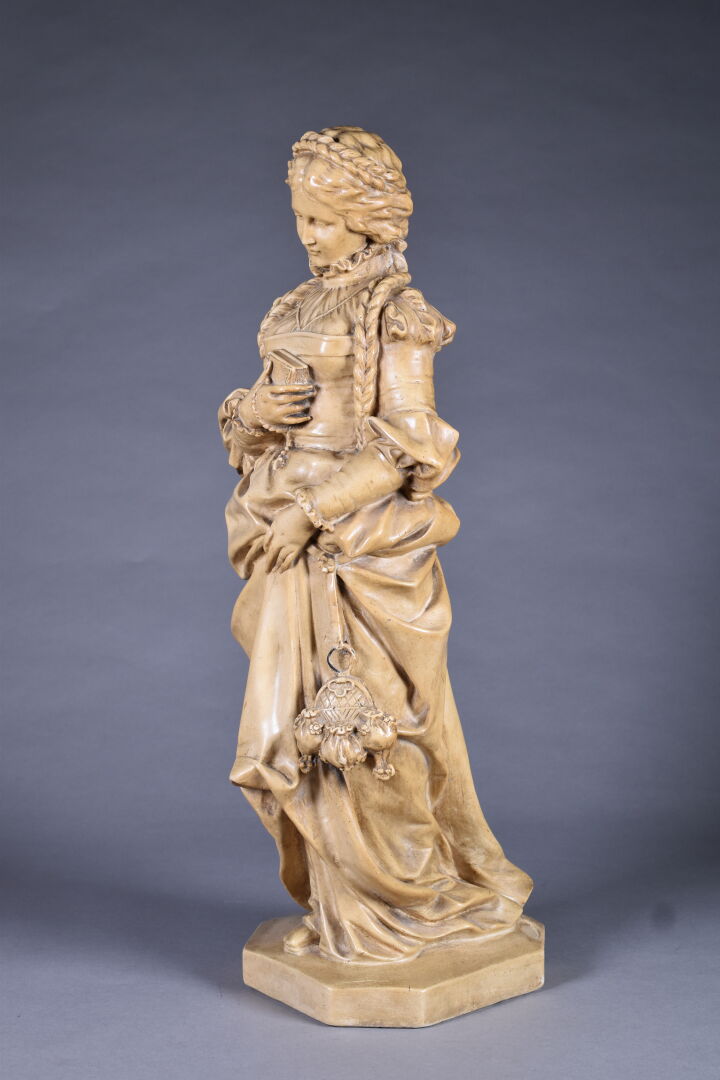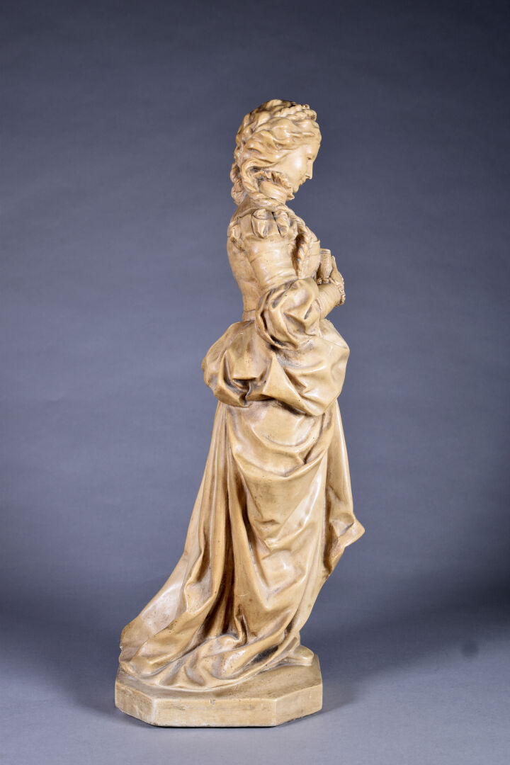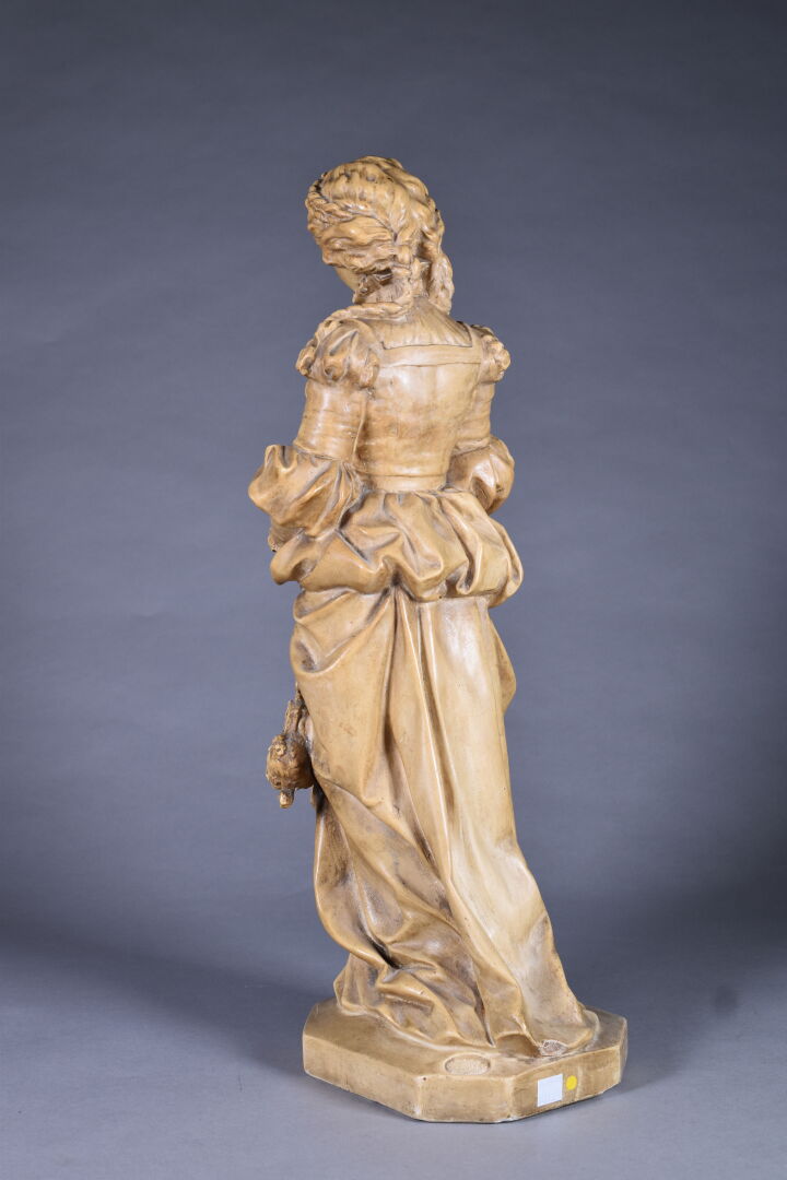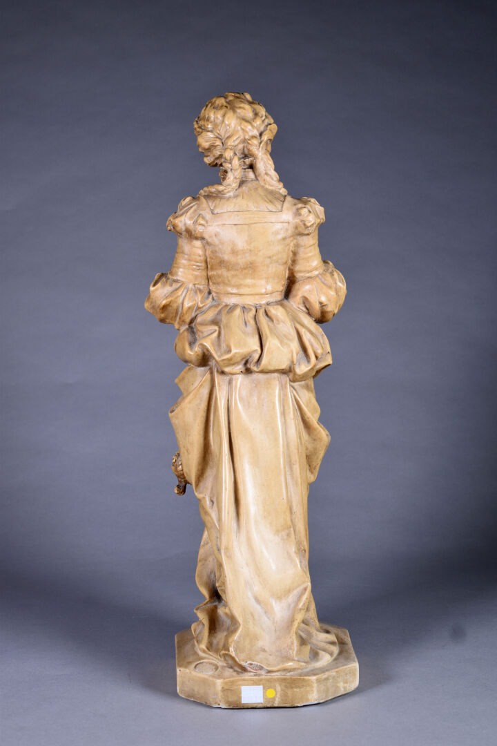 Figure en plâtre patiné ocre représentant une élégante dans le goût de la Renaissance (quelques manques). Haut. : 59 cm.