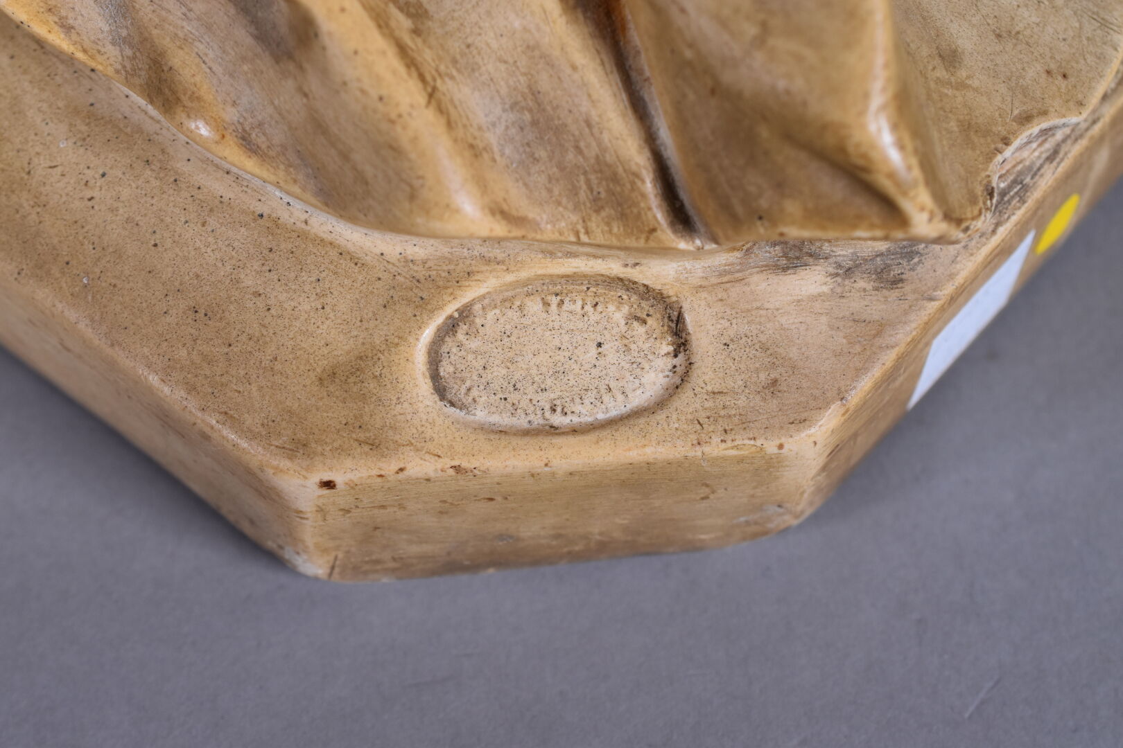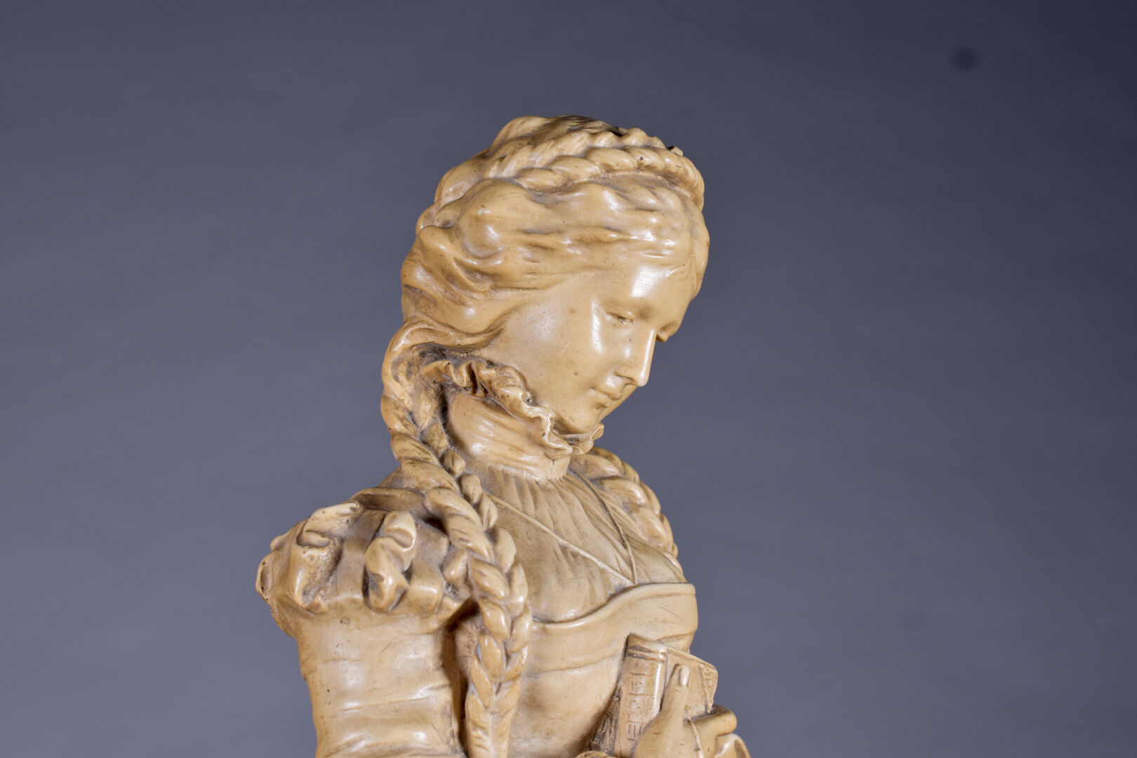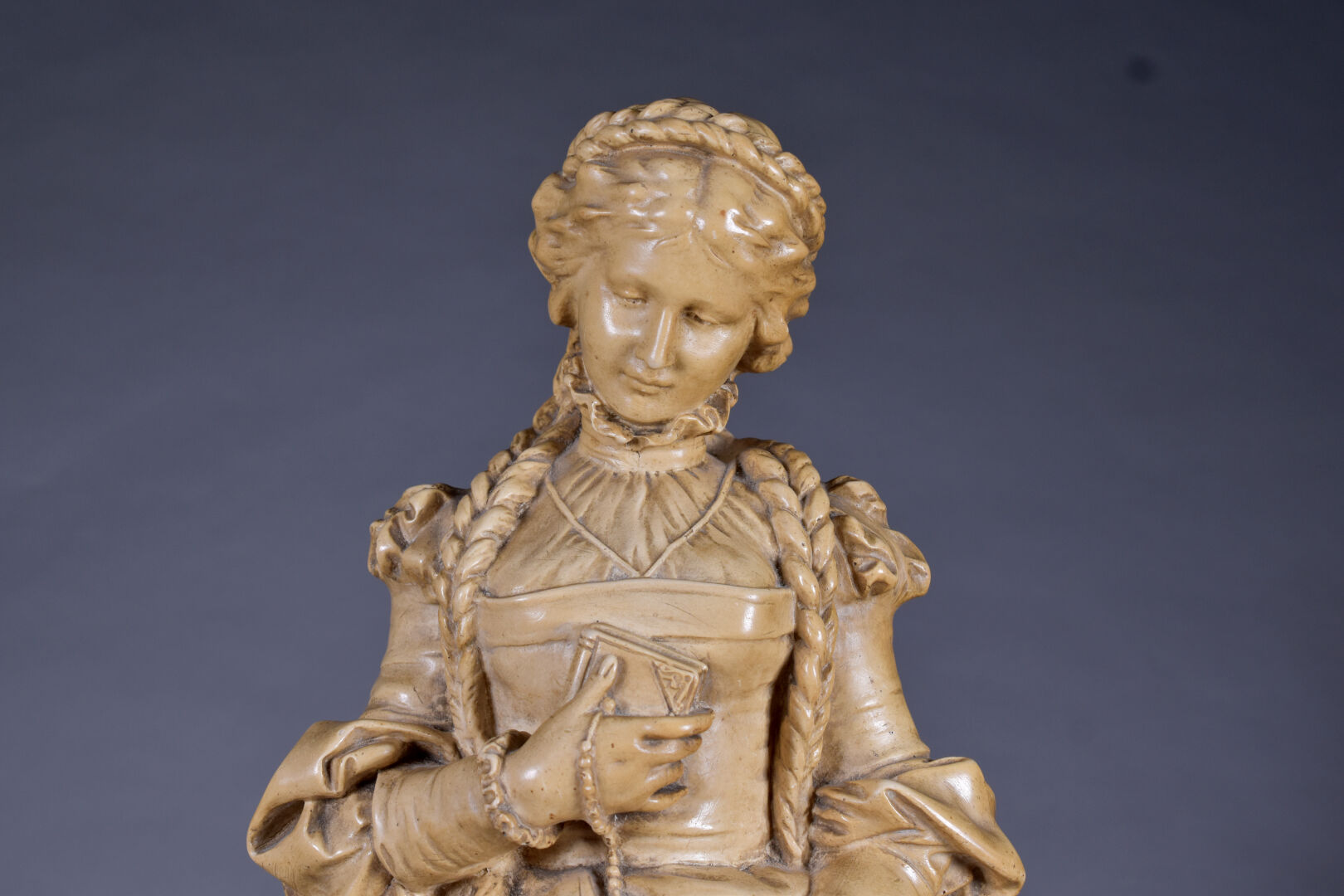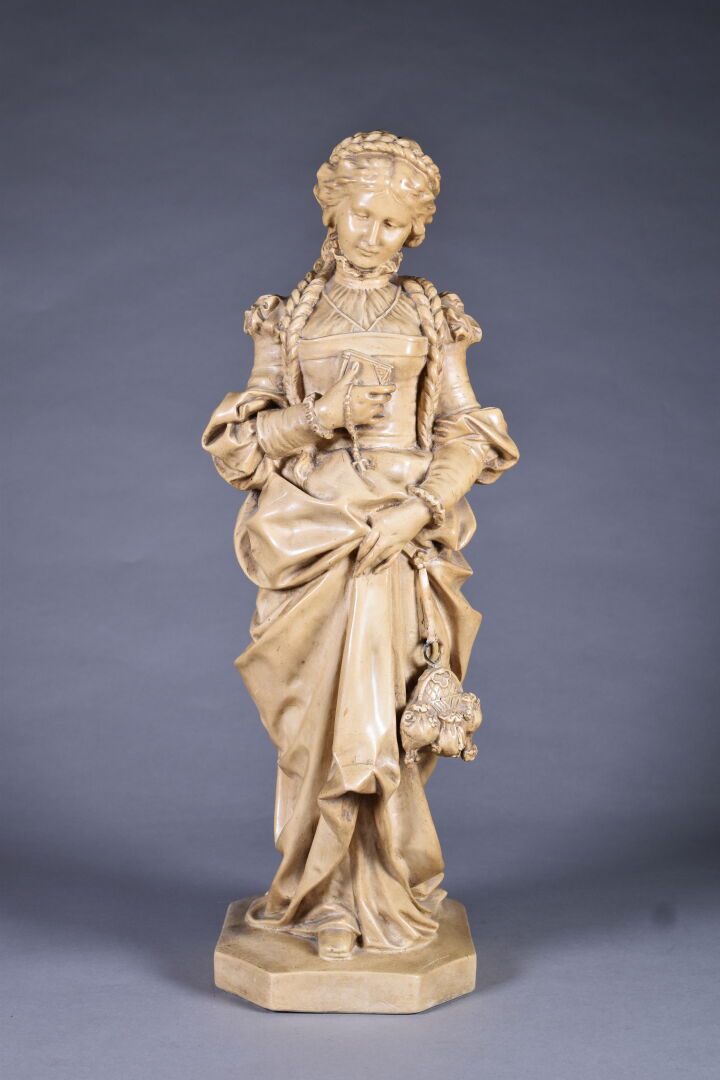 Figure en plâtre patiné ocre représentant une élégante dans le goût de la Renaissance (quelques manques). Haut. : 59 cm.