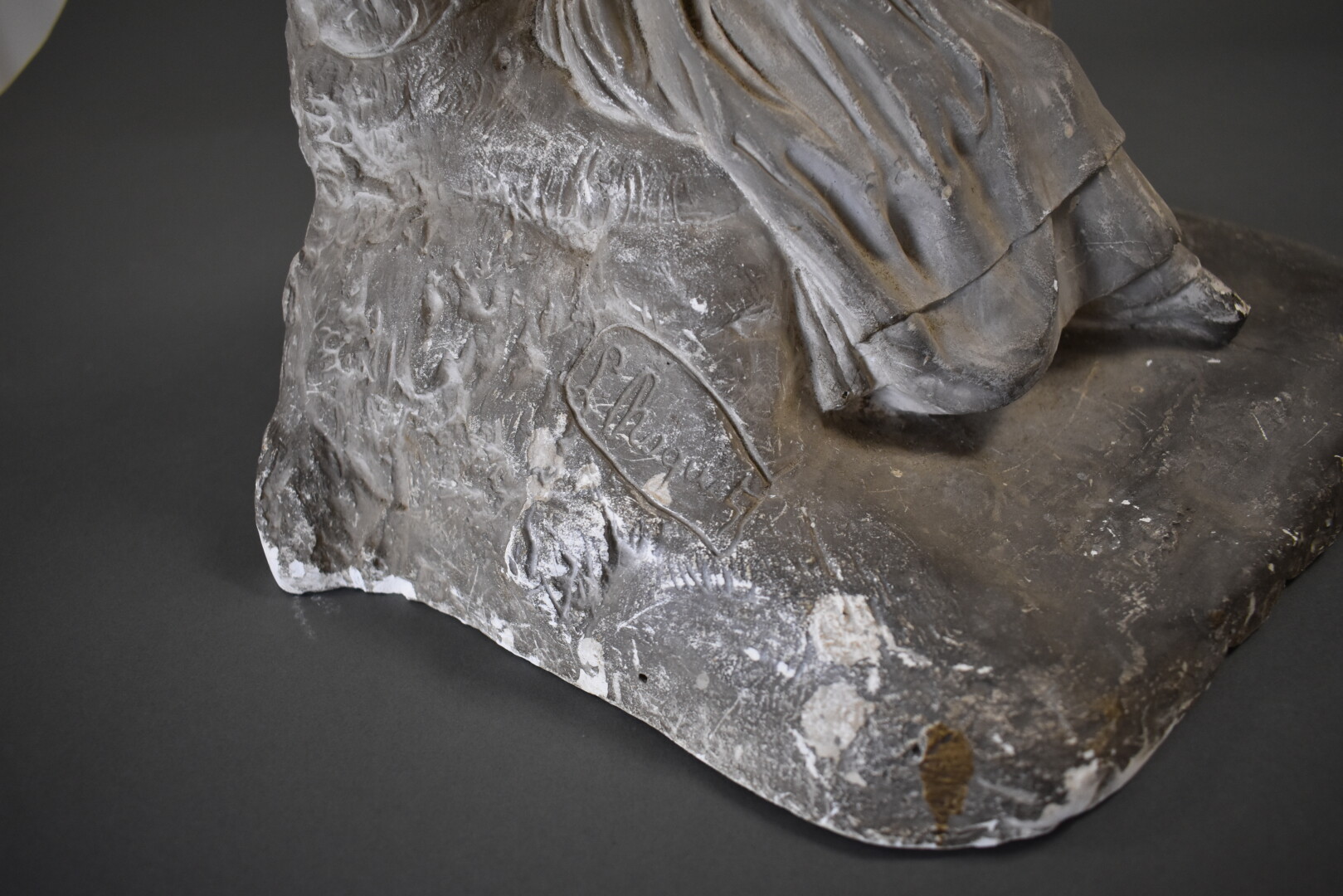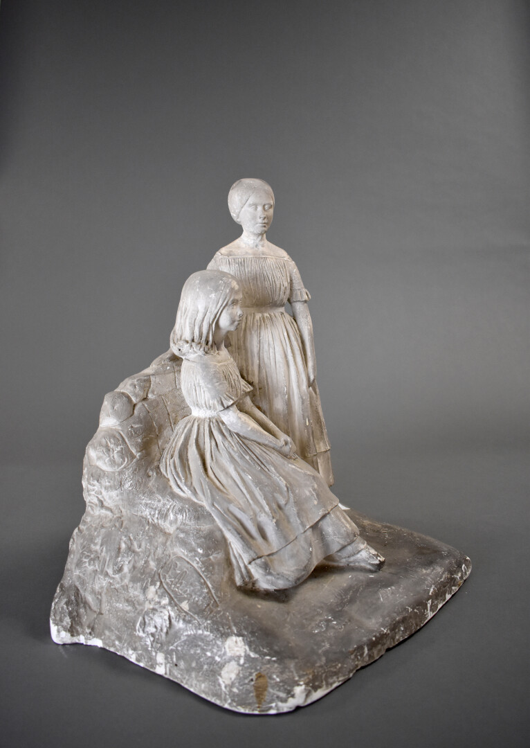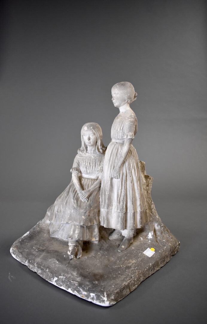 Figure en plâtre représentant deux jeunnes filles (éclats). Début du XXe siècle. Haut. : 39 cm.
