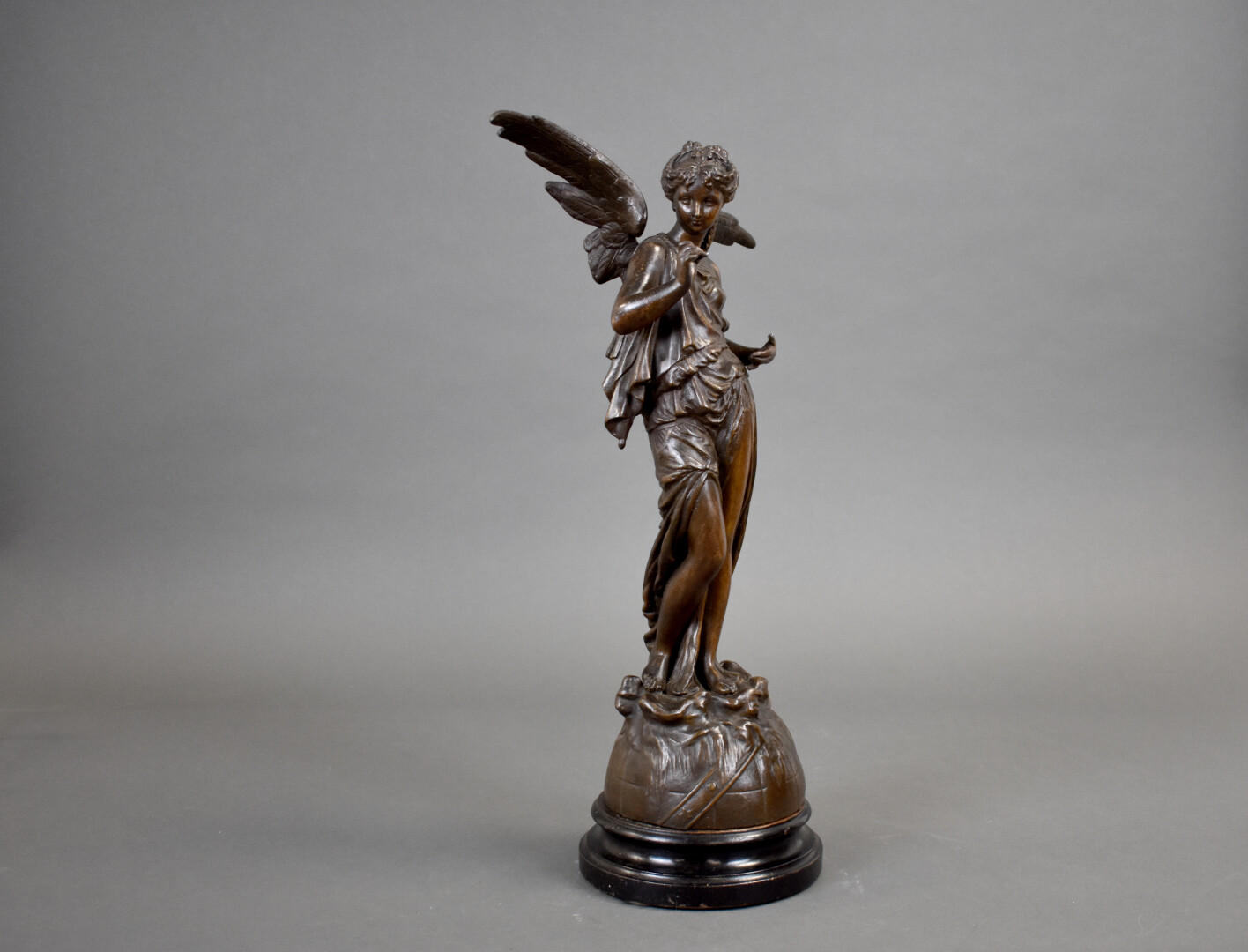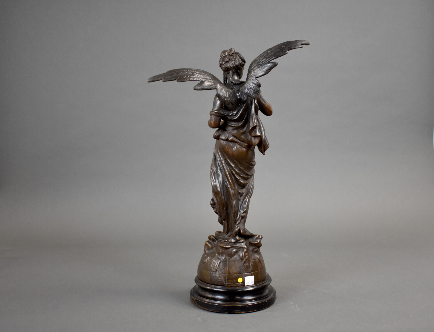 Figure en régule patiné brun représentant une victoire dominant un globe terrestre (manque la trompette). Socle de bois noirci. Fin du XIXe siècle. Haut. : 51 cm.