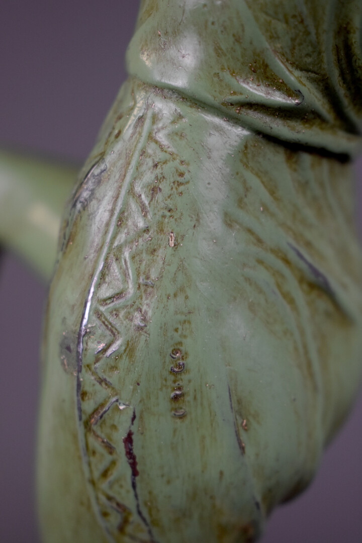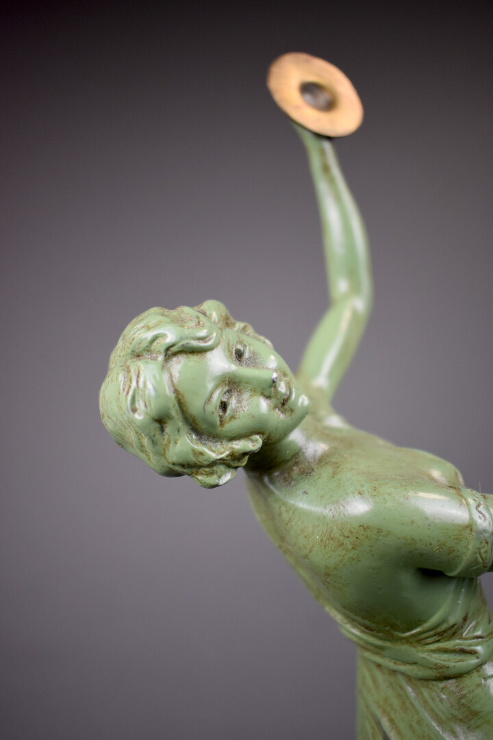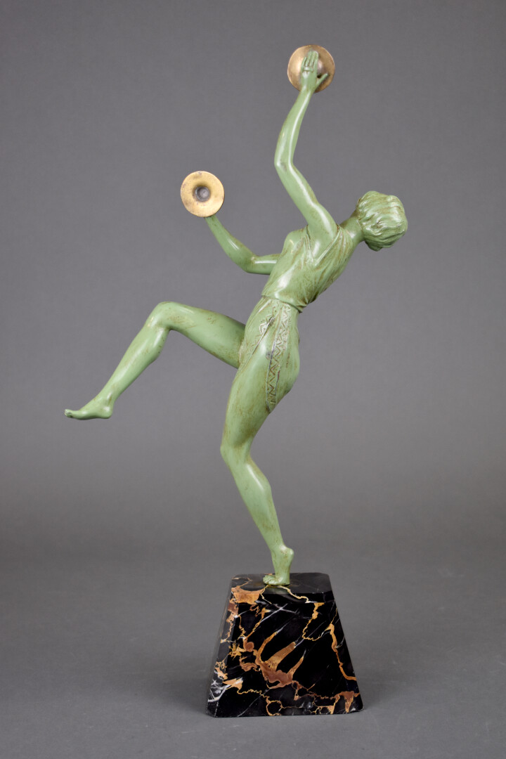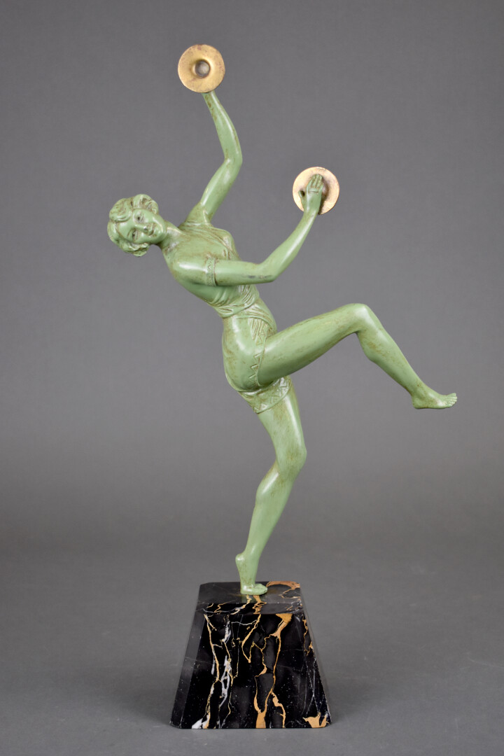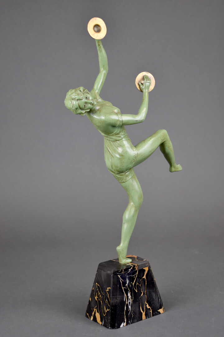 Figure en régule repatiné vert représentant une danseuse avec des cymbales. Socle de marbre portor. Signé Gregoire. Vers 1930/1940. Haut. : 49 cm.