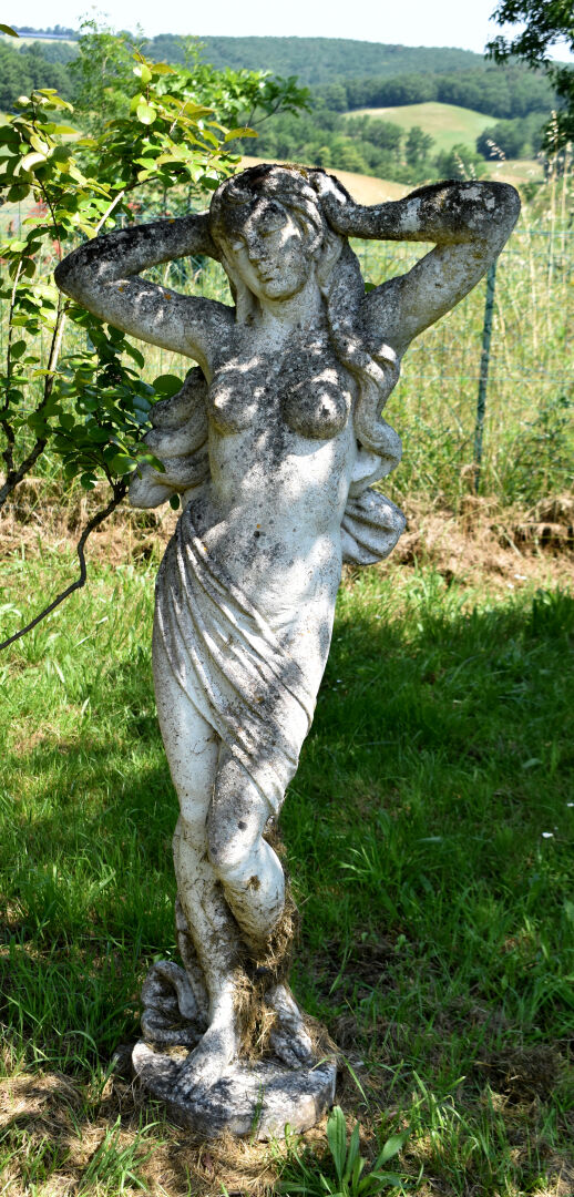 Figure féminine au drapé, les bras levés, en pierre reconstituée. Haut.: 152 cm.