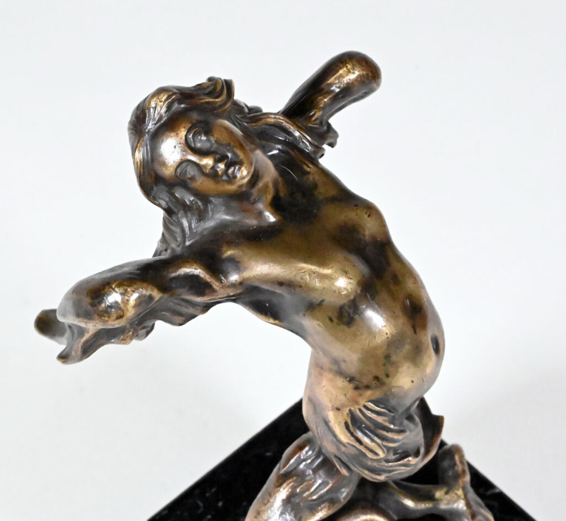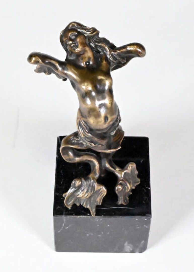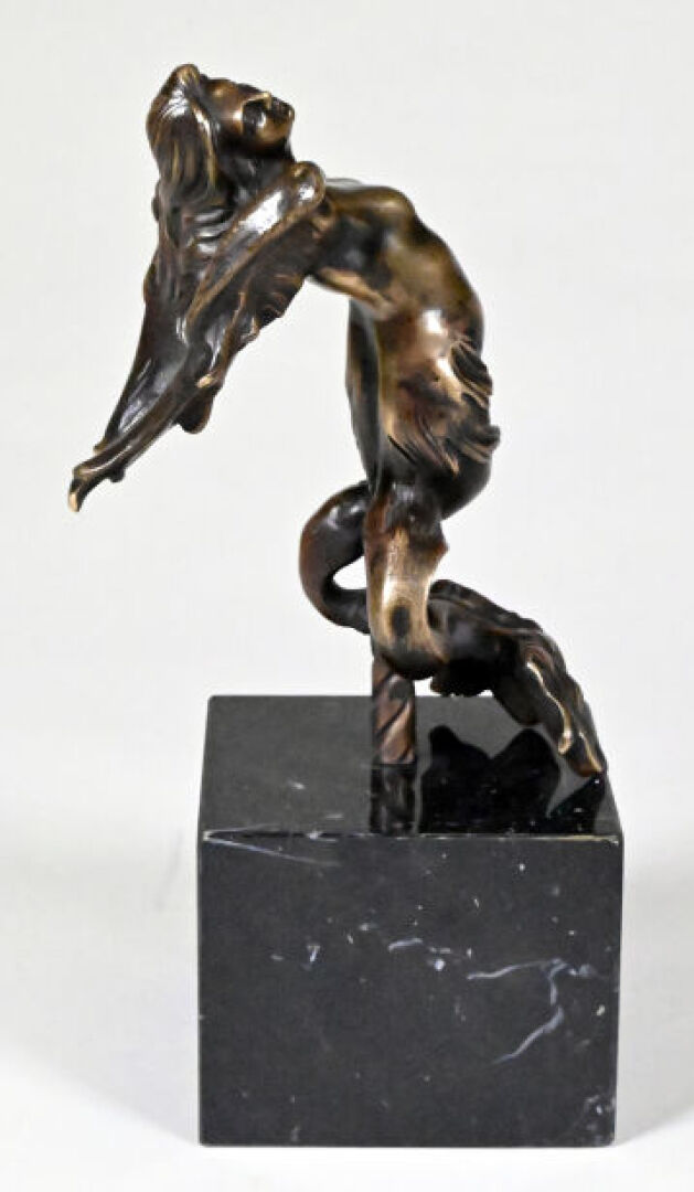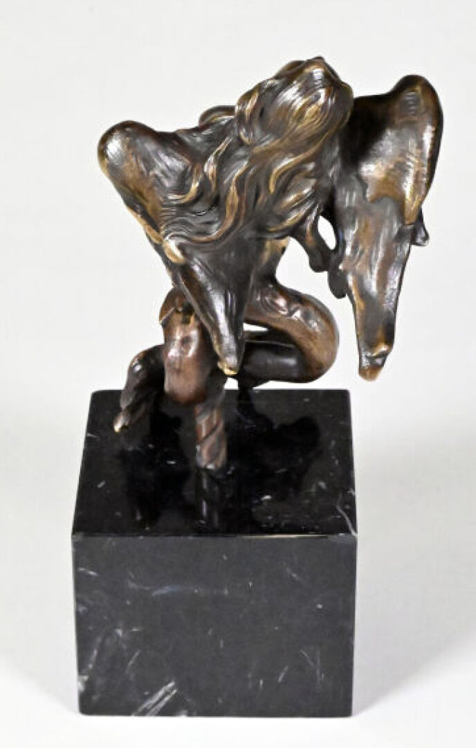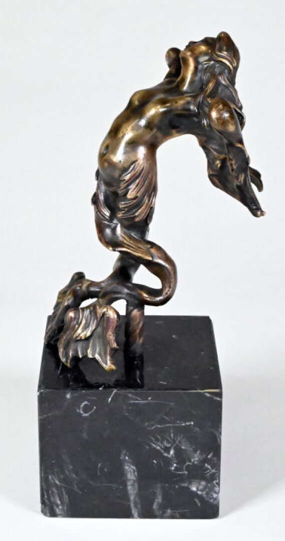 Figure surréaliste de sirène à deux queues en bronze patiné brun. Socle de marbre noir. XXe siècle. Haut. : 25,5 cm.