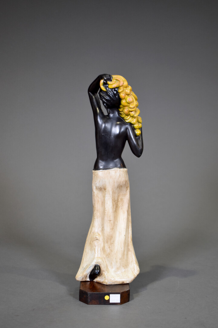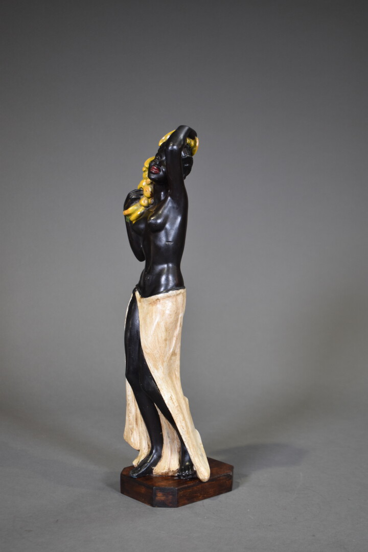 Figurine en plâtre représentant une nubienne tenant un régime de banane (frottements). Socle en bois. XXe siècle. Haut. : 45,5 cm.