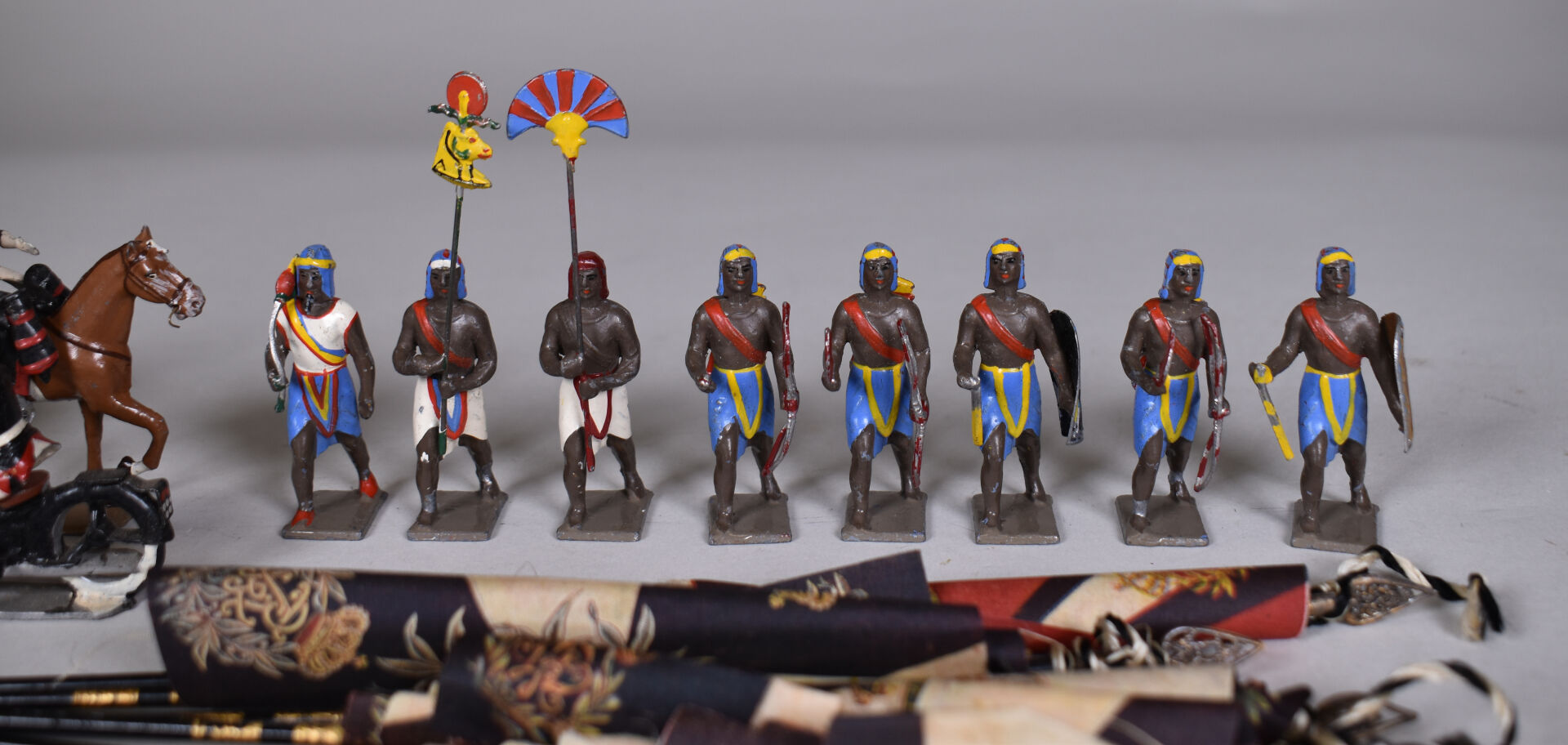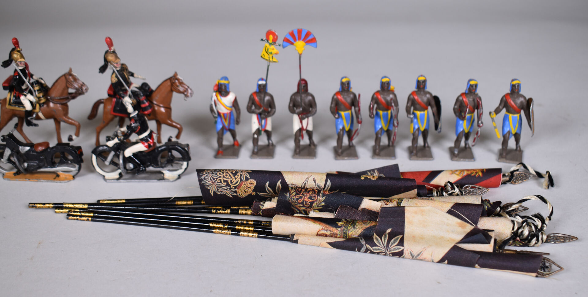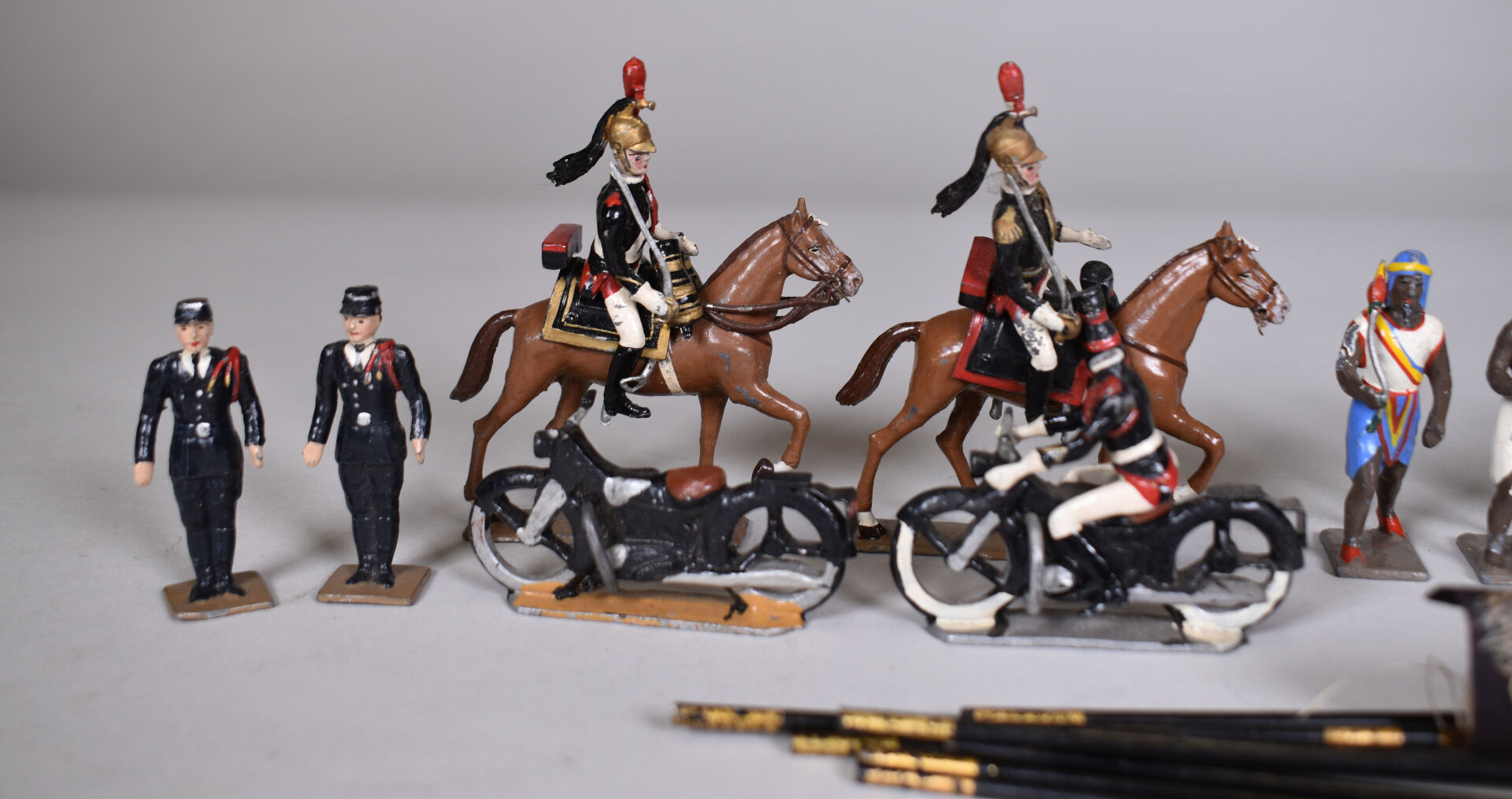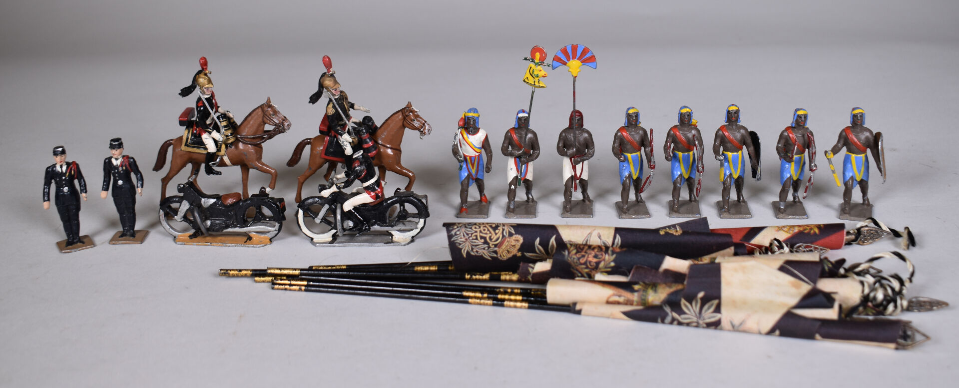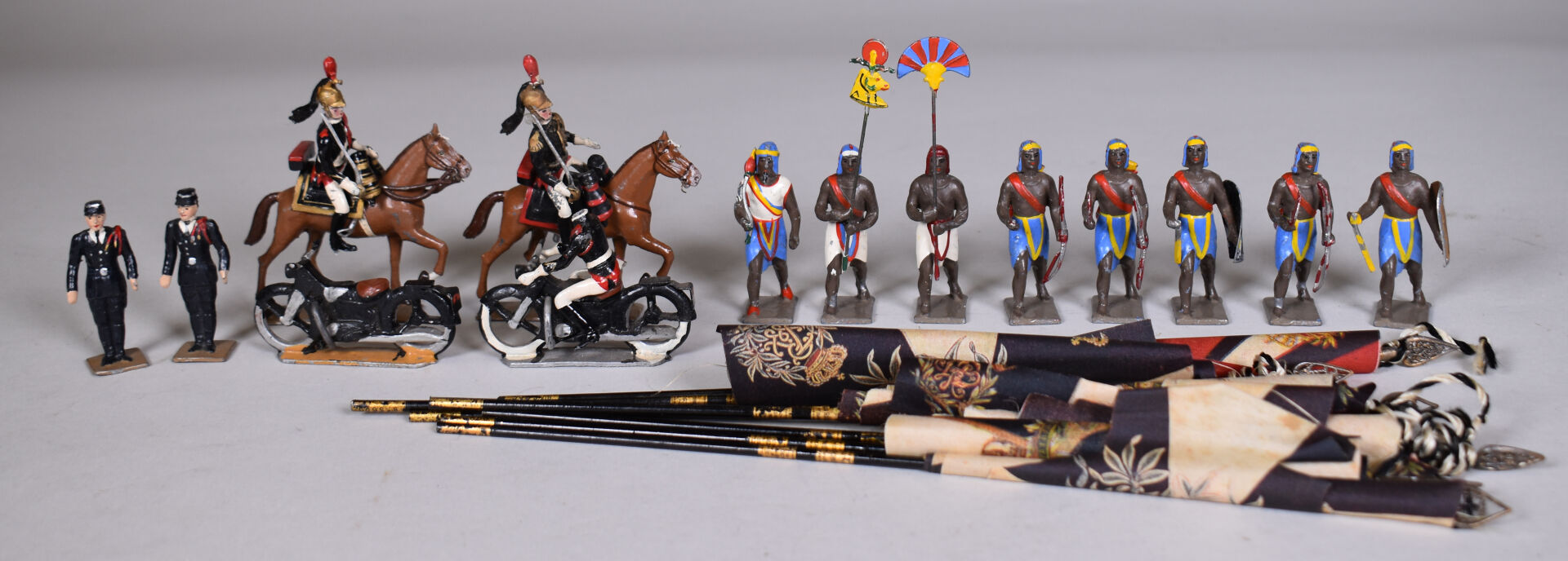 Figurines de plombs comprenant : CBG garde égyptienne, 2 cavaliers , 2 gendarmes, 2 motos aluminium et un lot d’étendards métal et soie (fusée. Le tout en l’état.