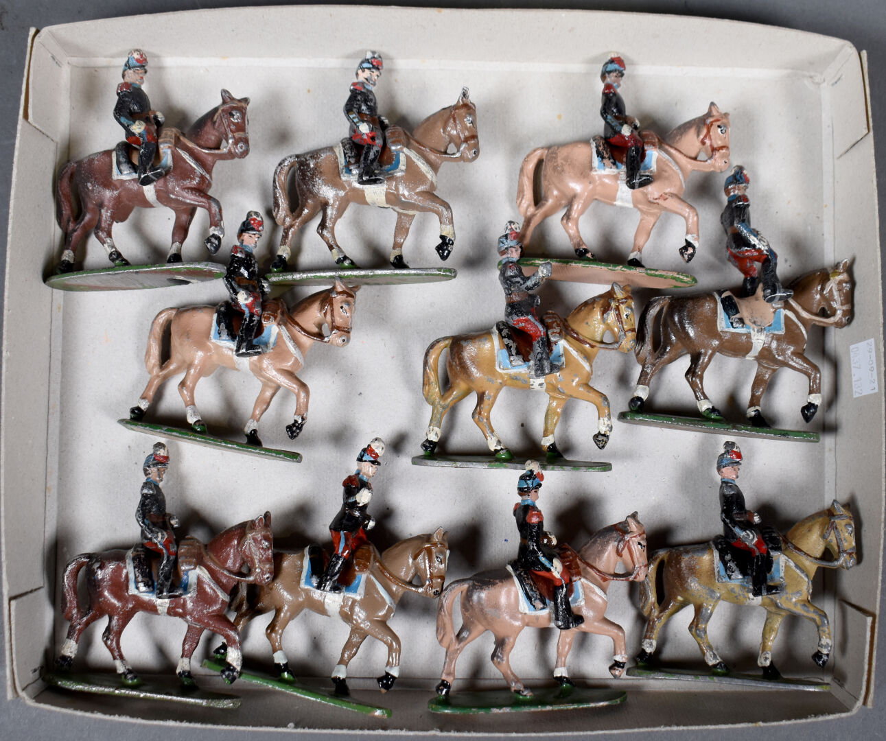 Figurines en aluminium Quiralu pour la plupart, cavaliers de Saint-Cyr en état d’usage dont porte-drapeaux sans drapeau. 10 pièces.
