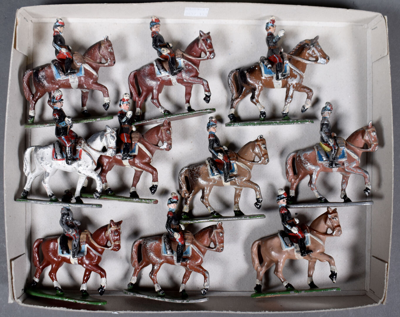 Figurines en aluminium Quiralu pour la plupart, cavaliers de Saint-Cyr en état d’usage dont porte-drapeaux sans drapeau. 10 pièces.